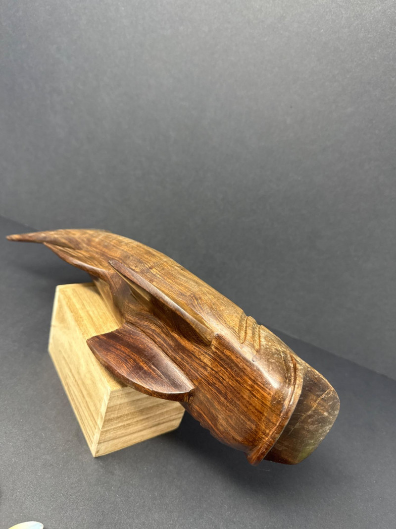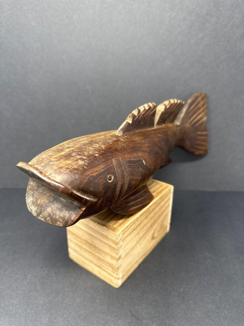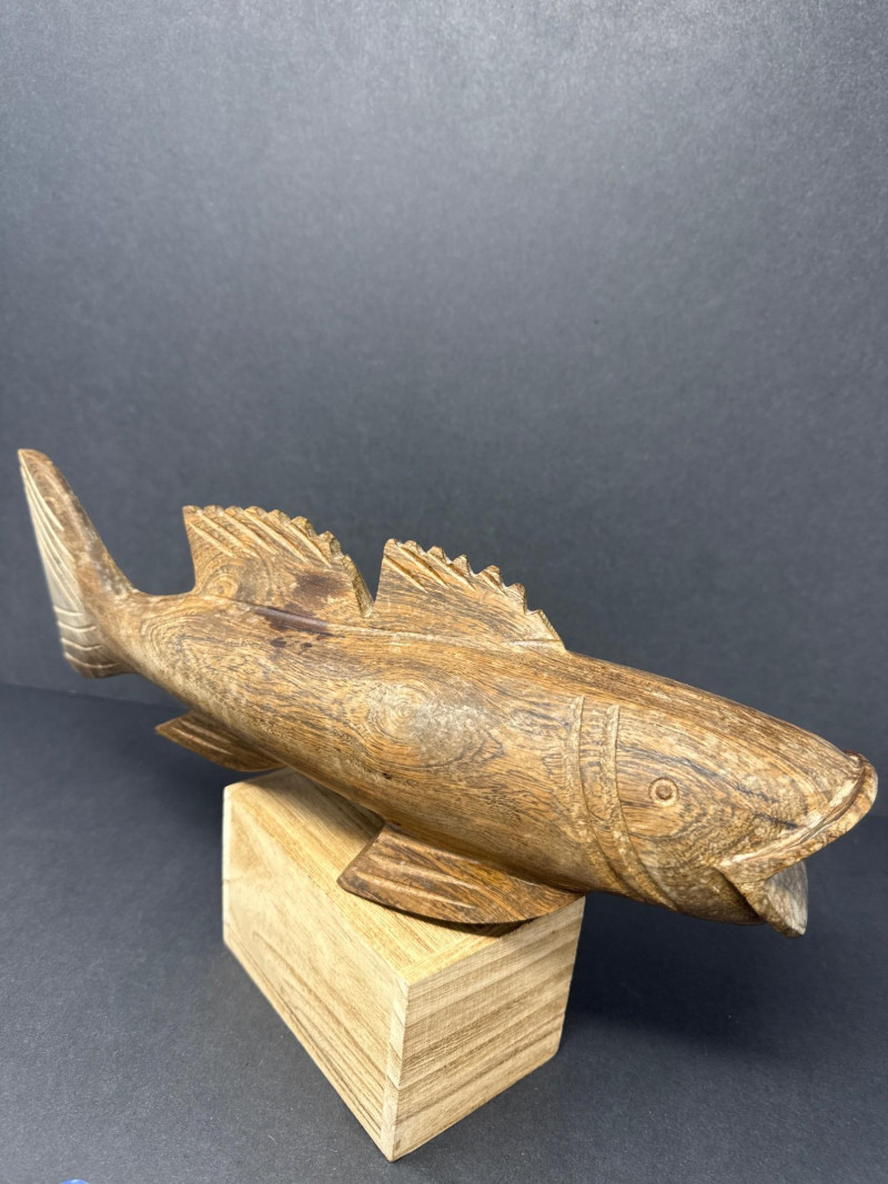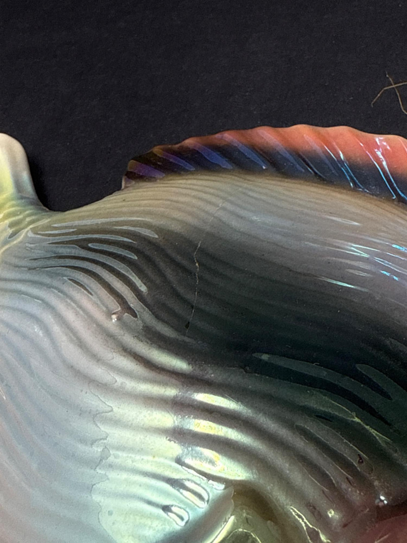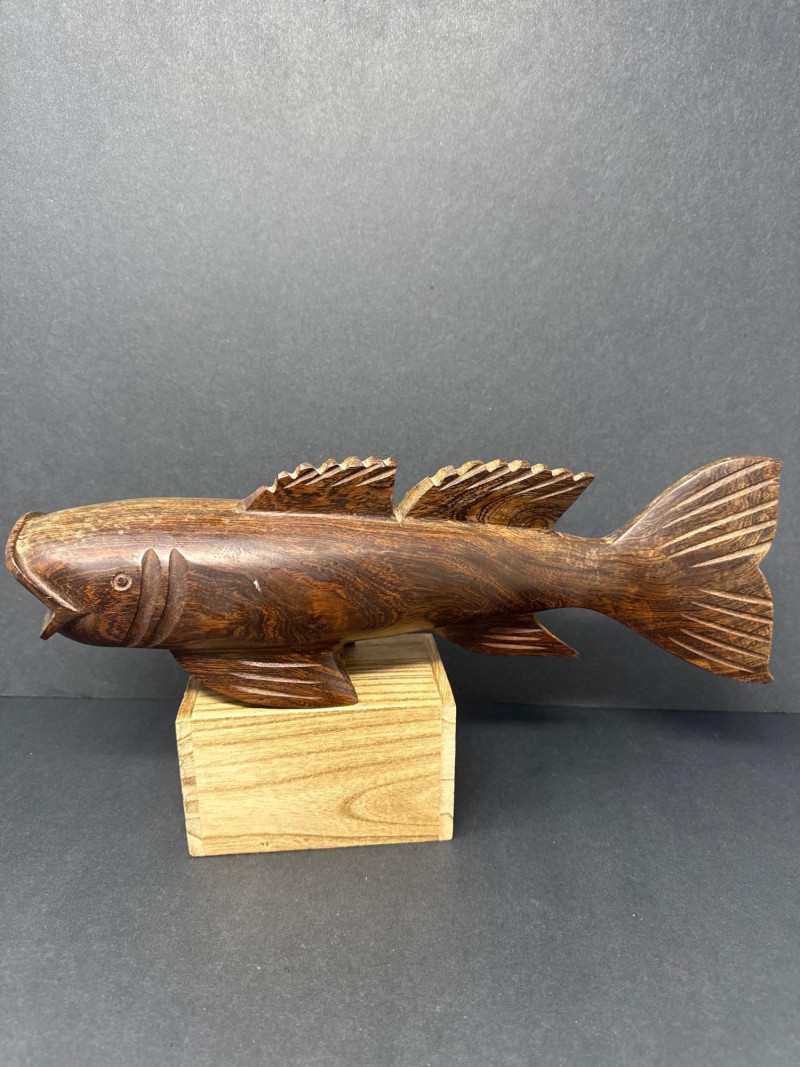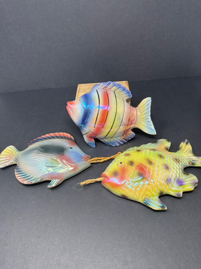Mid-Century Style Fish Decor: Ironwood Carving & Colorful Ceramic The collection includes one heavy, dark ironwood carved fish and three iridescent ceramic fish. The ceramic fish are brightly colored with a glossy finish. The carved ironwood fish measures approximately 14 inches long by 5.5 inches wide. The ceramic fish each measure approximately 8.5 inches long by 5.5 inches wide. Please note that one of the ceramic fish has a fracture on the top surface that appears more like a scratch and does not go through the piece. These figurines are suitable for adding a coastal or nature-inspired accent to any room.