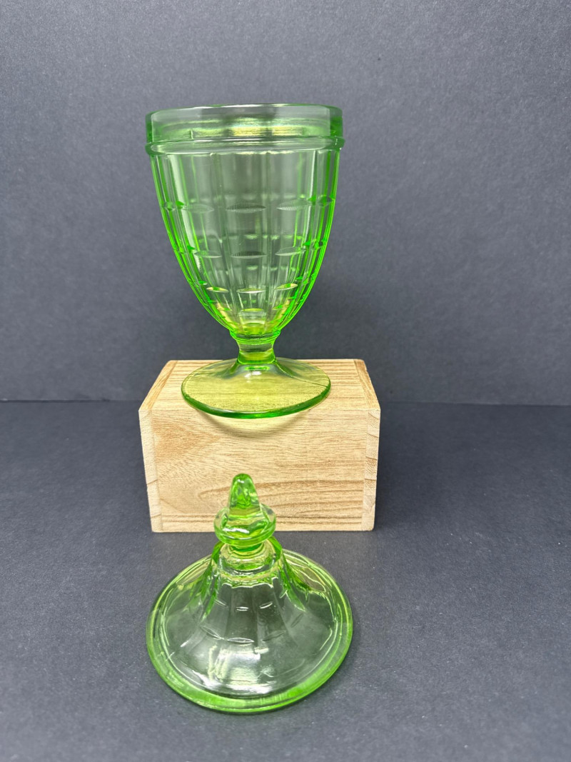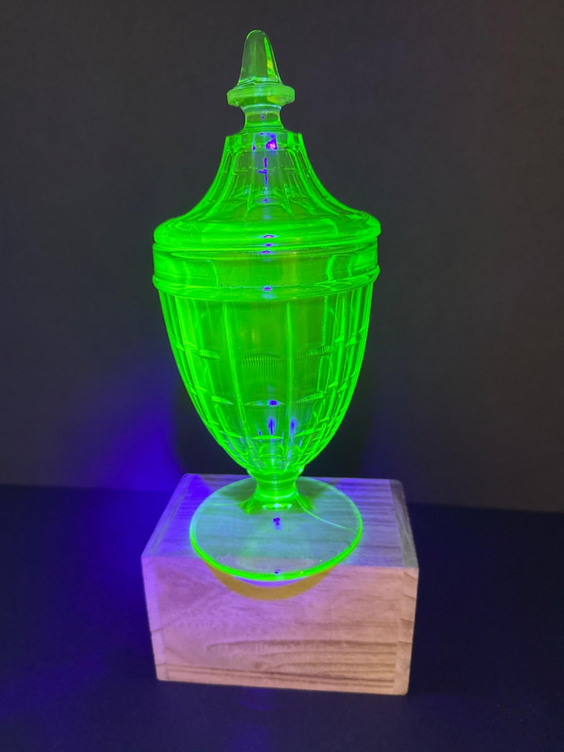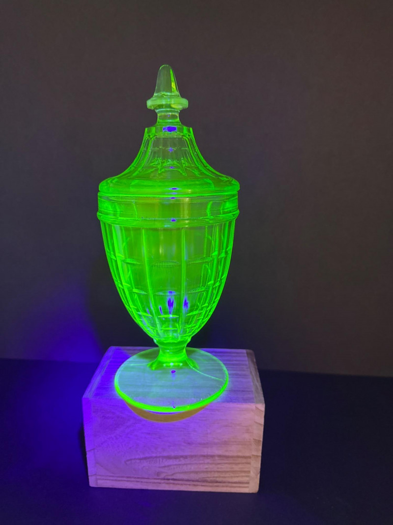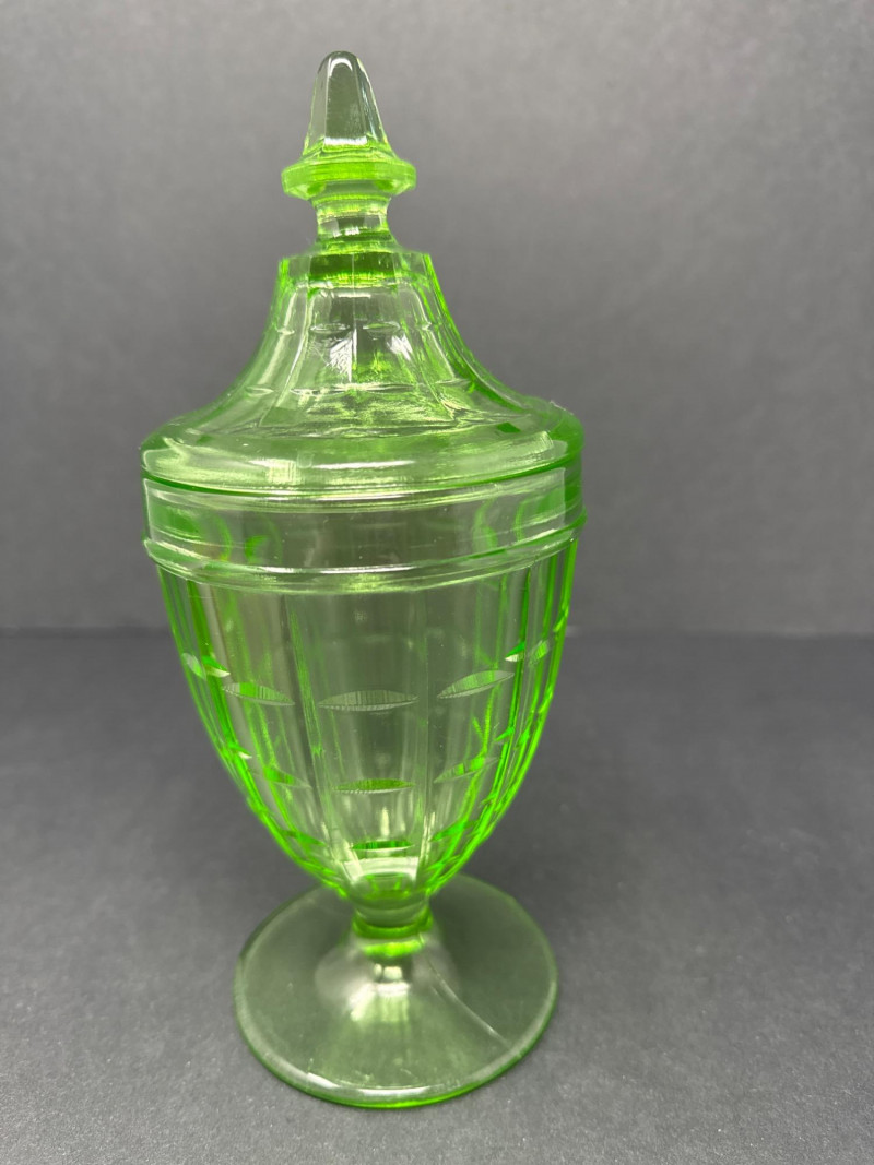 Vintage Uranium Vaseline Glass Lidded Candy Dish 9"T This auction is for a vintage uranium (also known as vaseline) glass lidded candy dish. This piece exhibits the characteristic vibrant green glow under UV blacklight, indicating the presence of uranium in the glass. The dish features a faceted design with a pointed finial on the lid. The candy dish measures approximately 9 inches tall by 3.5 inches wide. It is suitable for collectors of uranium glass, or as a unique decorative item that offers a glowing display under specific lighting conditions.