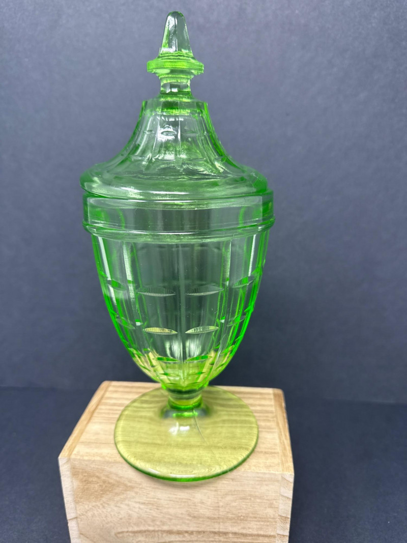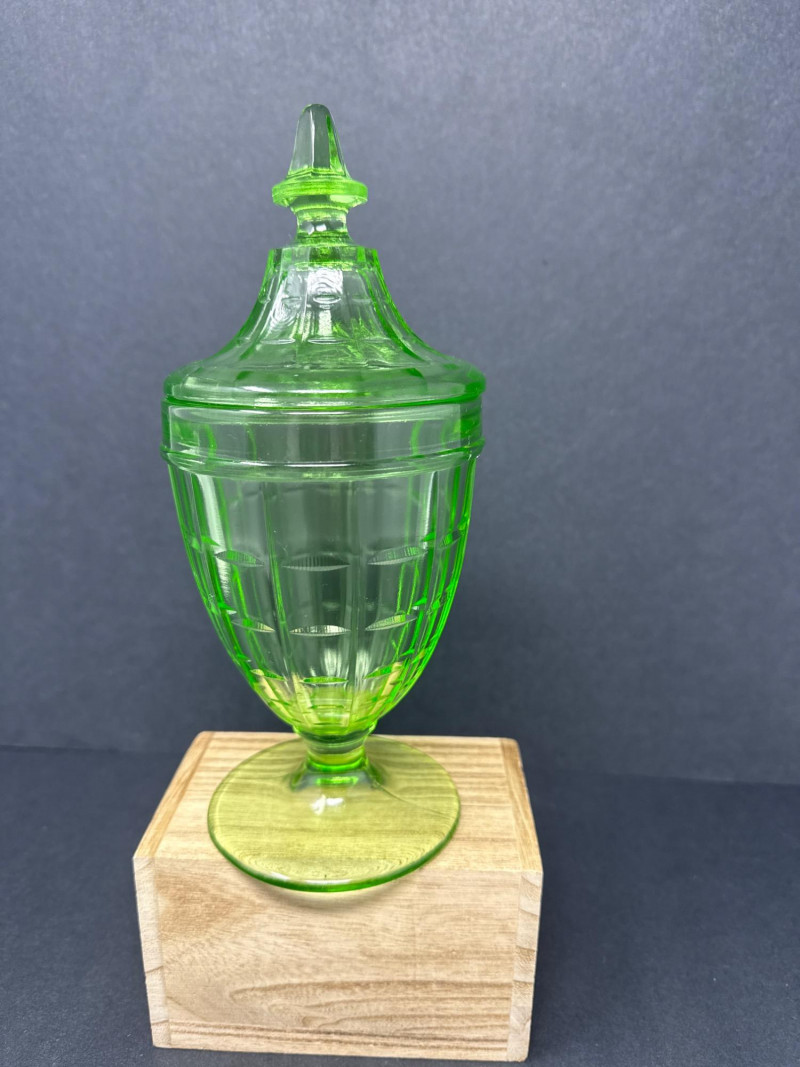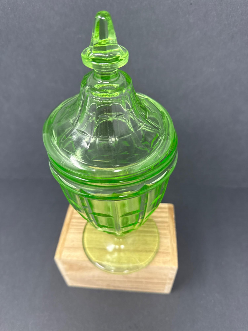 Lot # 114 - Vintage Uranium Vaseline Glass Lidded Candy Dish 9"T
