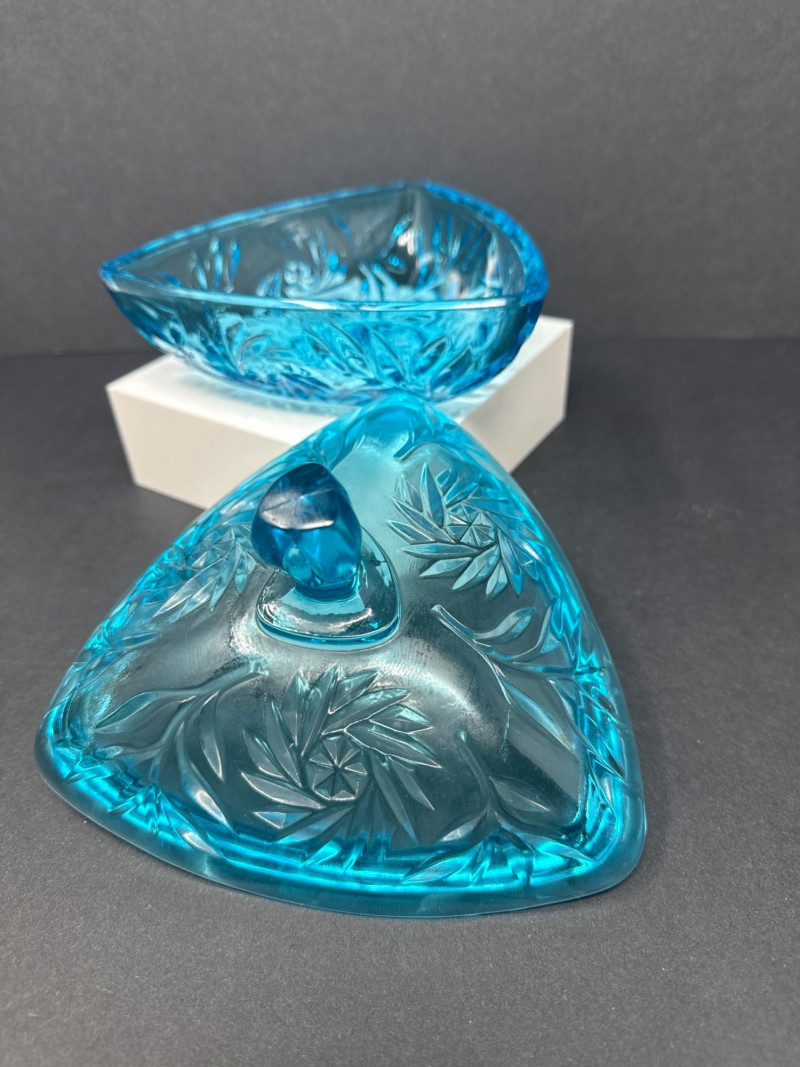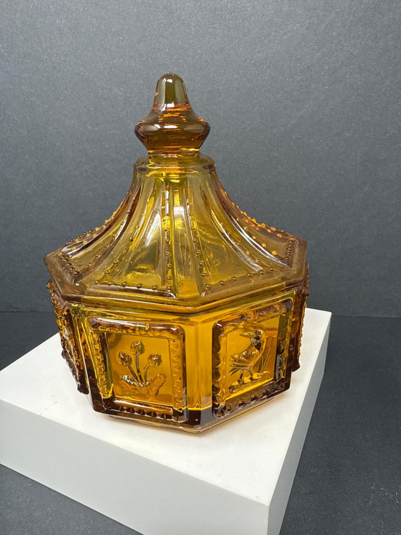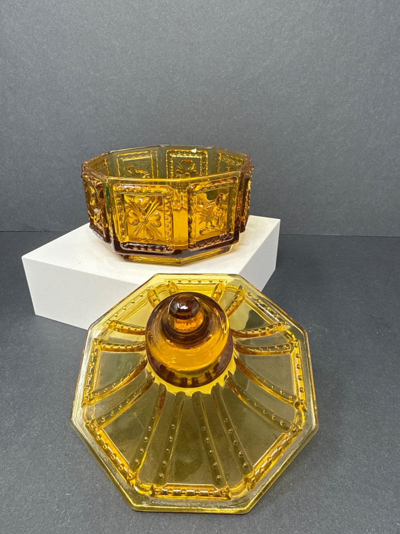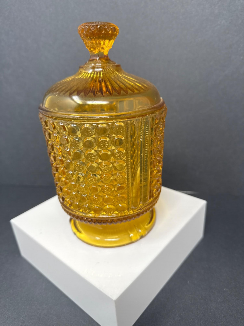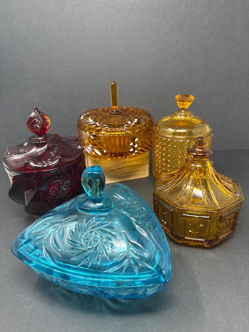 This lot includes five vintage covered glass dishes in assorted colors and molded patterns. The dishes range in height from approximately 2½″ to 7½″ and are ideal for display or holding small items. Assorted Colors & Patterns: One ruby-red dish (floral motif), one light-topaz dish (hobnail pattern), one amber-topaz dish (starburst and spiral design), one bright blue triangular dish (starburst and leaf pattern), and one deep amber octagonal dish (panelled floral/animal scenes). Size Range: Tallest dish measures 7½″ H; shortest is 2½″ H × 5½″ W. Widths generally range from 5″ to 6″. Covered Style: Each dish has a matching lid with a decorative glass finial. Condition: All dishes show light surface wear consistent with age. One amber-topaz dish has a small hairline crack at its base (pictured). No other chips or cracks noted. Sold As-Is: Ideal for collectors or decorative use.