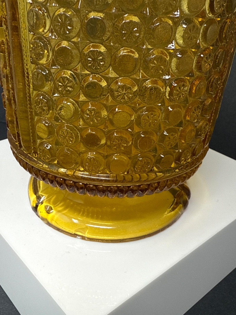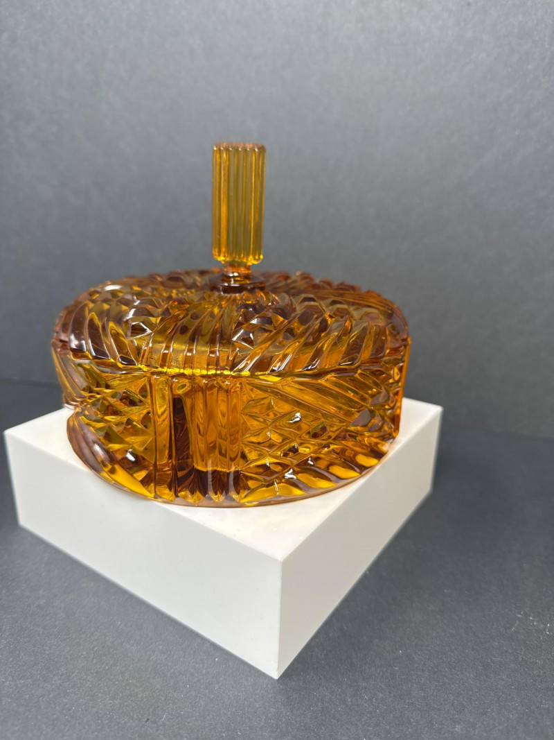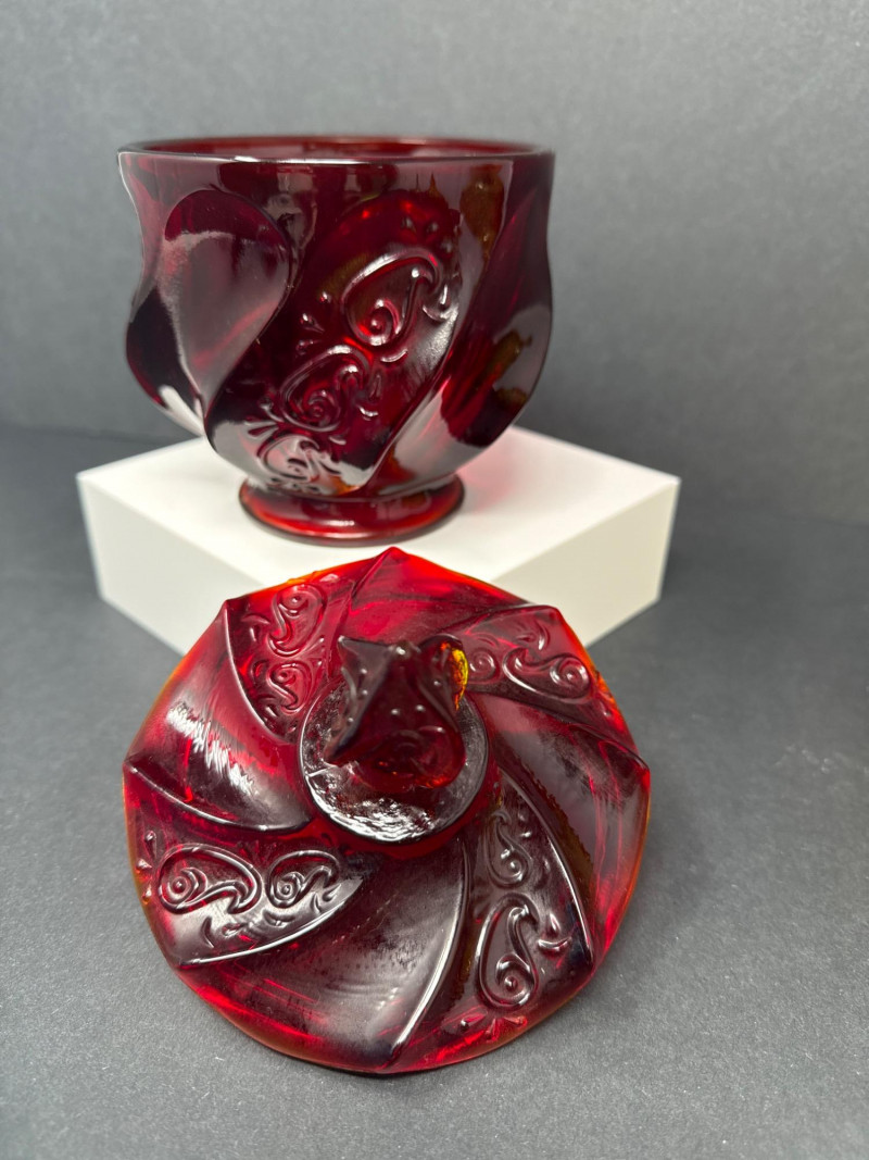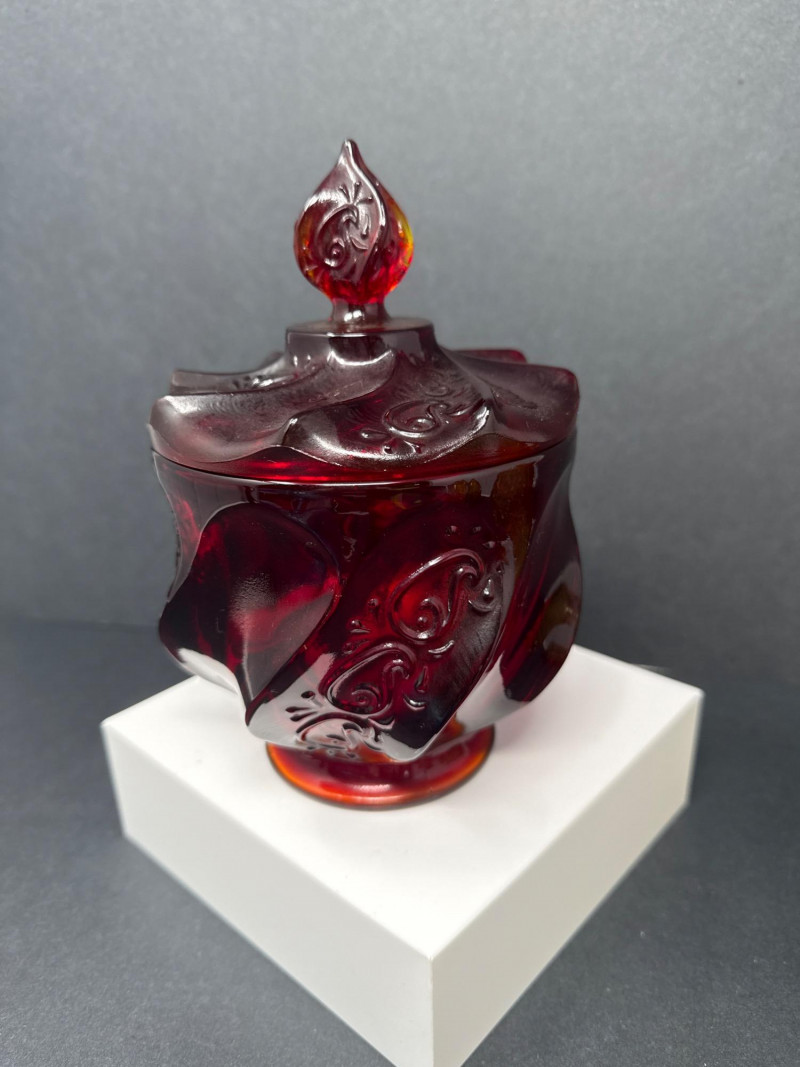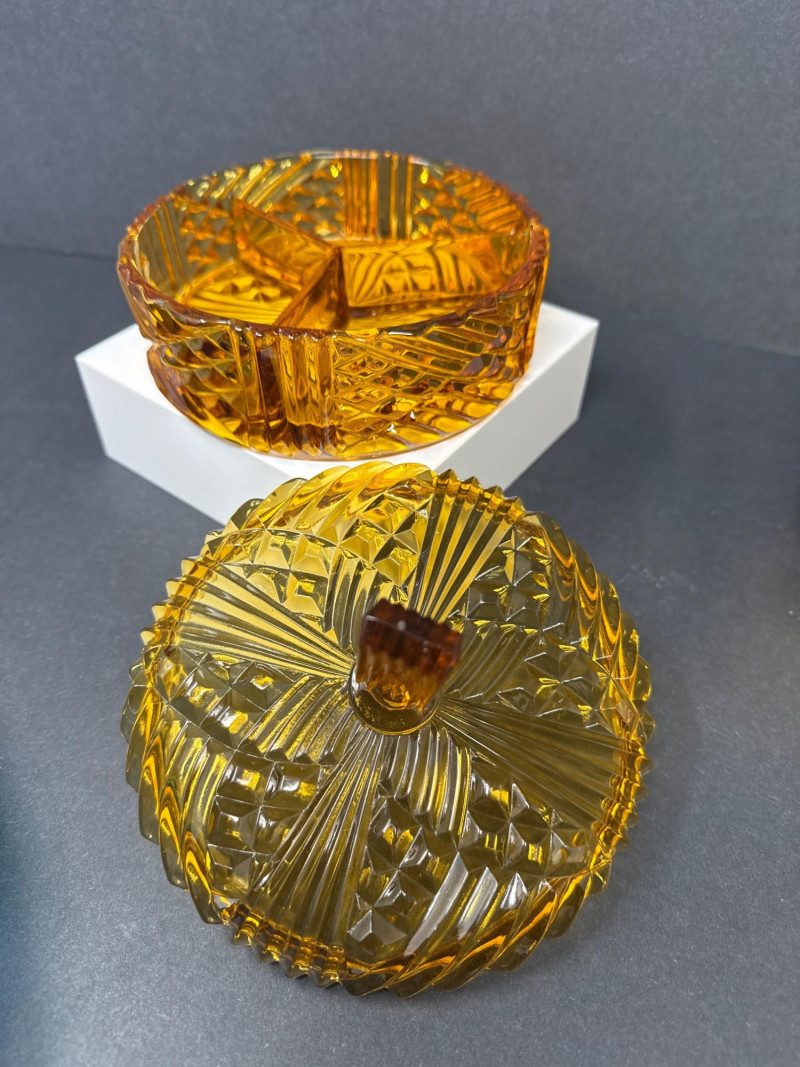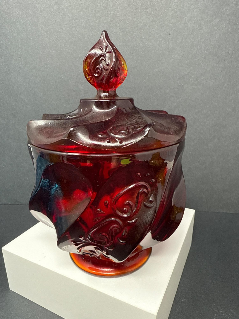 This lot includes five vintage covered glass dishes in assorted colors and molded patterns. The dishes range in height from approximately 2½″ to 7½″ and are ideal for display or holding small items. Assorted Colors & Patterns: One ruby-red dish (floral motif), one light-topaz dish (hobnail pattern), one amber-topaz dish (starburst and spiral design), one bright blue triangular dish (starburst and leaf pattern), and one deep amber octagonal dish (panelled floral/animal scenes). Size Range: Tallest dish measures 7½″ H; shortest is 2½″ H × 5½″ W. Widths generally range from 5″ to 6″. Covered Style: Each dish has a matching lid with a decorative glass finial. Condition: All dishes show light surface wear consistent with age. One amber-topaz dish has a small hairline crack at its base (pictured). No other chips or cracks noted. Sold As-Is: Ideal for collectors or decorative use.