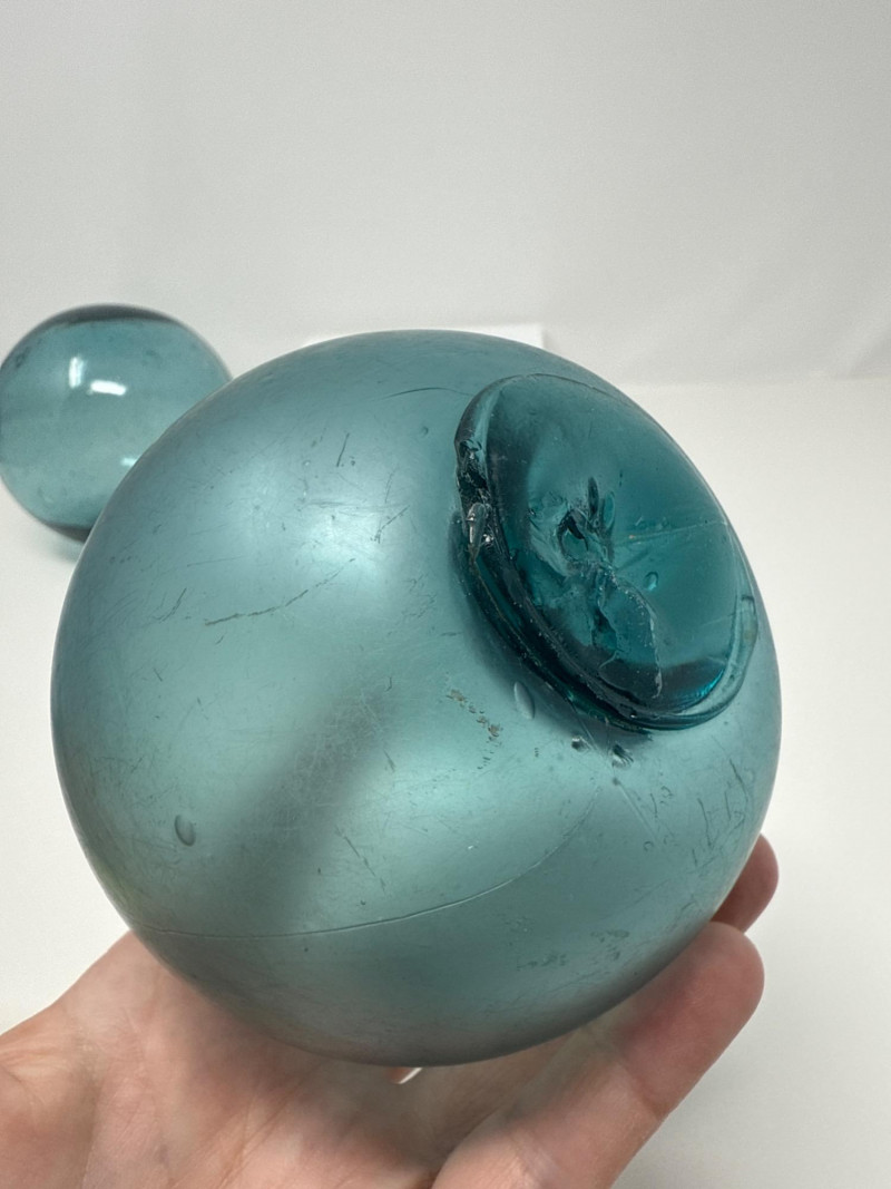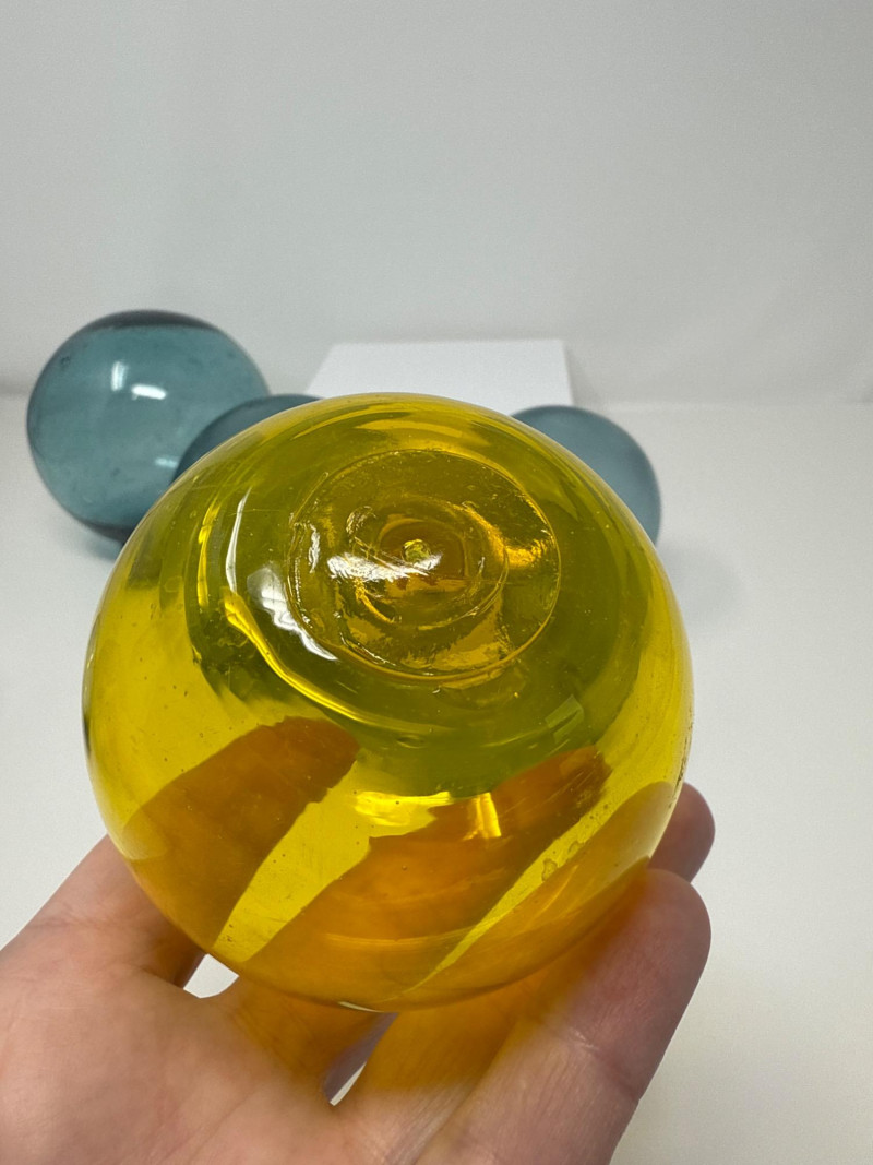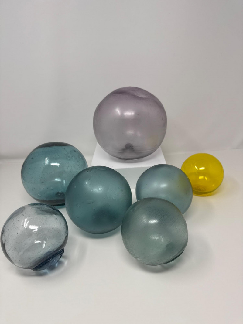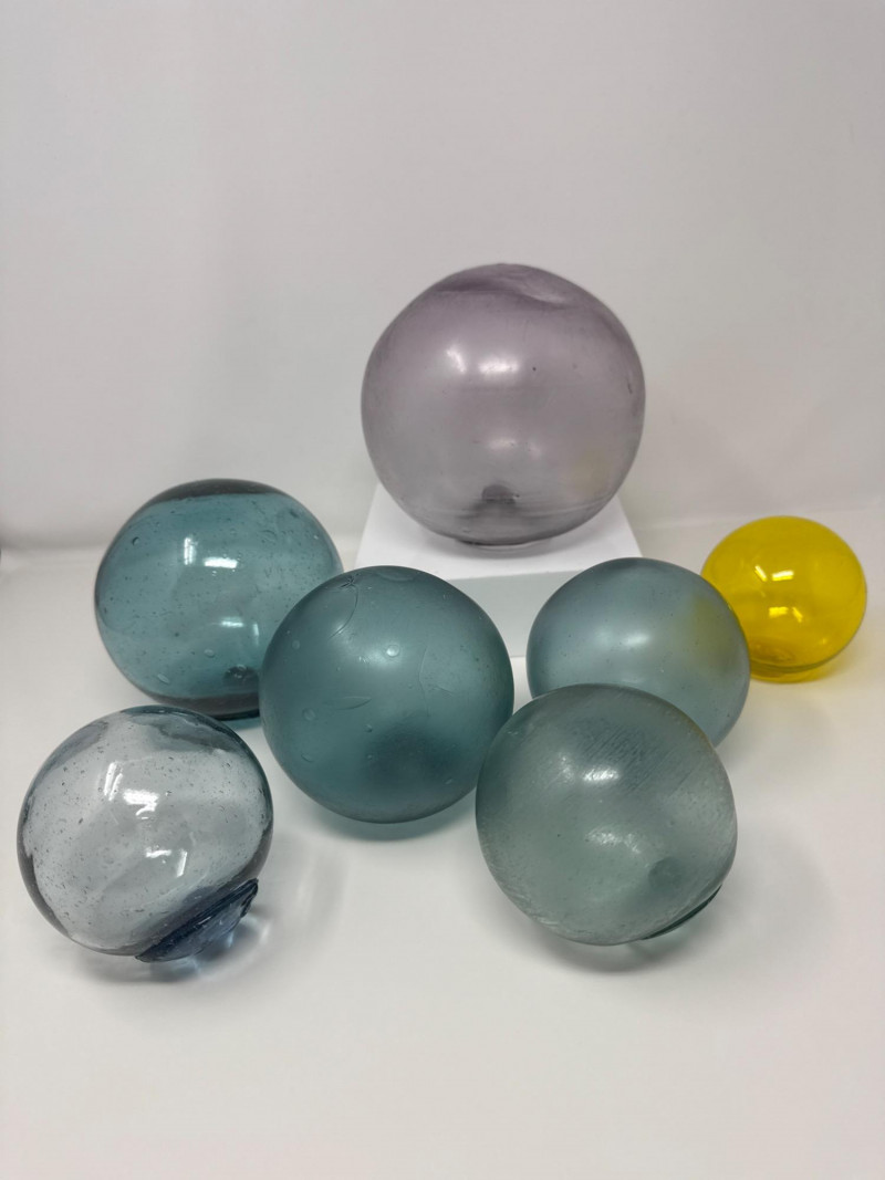 Lot of 7 Vintage Glass Fishing Floats, Assorted Colors - Set 2 7 vintage glass fishing floats, perfect for coastal decor or collecting. The collection includes various shades of blue, green, grey, and one yellow float, ranging in size from 2 inches to 6 inches.