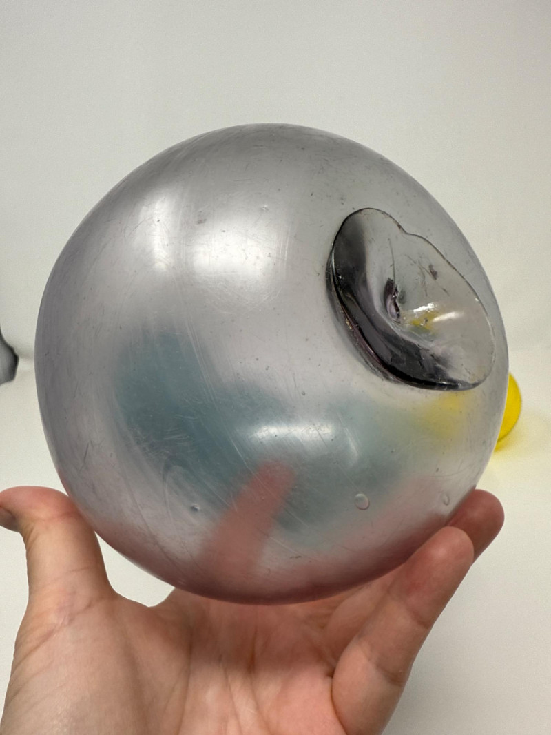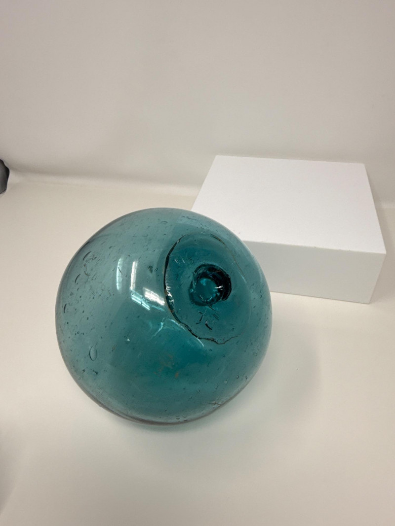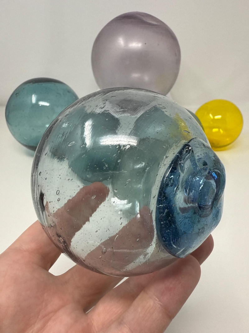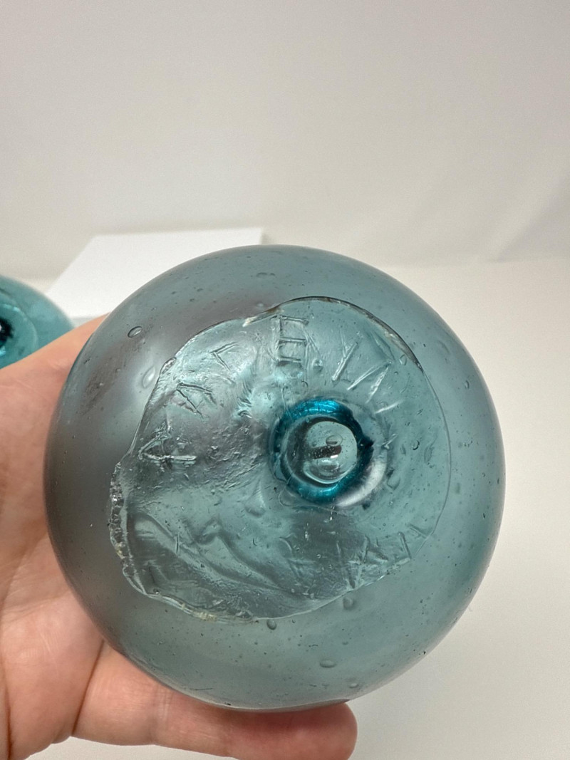 Lot of 7 Vintage Glass Fishing Floats, Assorted Colors - Set 2 7 vintage glass fishing floats, perfect for coastal decor or collecting. The collection includes various shades of blue, green, grey, and one yellow float, ranging in size from 2 inches to 6 inches.