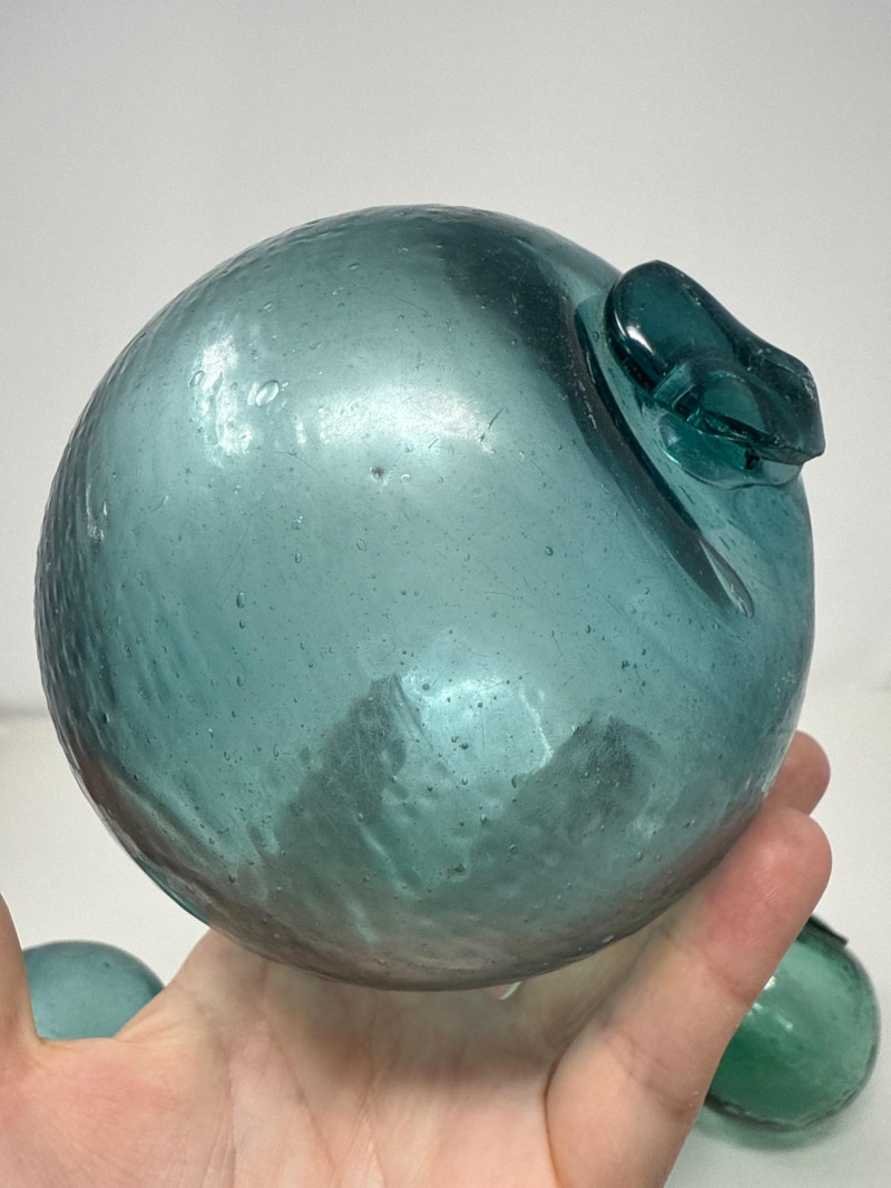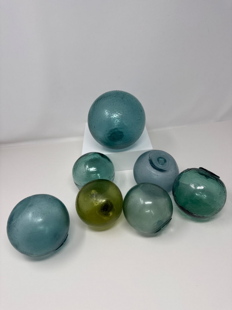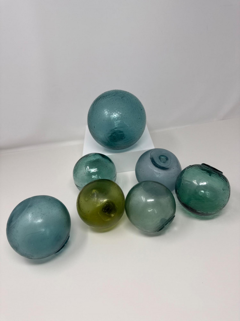 These seven hand-blown glass fishing floats feature various shades of aqua, green, and light blue. Each float has surface bubbles and wear consistent with age, making them ideal for nautical décor or collection.