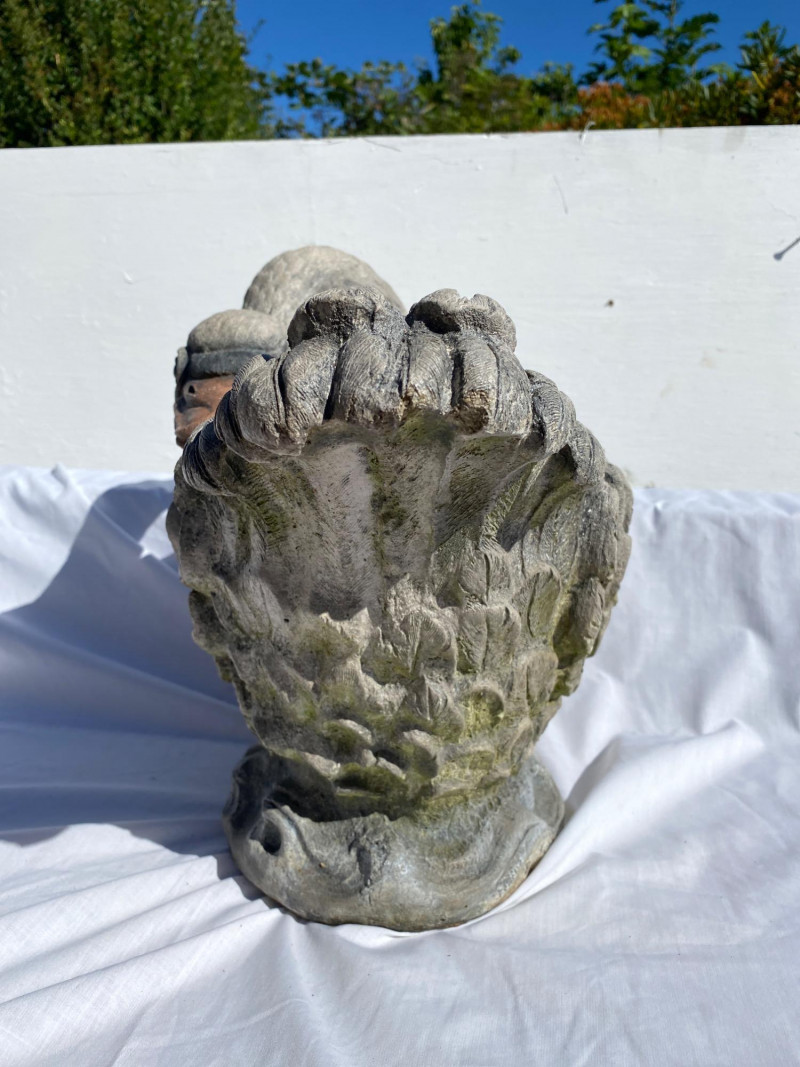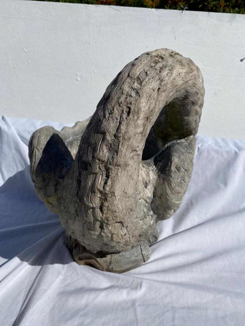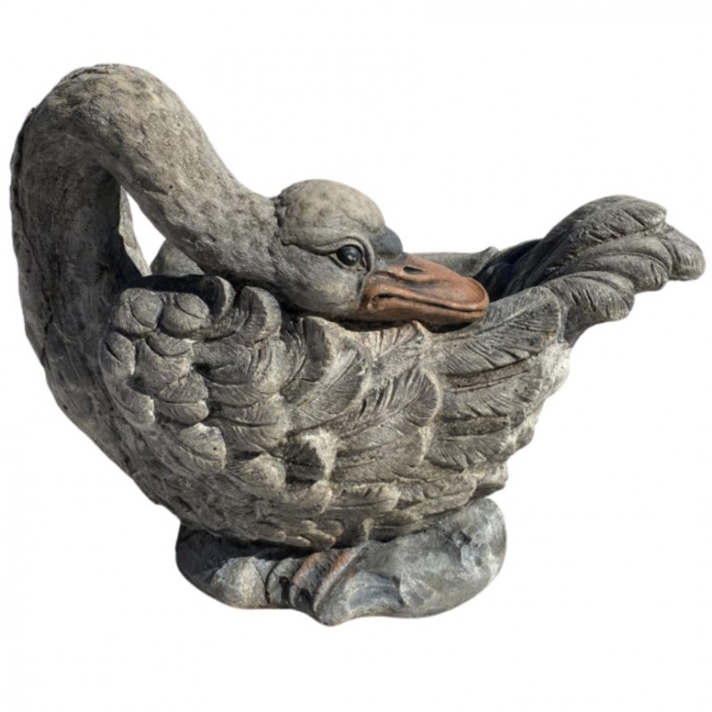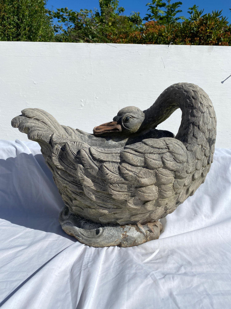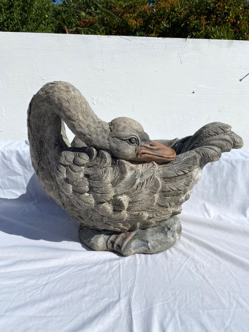 Heavy cement swan planter with graceful lines and timeless appeal. A standout piece for garden or patio display. Fabulous Cement Swan Planter – Signed This swan isn’t just fabulous—it’s heavy, signed, and ready to outshine your neighbor’s flamingo. With intricately carved feathers, a gracefully curved neck, and a beak that means business, this cement sculpture doubles as a planter and triples as a conversation starter. Material: Solid cement (aka: do not drop on foot) Dimensions: 18" L × 10" W × 14" H Weight: Somewhere between “hefty” and “hire a helper” Signature: Yes, the maker signed it—clearly proud of their swan-song masterpiece