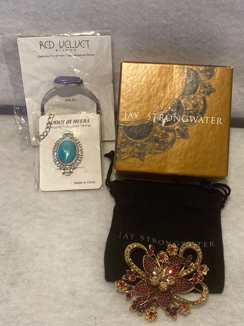 A curated selection of designer sparkle featuring Jay Strongwater’s signature craftsmanship and Bijoux’s bold flair. Includes brooches and statement pieces for collectors or fashion-forward stylists. Genuine Turquoise and Amythyst Stones. Scarf and red whistle is not included in this lot, just the jewlery.