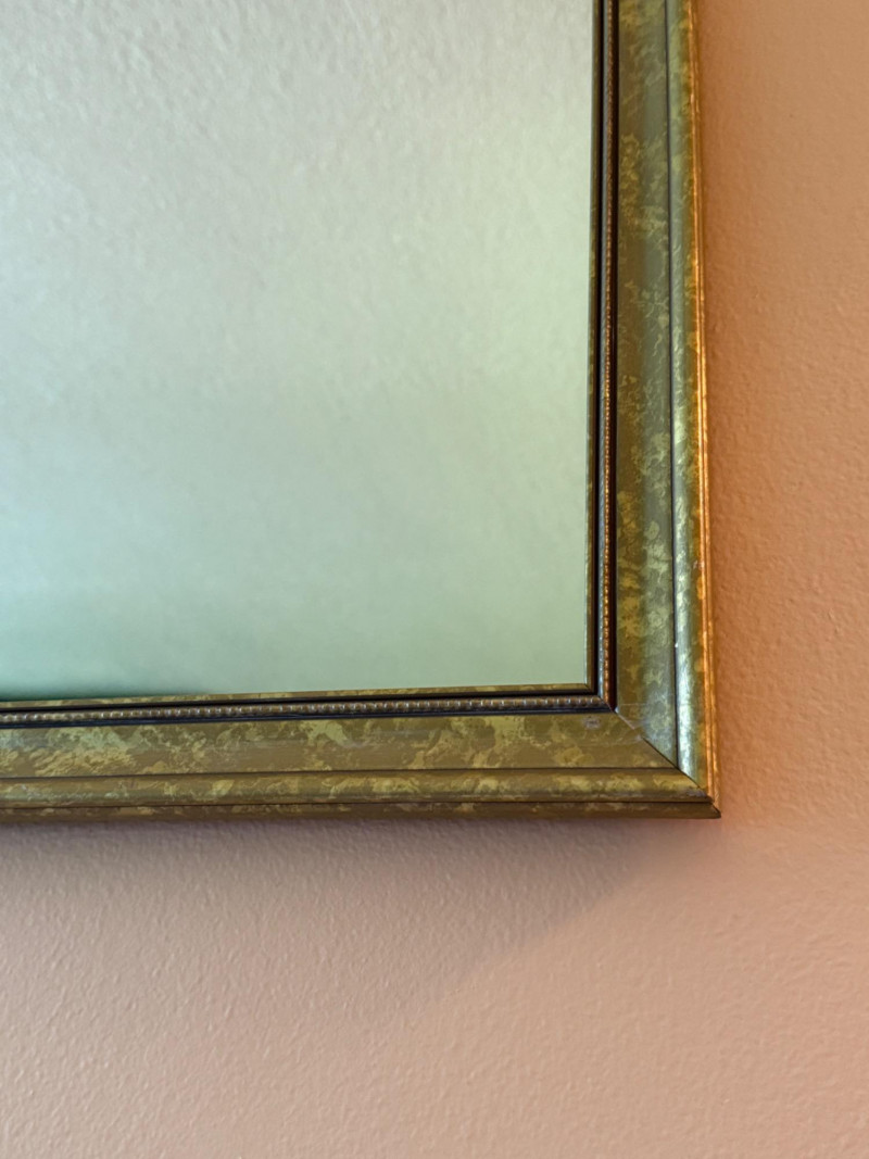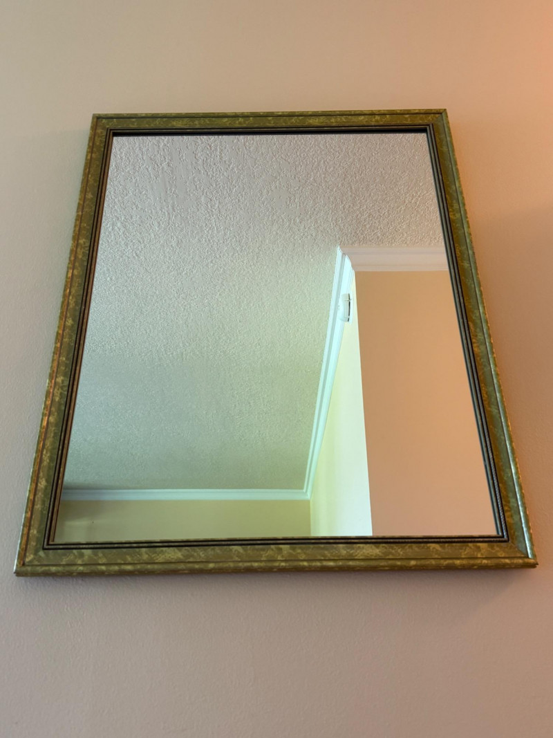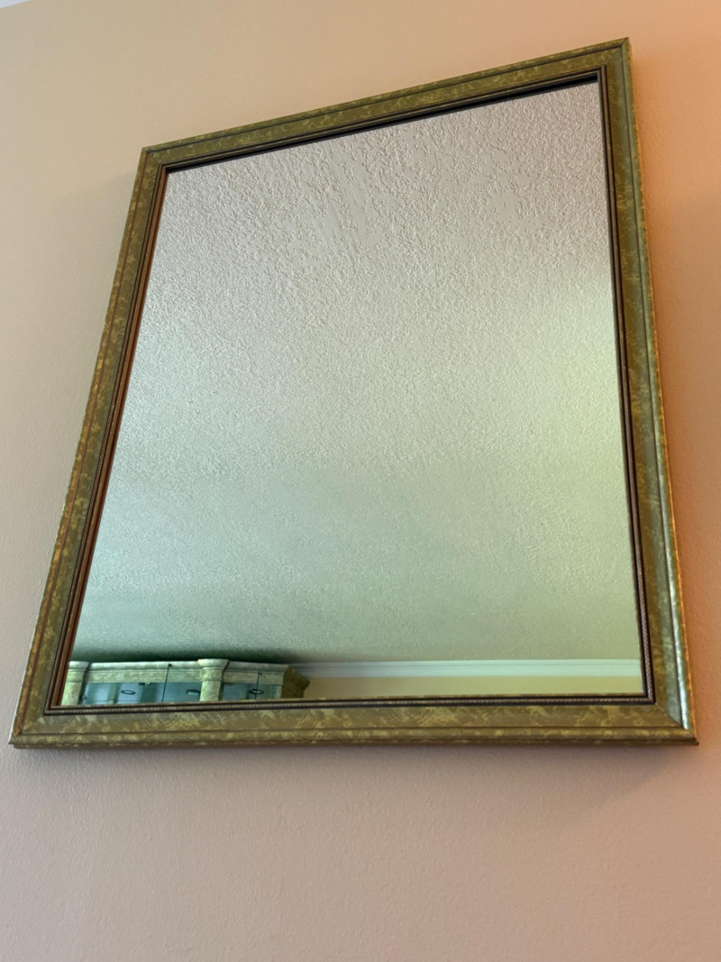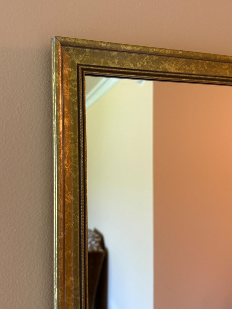 Refined rectangular mirror featuring a textured gold-toned frame with subtle metallic patina and classic inner trim detailing. This piece blends traditional charm with a touch of vintage elegance. Details: Style: Traditional / Transitional Frame Finish: Antiqued gold with textured surface Mirror Type: Flat glass with inner trim accent