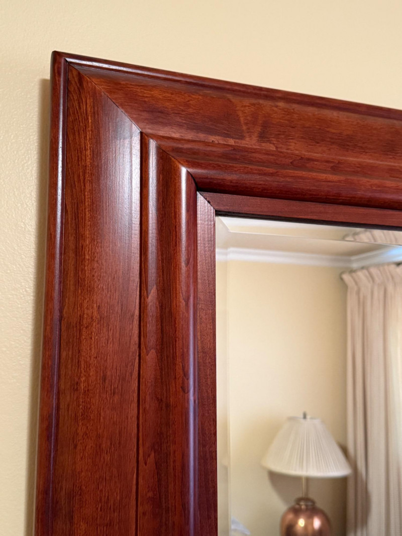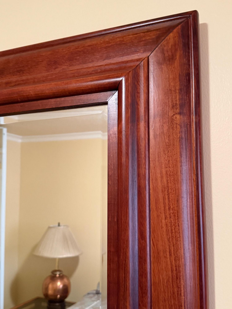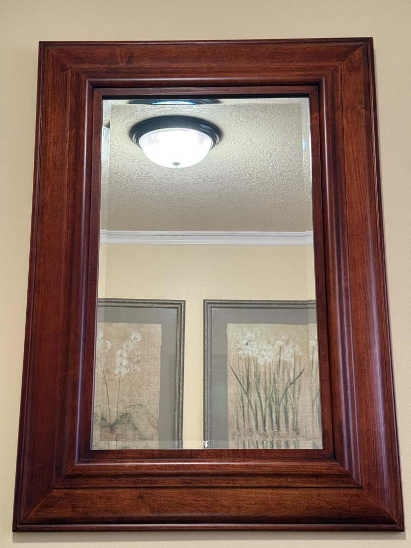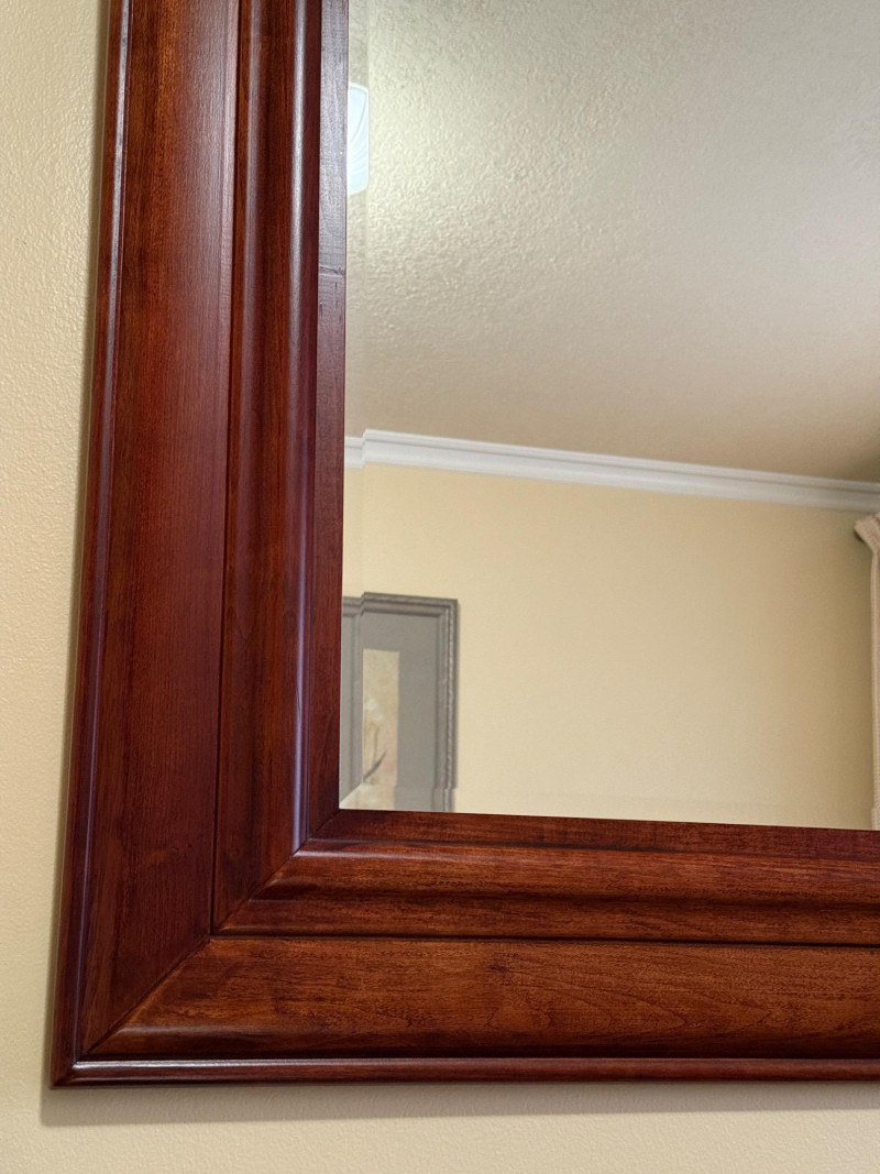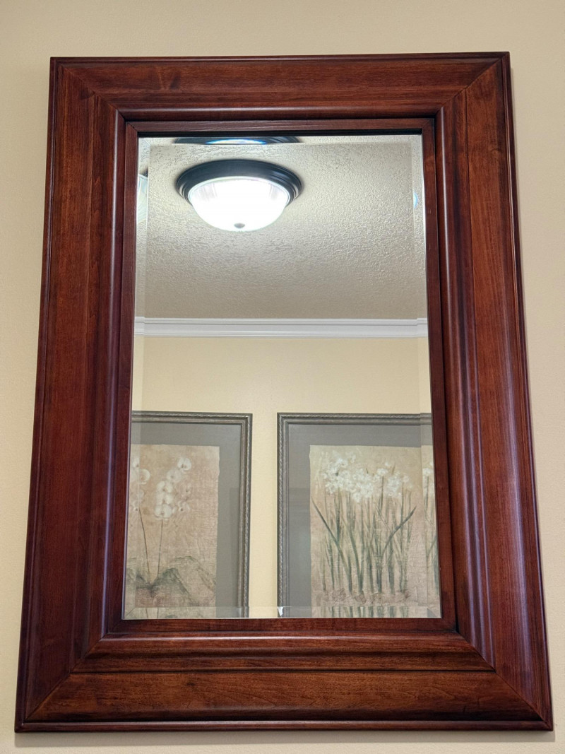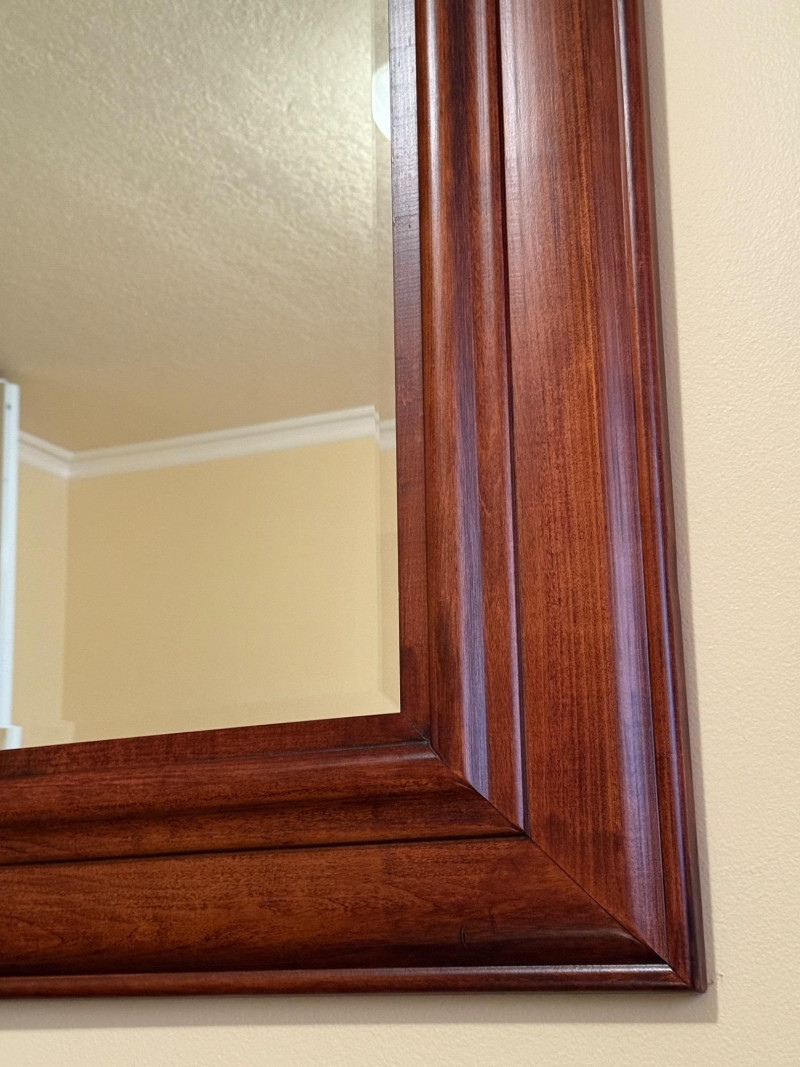 Pair of elegant rectangular wall mirror featuring a beautifully crafted solid wood frame in a rich, warm cherry or mahogany tone. The beveled mirror adds a touch of refinement, while the deep profile of the frame enhances its visual presence. Details: Overall Style: Transitional / Traditional Frame Material: Solid wood with a deep, warm stain