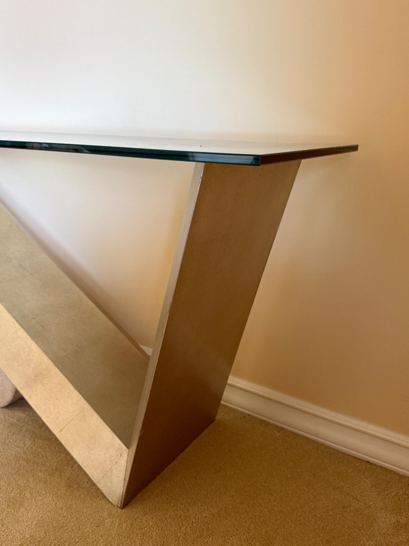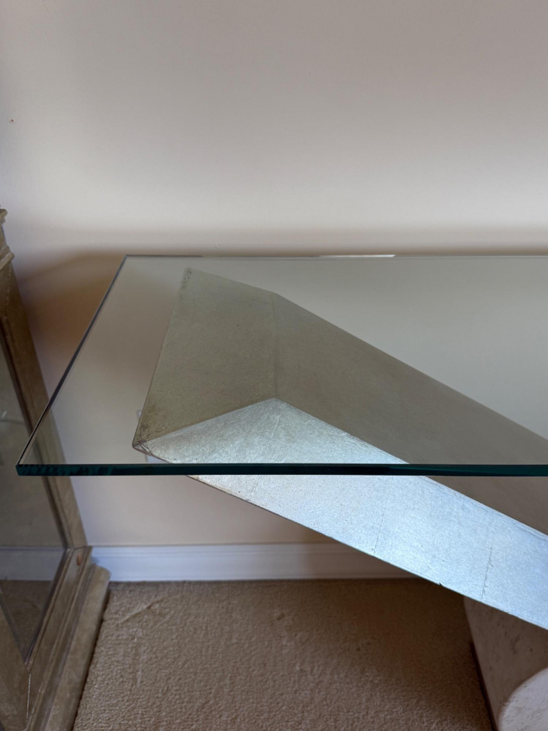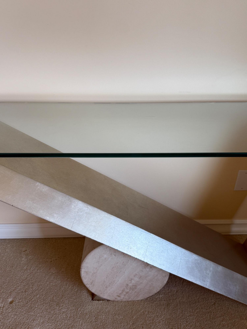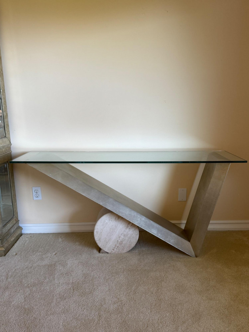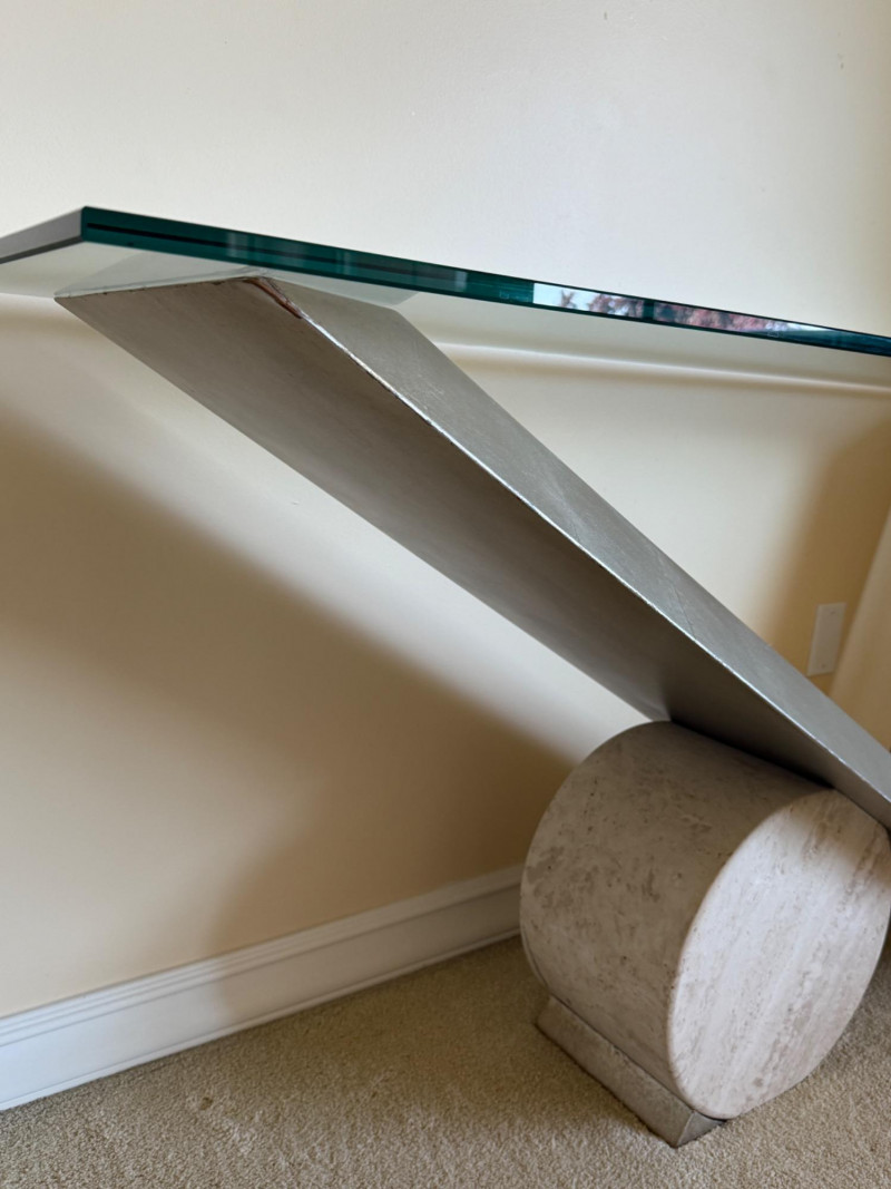 Striking postmodern console table featuring a unique architectural design. The table showcases a sleek V-shaped brushed metal base dramatically angled over a cylindrical travertine stone support, creating a bold sense of balance and tension. Details: Materials: Brushed metal, travertine stone, and clear glass Design Style: Postmodern / Contemporary Condition: Excellent, with minimal wear Approximate Dimensions: [Please provide – commonly needed: width, depth, height] A sculptural statement piece that blurs the line between functional furniture and art