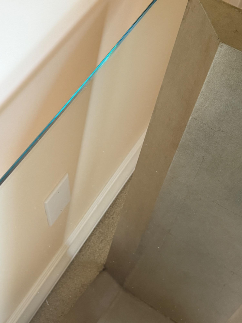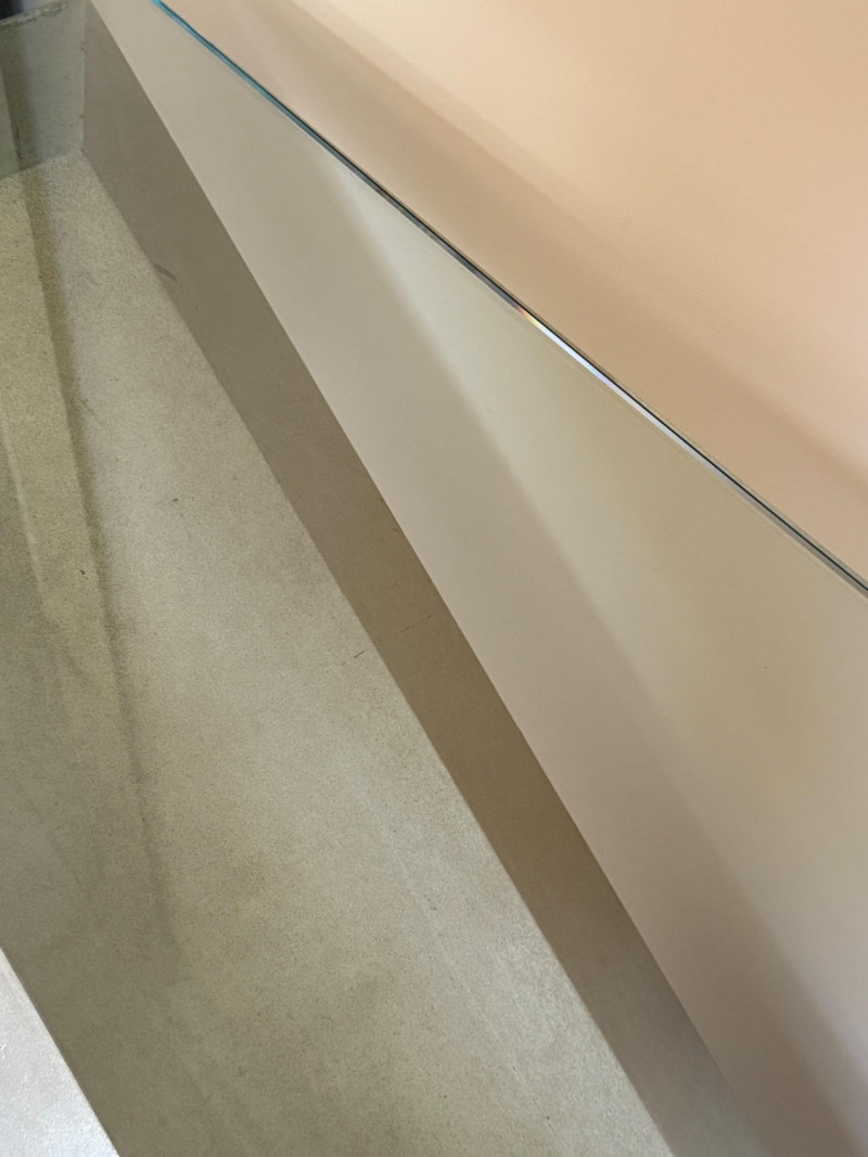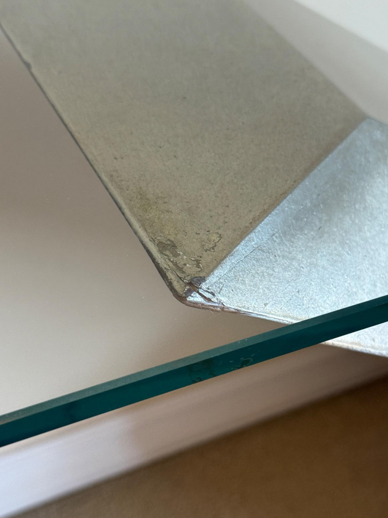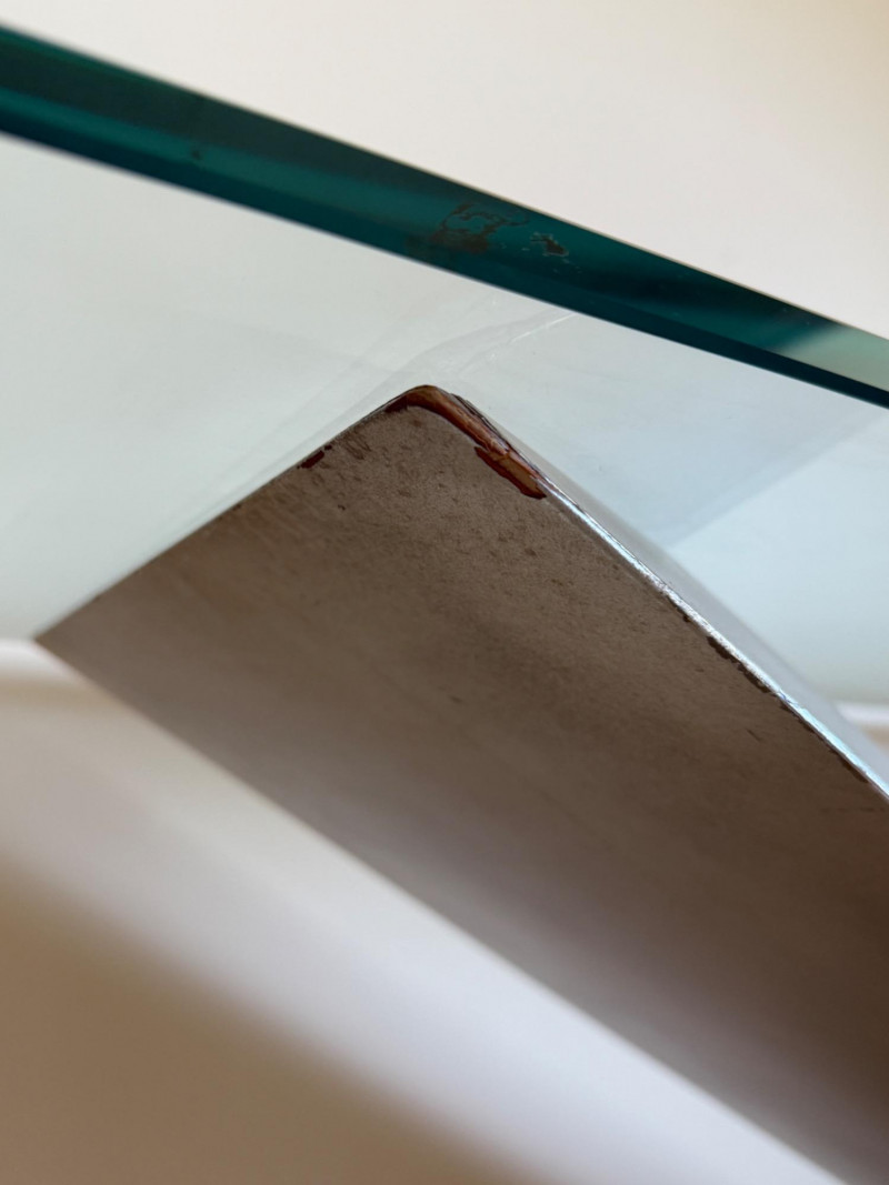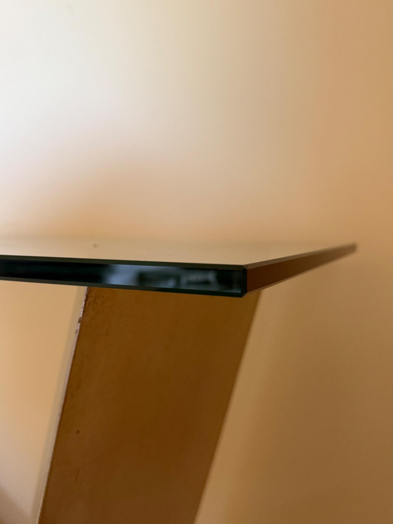 Striking postmodern console table featuring a unique architectural design. The table showcases a sleek V-shaped brushed metal base dramatically angled over a cylindrical travertine stone support, creating a bold sense of balance and tension. Details: Materials: Brushed metal, travertine stone, and clear glass Design Style: Postmodern / Contemporary Condition: Excellent, with minimal wear Approximate Dimensions: [Please provide – commonly needed: width, depth, height] A sculptural statement piece that blurs the line between functional furniture and art