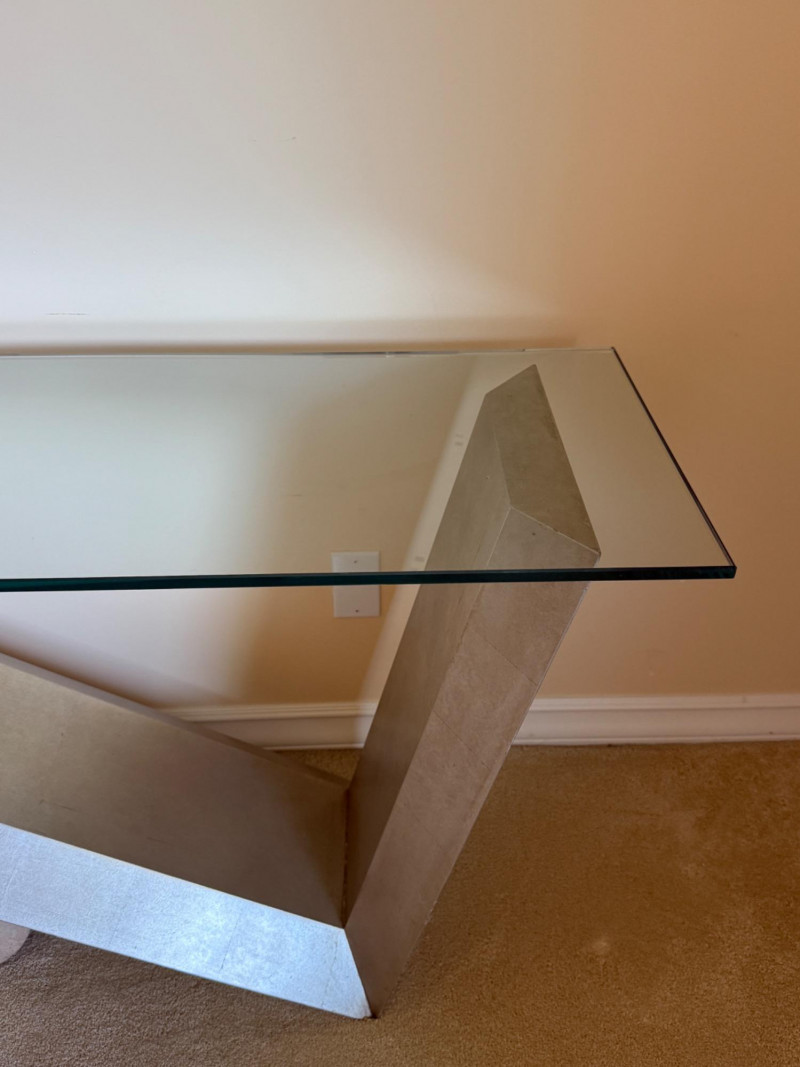 Lot # 206 - Postmodern Glass and Metal Console Table with Travertine Accent