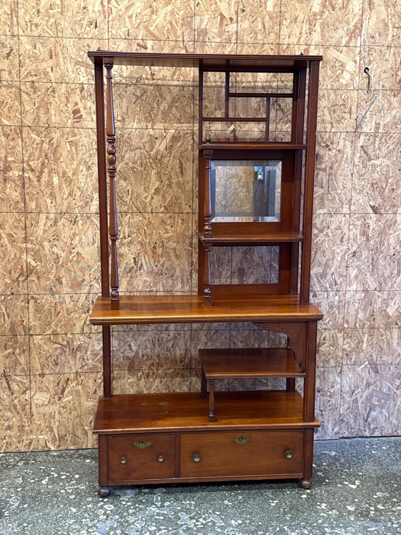 Vintage Knickknack Shelf w/ Drawers & Mirror. Has a couple spots that may need polishing or leave as is. Top of bookshelf has a little metal railing detail. along with a little beveled mirror and two bottom drawers. Please see photos for more details. Vintage condition.
