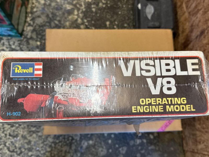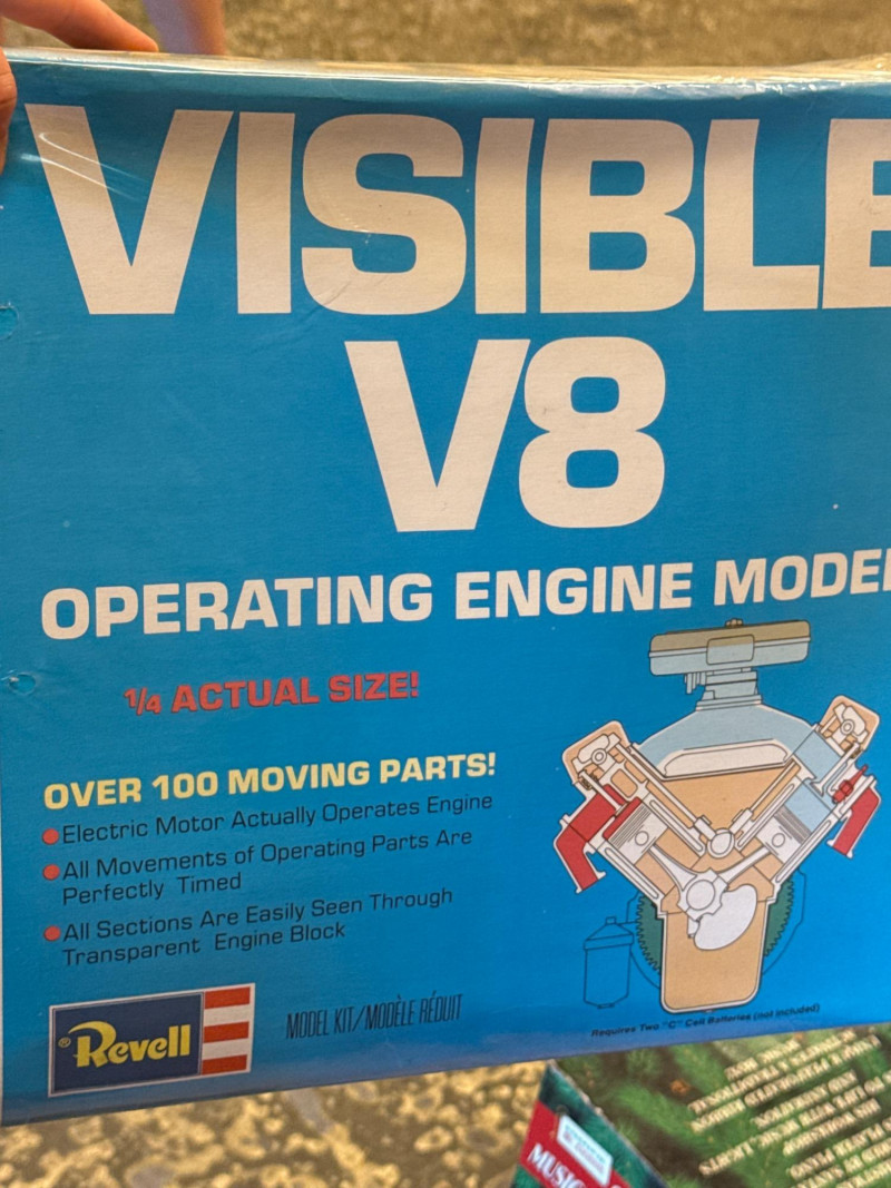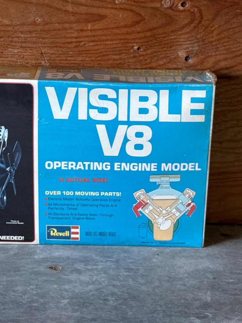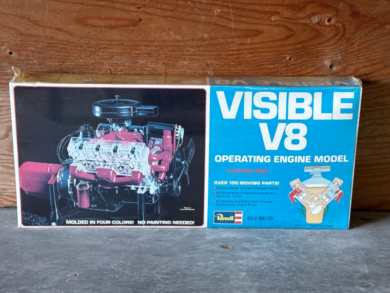 Revell Visible V8 1:4 Model Operating Engine Model Kit Over 100 moving parts! Still in original box w/ plastic protectant wrapping. 1. Electric motor actually 2. All movements of operating parts are perfectly timed 3. All sections are easily seen through transparent engine block