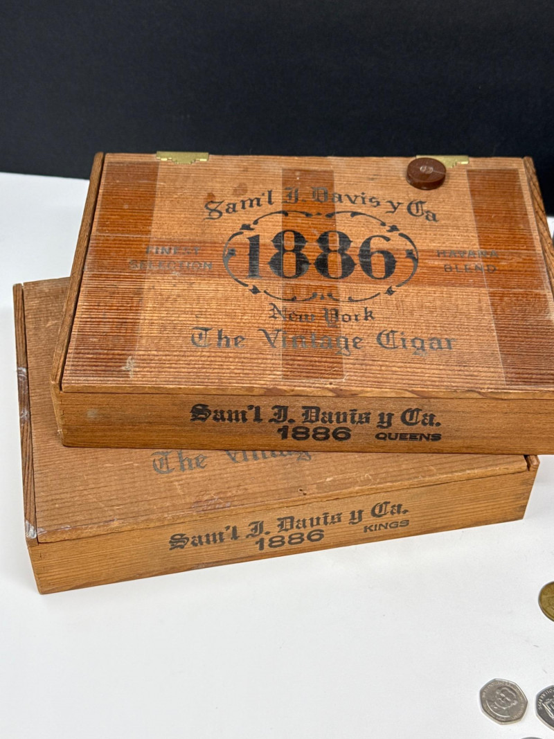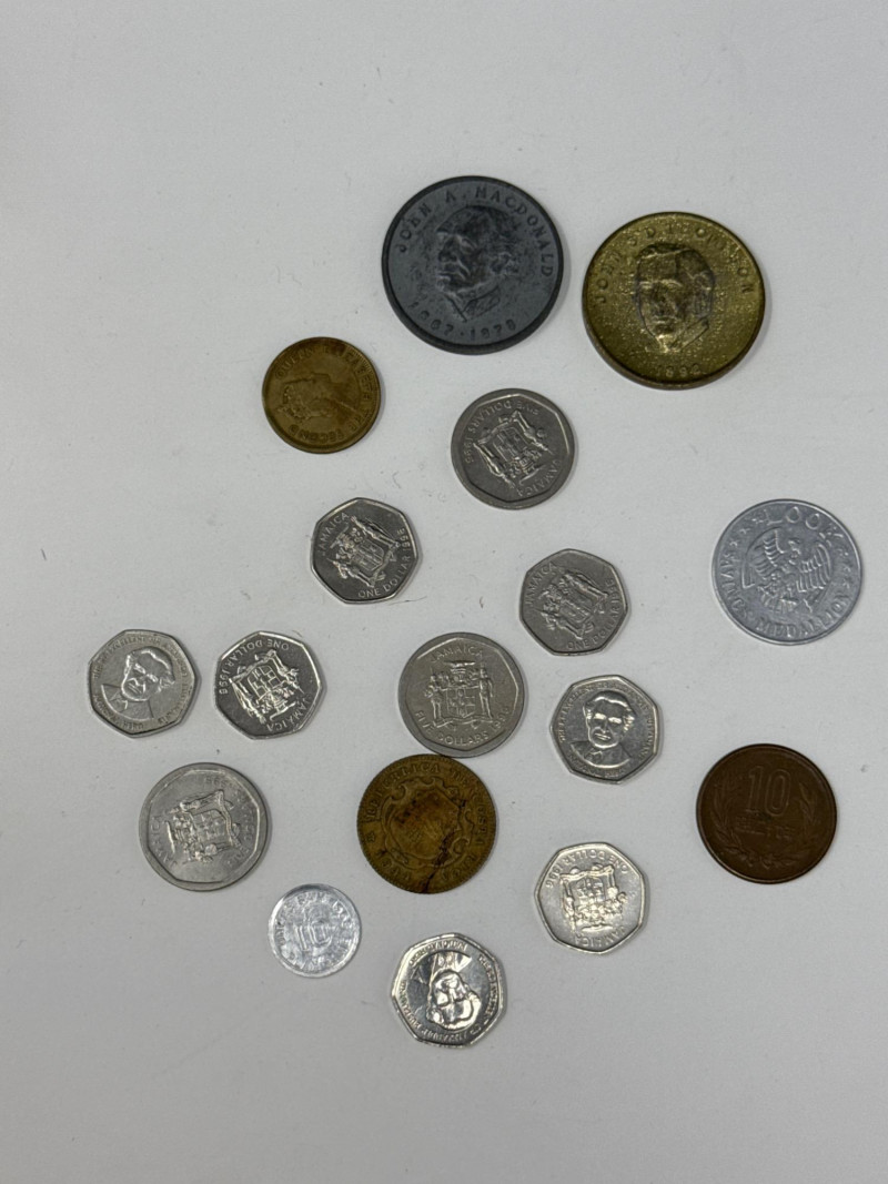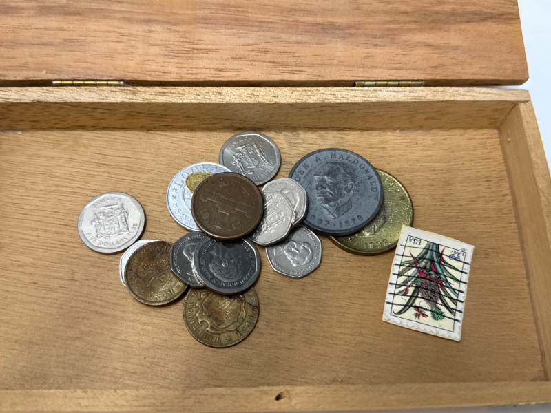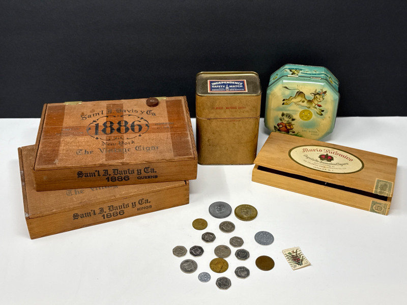 Foreign Coins, Tokens, Antique Tin & Cigar Boxes