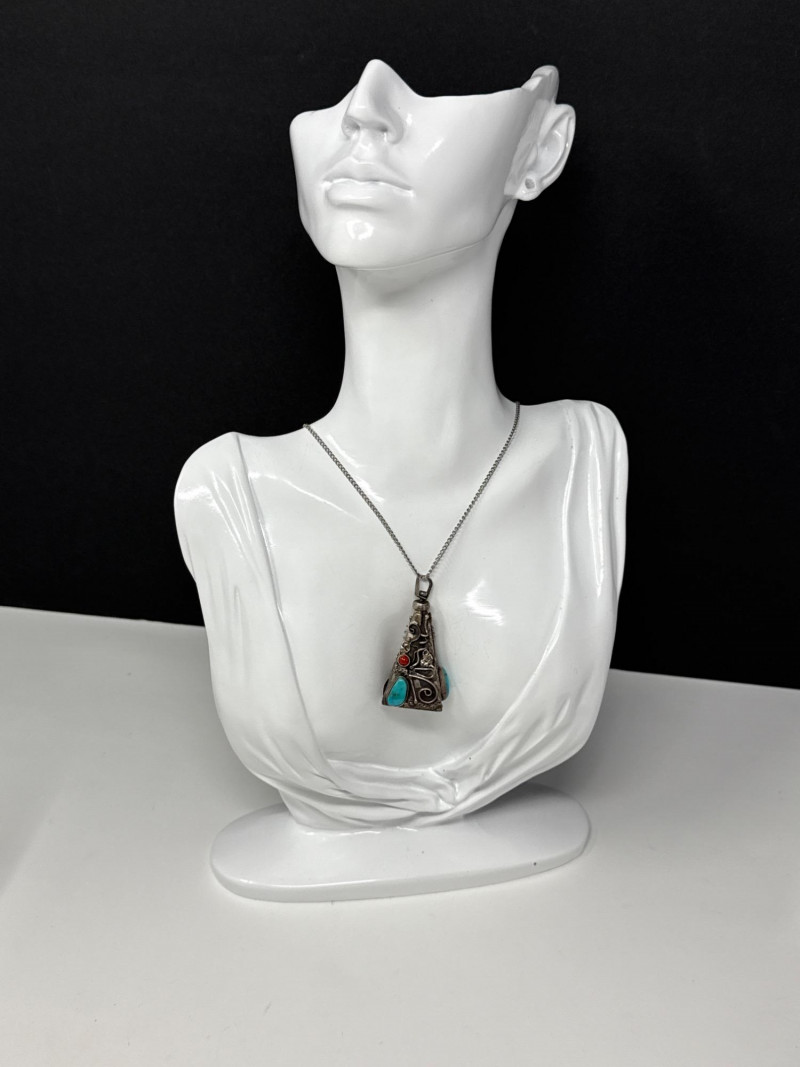Southwestern Silver Coral & Turquoise Pendant Necklace