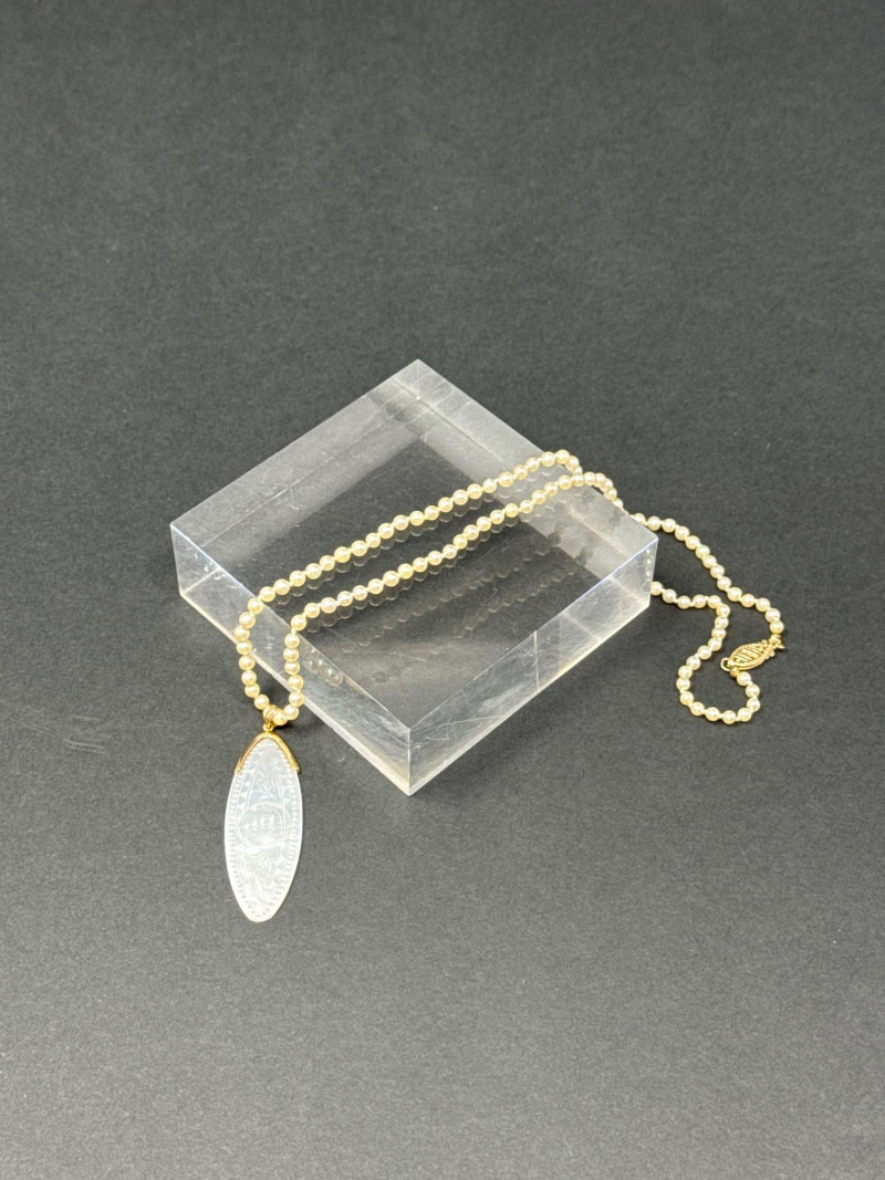 Antique Chinese Mother of Pearl 14k Gold Necklace Pendant appears to be an Antique Chinese Mother of Pearl game token. Likely hand carved and possibly used as a gaming counter or chip in games. These tokens were crafted in China, primarily between the late 18th and 19th century- then exported to Europe.
