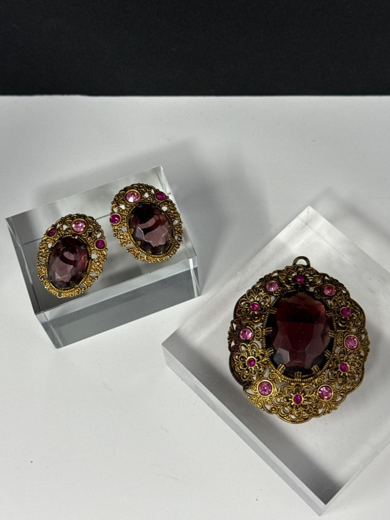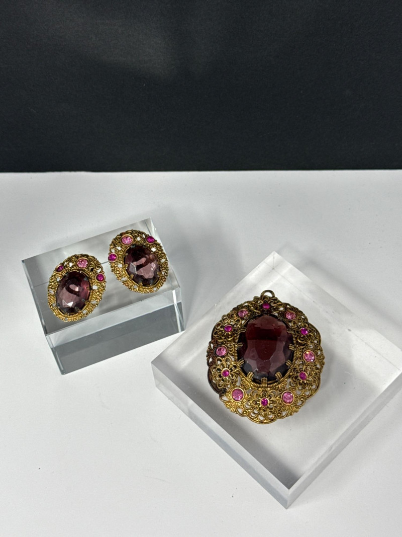 Vintage West Germany Burgundy Brooch & Clip-On Earring Set