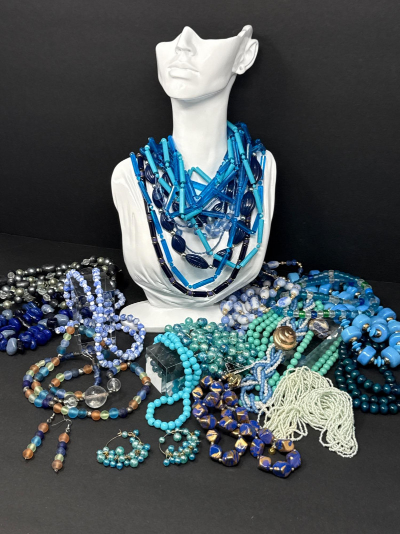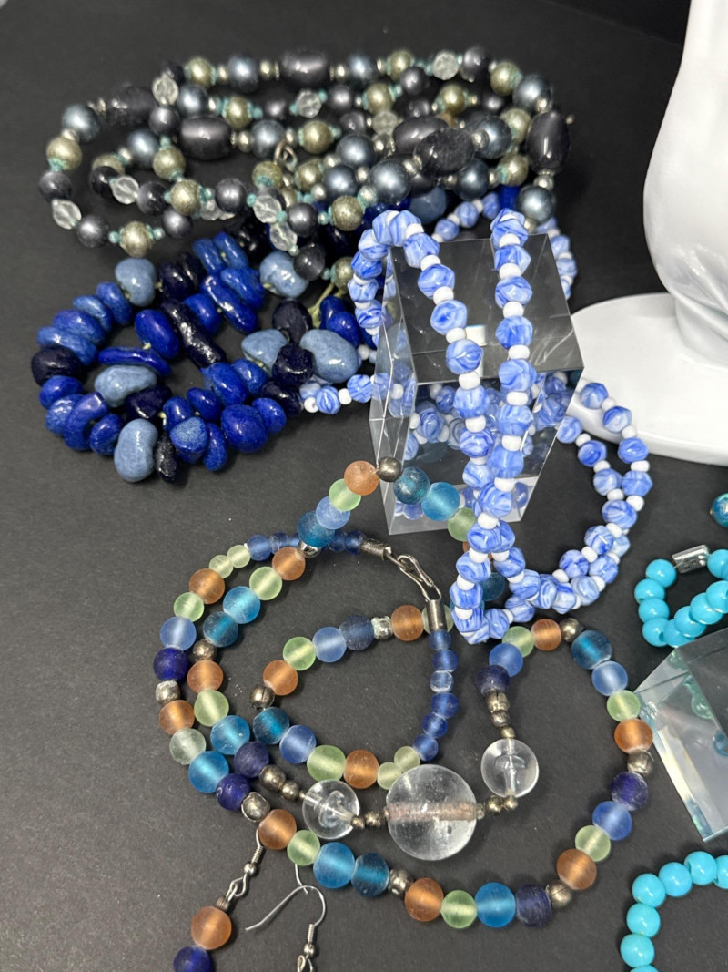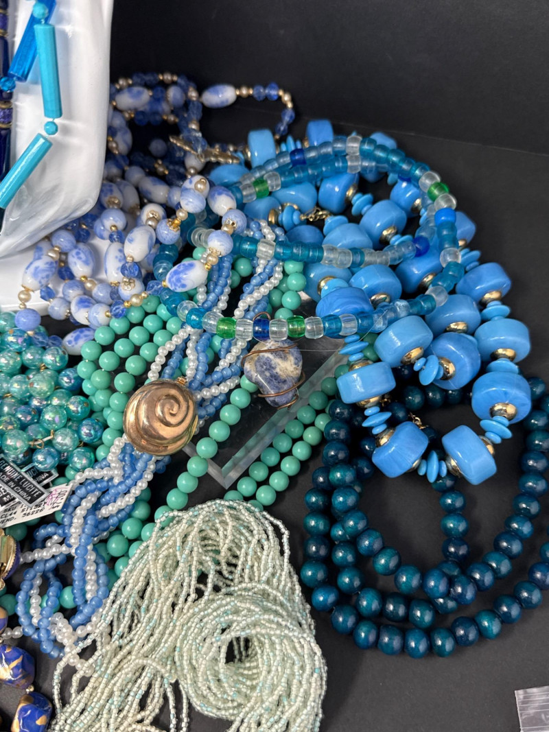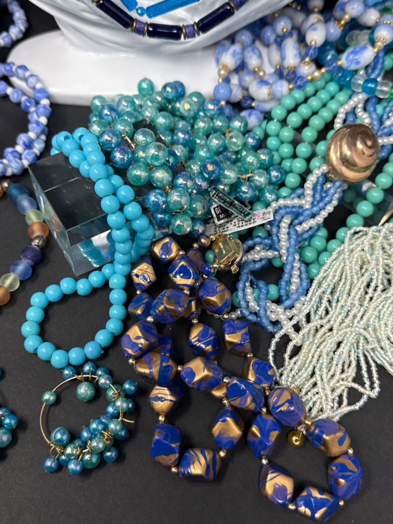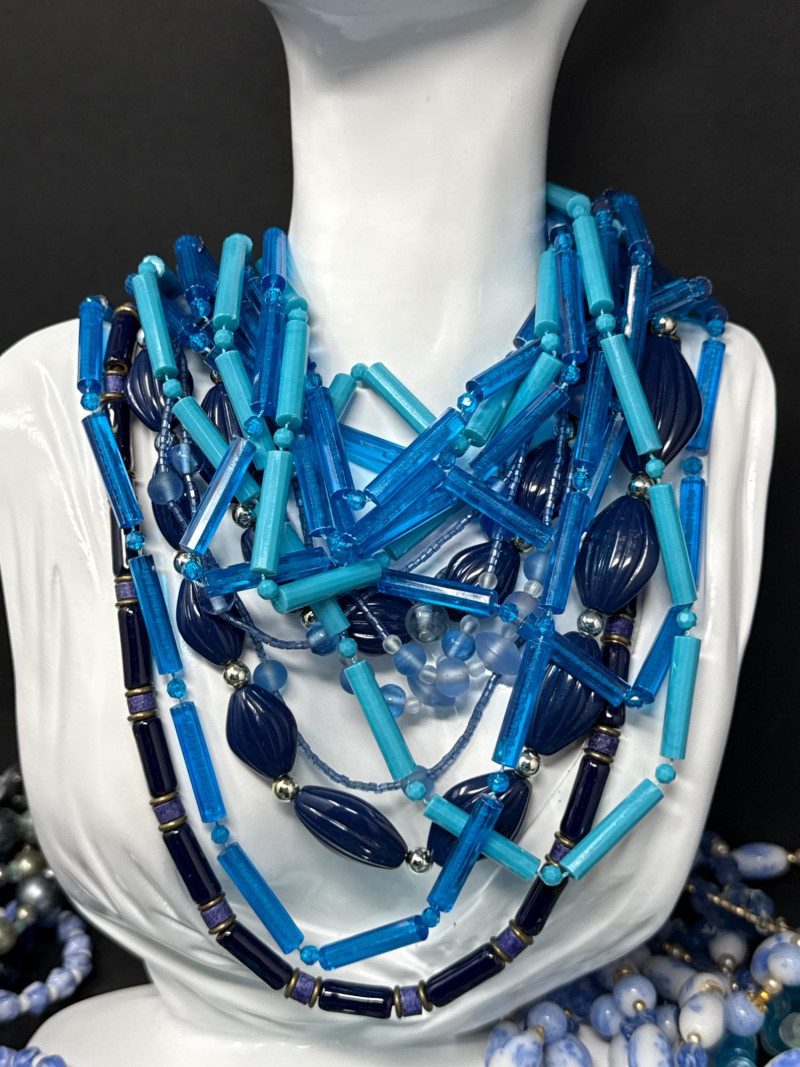 Large assortment of vintage blue beaded jewelry. Mainly Necklaces a couple bracelets and earrings.