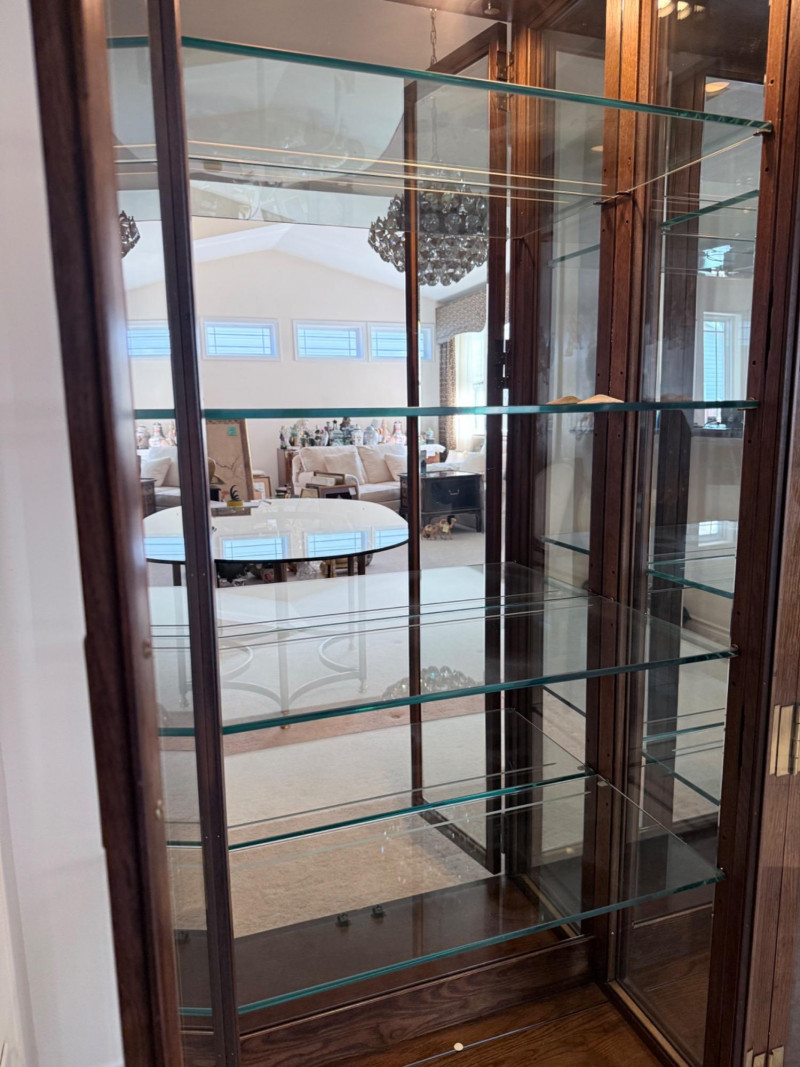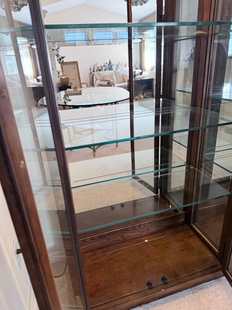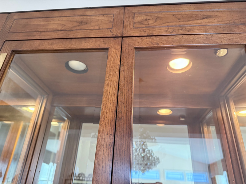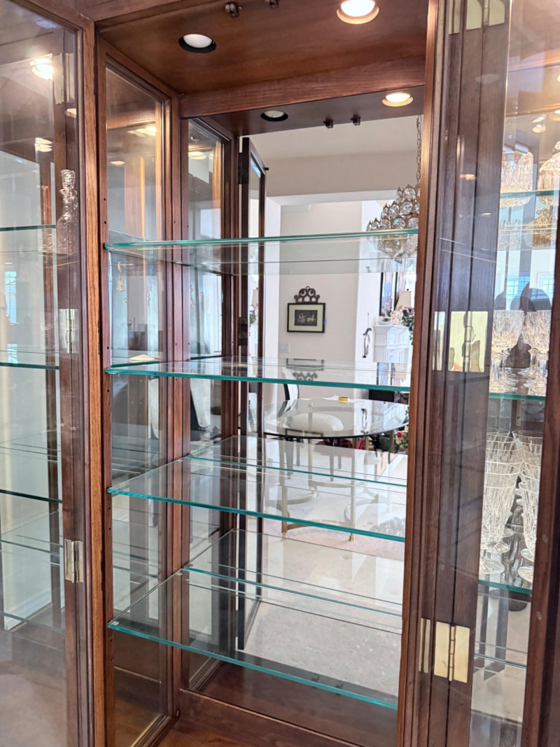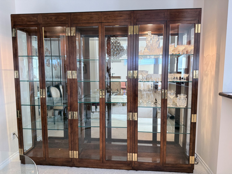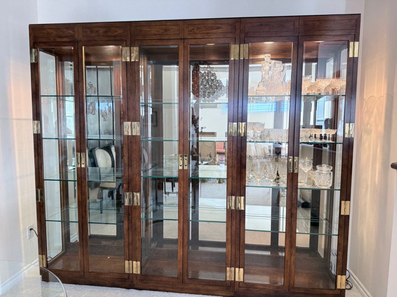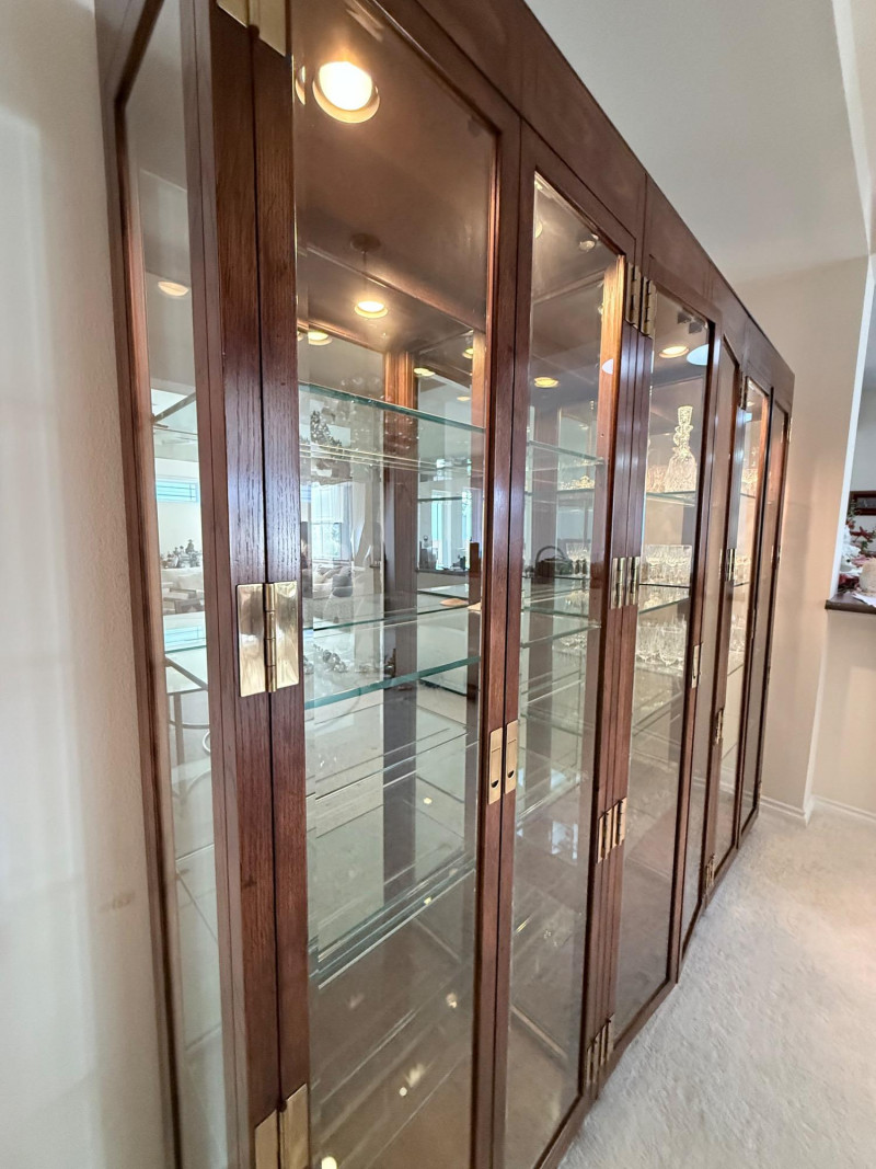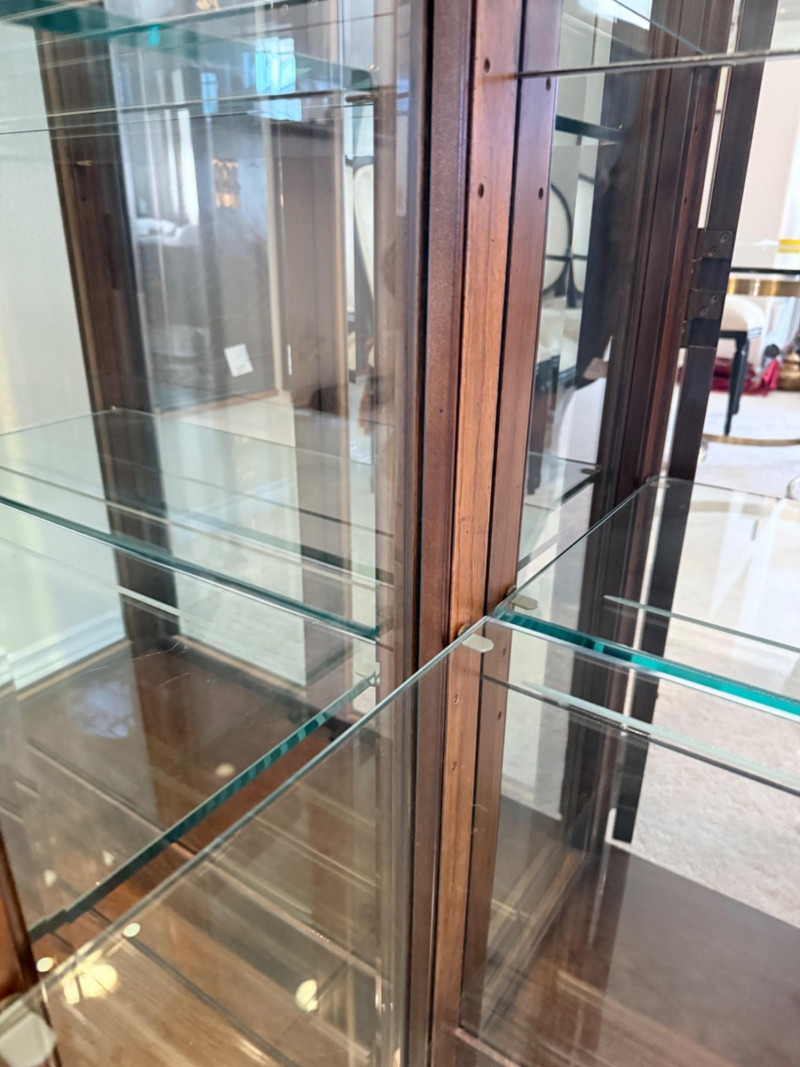 Monumental Mid-Century Modern Style Lighted Display Cabinet with Brass Accents – 94.5” Wide Dimensions: 94.5" W x 15" D x 82" H This impressive five-panel glass display cabinet offers a striking blend of mid-century modern sophistication and timeless functionality. Framed in warm, richly grained wood, the piece is defined by its clean architectural lines, inset glass doors, and bold brass hardware—a nod to 1960s and 1970s luxury design aesthetics. Each section includes thick glass shelving and built-in recessed lighting, providing an ideal stage for showcasing fine collectibles, art glass, or barware. The sleek brass finger-pull handles and mirrored backing enhance the display’s visual depth and glamour. Whether used in a dining room, grand foyer, or as a statement piece in a modern interior, this cabinet commands attention while remaining highly functional. Note: Due to its substantial size and weight, buyer must bring tools and help to disassemble and remove the cabinet. This is a two-person (or more) move, and professional assistance is strongly recommended. Condition: Lighting tested and functional. Some red staining at the very bottom of left. Noted in photos. CONTENTS ON SHELF NOT INCLUDED.