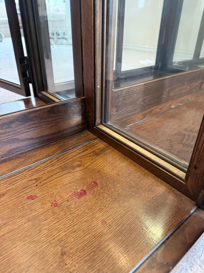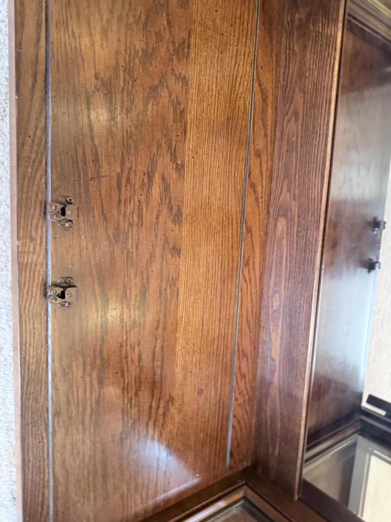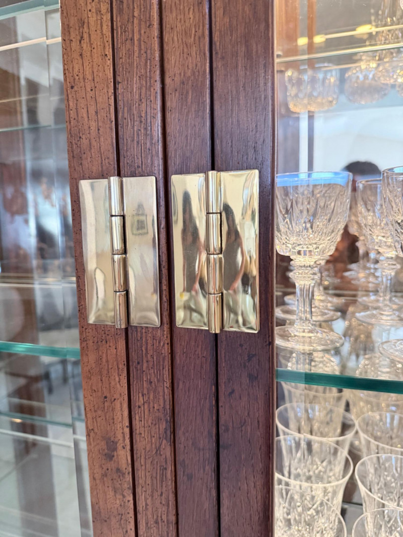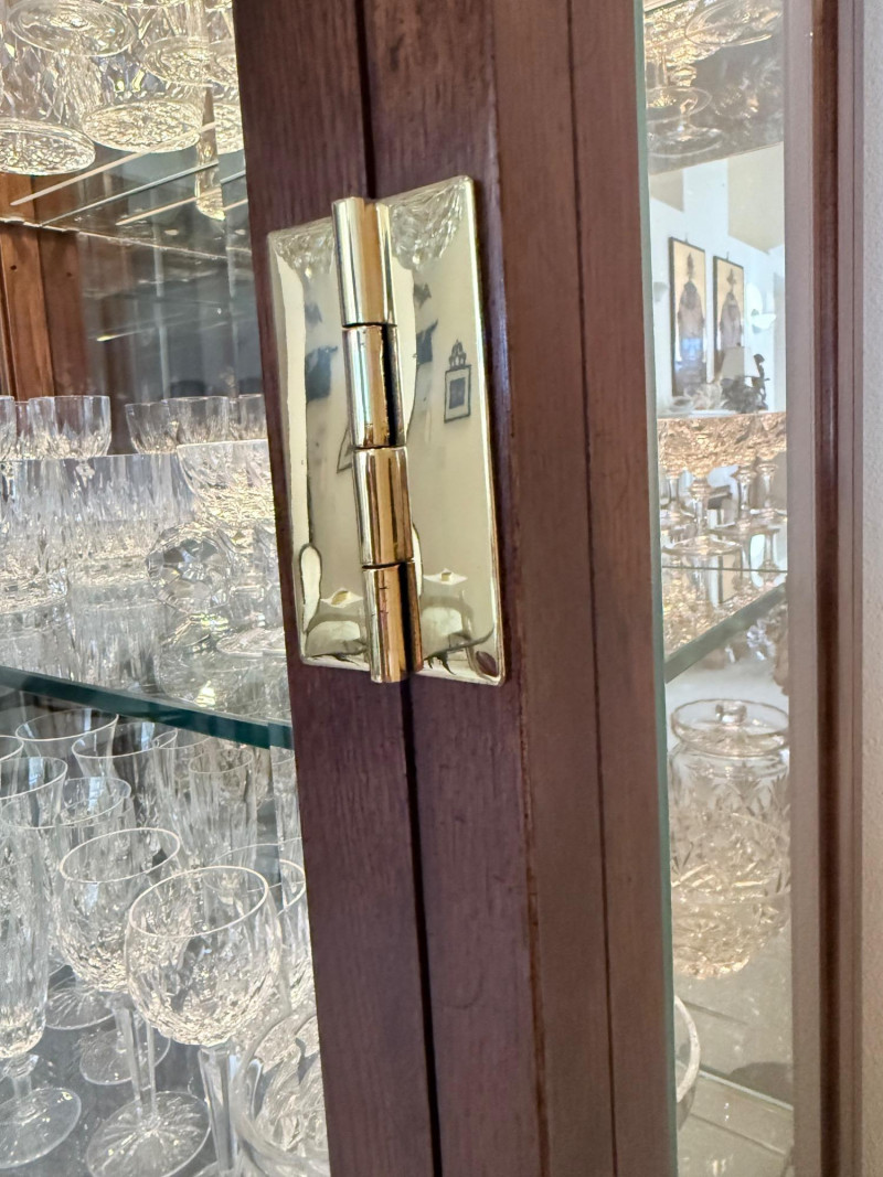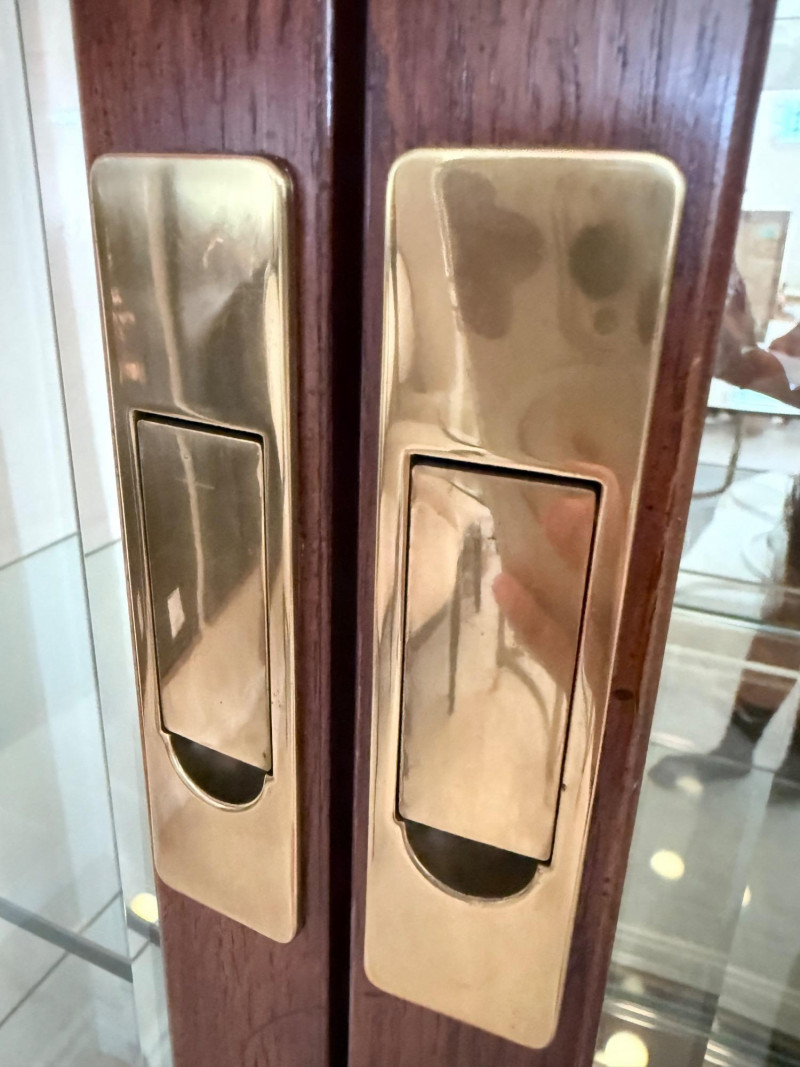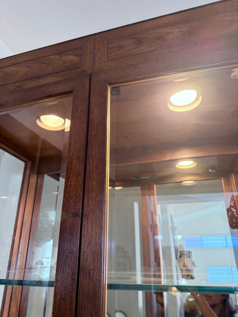 Monumental Mid-Century Modern Style Lighted Display Cabinet with Brass Accents – 94.5” Wide Dimensions: 94.5" W x 15" D x 82" H This impressive five-panel glass display cabinet offers a striking blend of mid-century modern sophistication and timeless functionality. Framed in warm, richly grained wood, the piece is defined by its clean architectural lines, inset glass doors, and bold brass hardware—a nod to 1960s and 1970s luxury design aesthetics. Each section includes thick glass shelving and built-in recessed lighting, providing an ideal stage for showcasing fine collectibles, art glass, or barware. The sleek brass finger-pull handles and mirrored backing enhance the display’s visual depth and glamour. Whether used in a dining room, grand foyer, or as a statement piece in a modern interior, this cabinet commands attention while remaining highly functional. Note: Due to its substantial size and weight, buyer must bring tools and help to disassemble and remove the cabinet. This is a two-person (or more) move, and professional assistance is strongly recommended. Condition: Lighting tested and functional. Some red staining at the very bottom of left. Noted in photos. CONTENTS ON SHELF NOT INCLUDED.