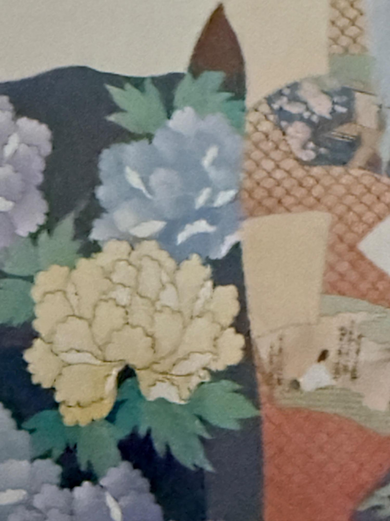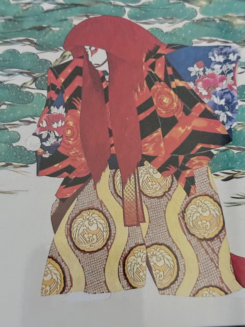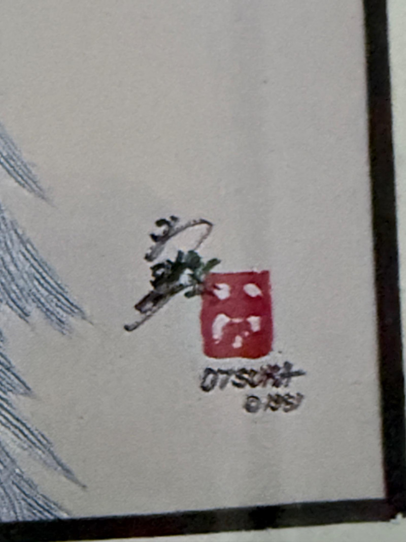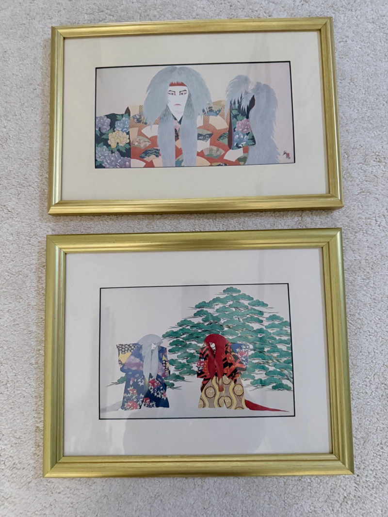 Pair of Framed Japanese Kabuki-Inspired Woodblock Prints – Signed & Stamped Dimensions (framed): 16" x 12.5" and 15.5" x 11" A visually striking pair of Japanese prints featuring elaborately dressed Kabuki or Noh theatre figures rendered in rich jewel tones and intricate textile patterns. Both works are marked with a red artist’s seal and signed “Otsuka” in English script, but the authenticity and full attribution have not been confirmed. Executed in the traditional style of Japanese woodblock or silkscreen prints, these works showcase strong attention to detail, layered textile motifs, and dramatic theatrical costumes set against minimalist backdrops—hallmarks of Japanese stage art and printmaking traditions. Each print is professionally framed behind glass in coordinating gold-tone frames with sawtooth hangers, ready to display. Condition: vintage condition. Minor wear to frame edges consistent with age.