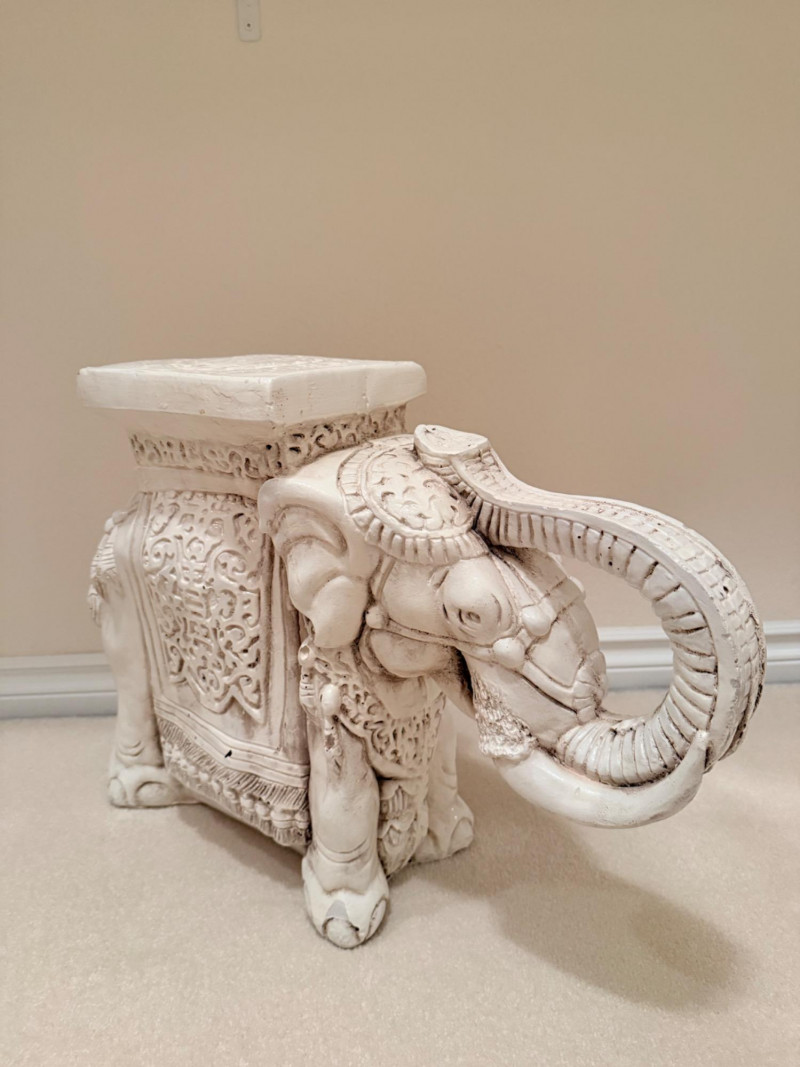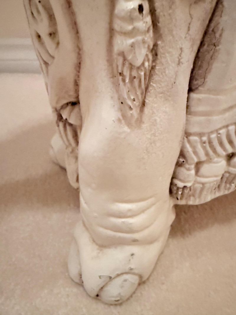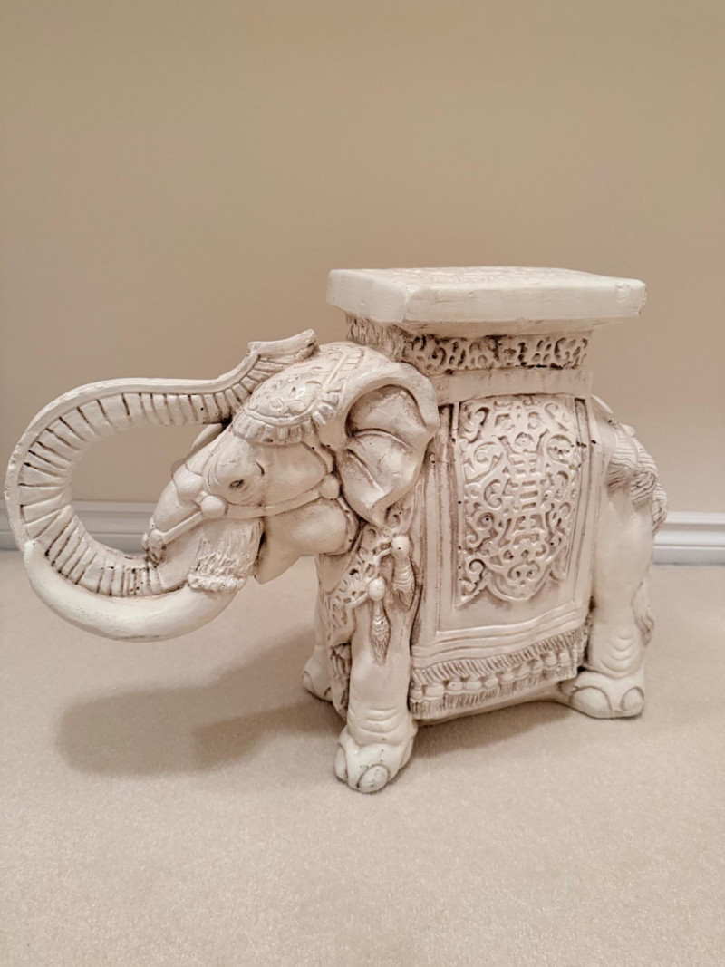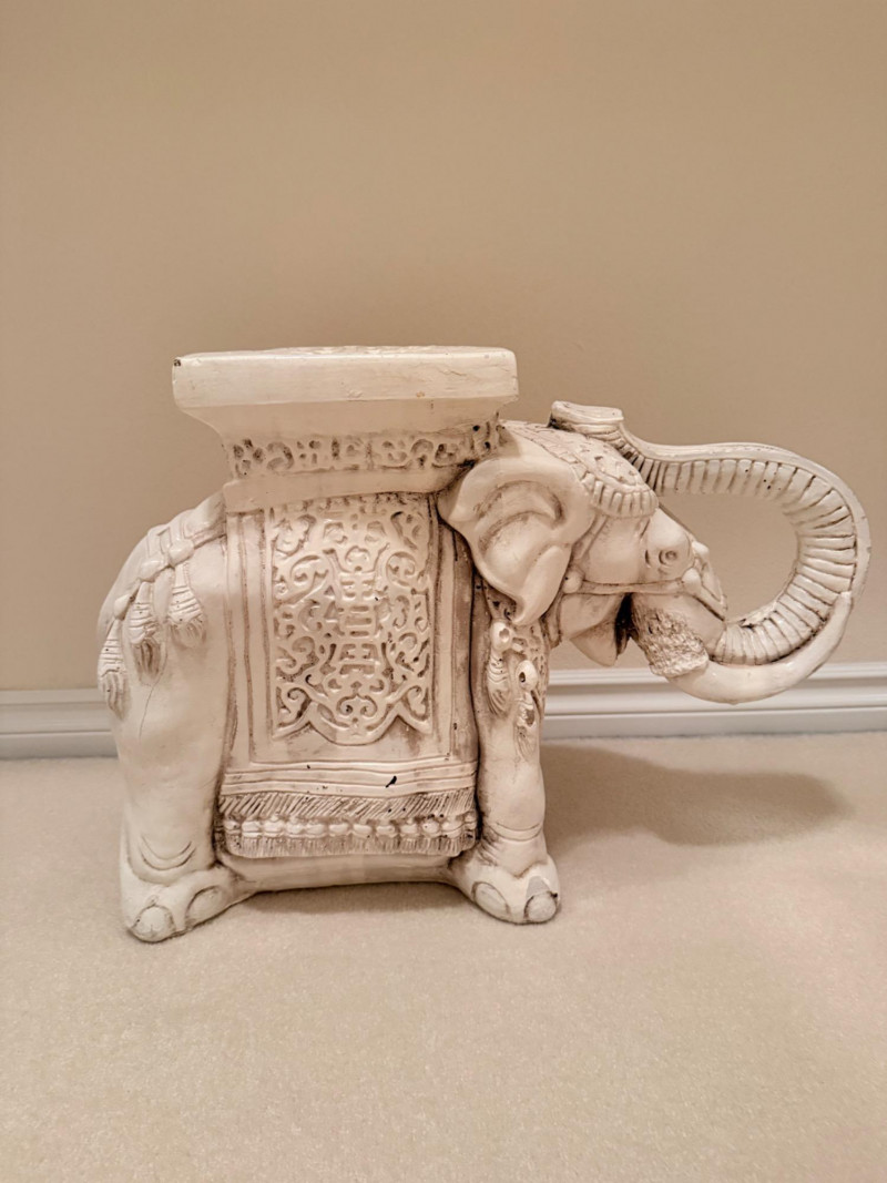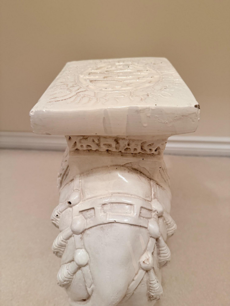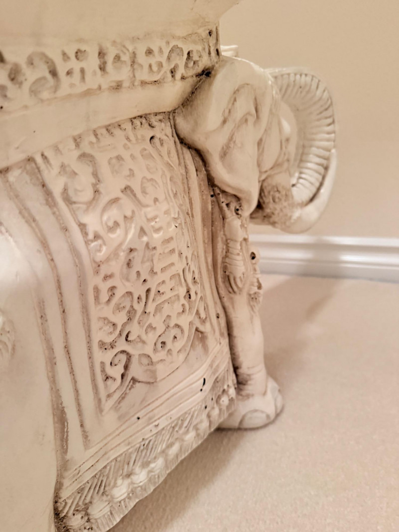 Decorative Elephant Sculpture Pedestal – White Glaze with Intricate Relief Detailing This beautifully crafted decorative elephant pedestal is a striking accent piece, showcasing ornate relief carvings and a soft white crackle glaze finish. Featuring traditional Asian-inspired motifs, including a prominent longevity symbol on the top and tassel details along the sides, this piece blends cultural symbolism with elegant craftsmanship. The elephant’s raised trunk and finely rendered facial features add depth and charm, making it an ideal piece for display on the floor, under a console, or in a niche. While substantial in size and visual presence, the piece appears to be made of ceramic or composite material, giving it the look of aged ivory or stone. Condition: minor wear consistent with display use. No chips or cracks noted.