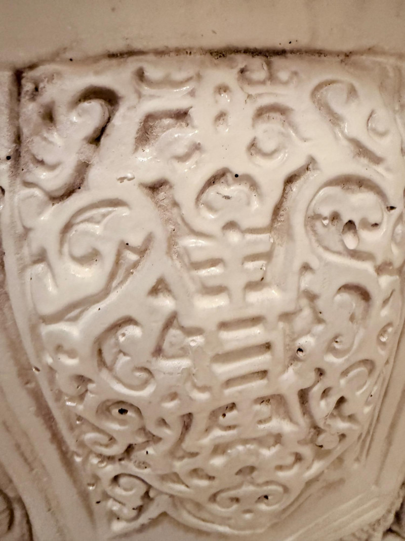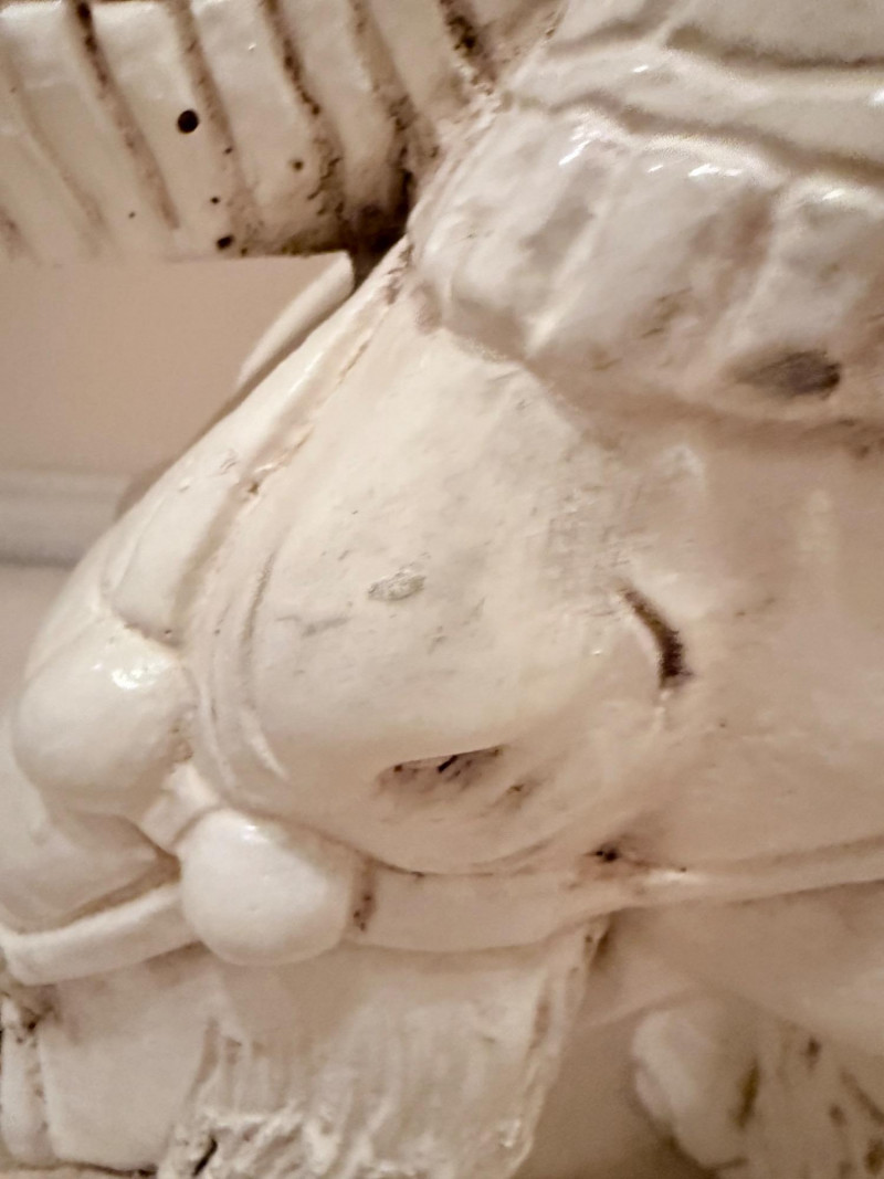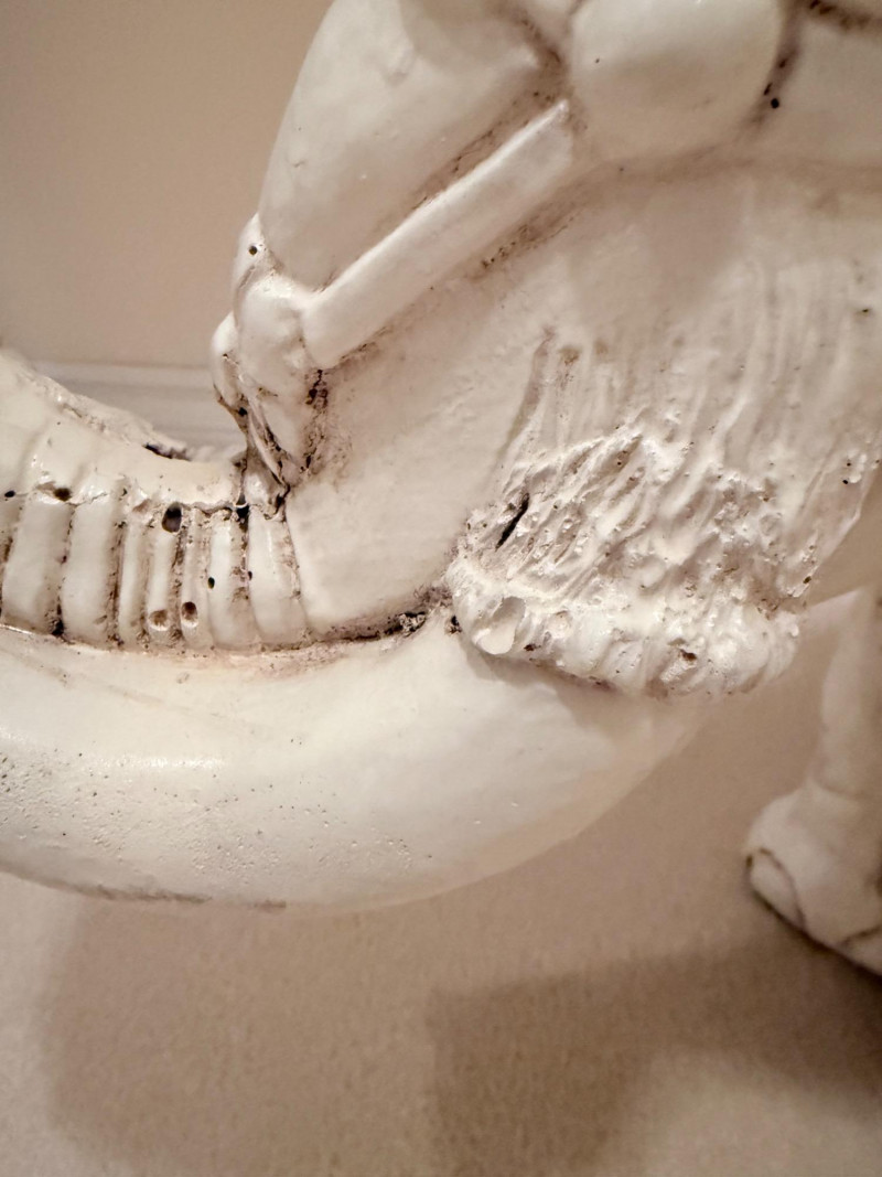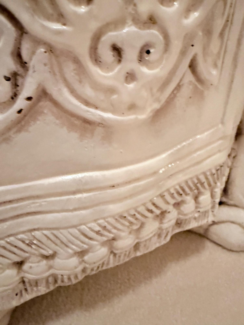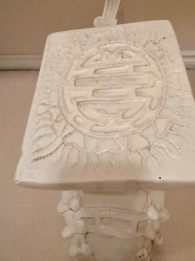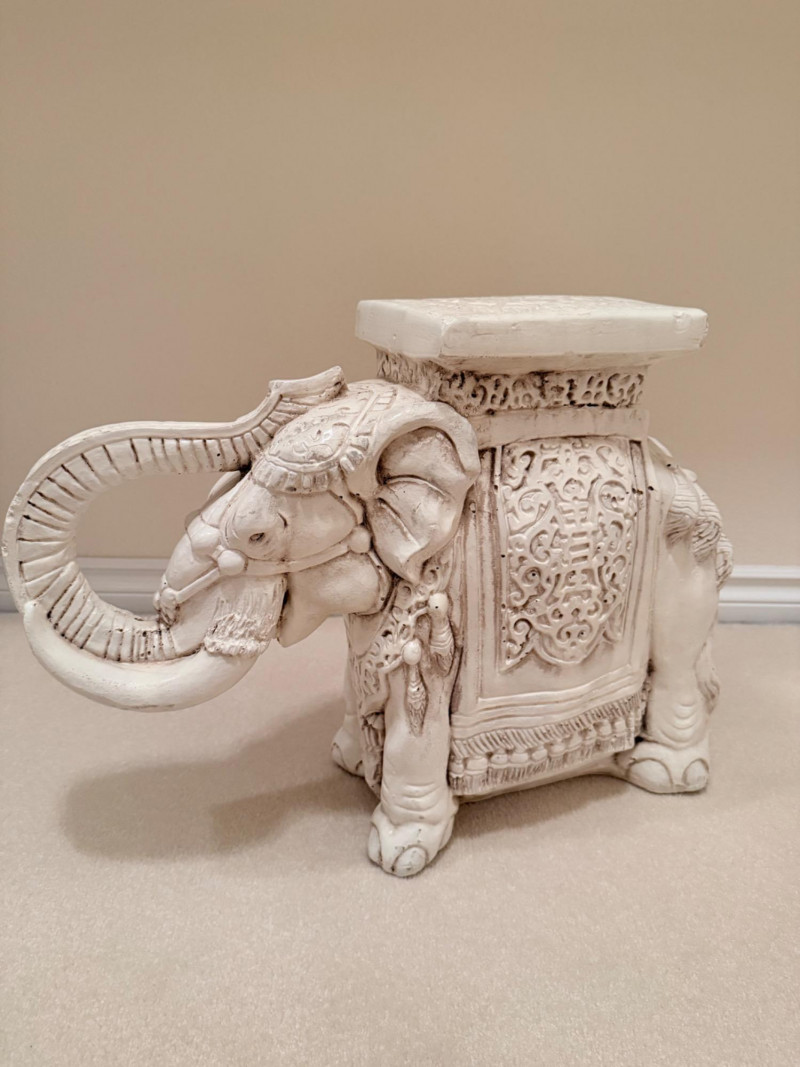 Decorative Elephant Sculpture Pedestal – White Glaze with Intricate Relief Detailing This beautifully crafted decorative elephant pedestal is a striking accent piece, showcasing ornate relief carvings and a soft white crackle glaze finish. Featuring traditional Asian-inspired motifs, including a prominent longevity symbol on the top and tassel details along the sides, this piece blends cultural symbolism with elegant craftsmanship. The elephant’s raised trunk and finely rendered facial features add depth and charm, making it an ideal piece for display on the floor, under a console, or in a niche. While substantial in size and visual presence, the piece appears to be made of ceramic or composite material, giving it the look of aged ivory or stone. Condition: minor wear consistent with display use. No chips or cracks noted.