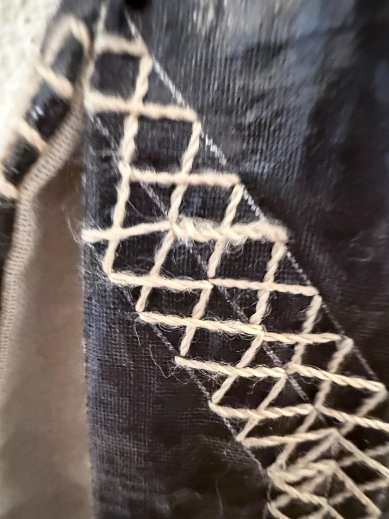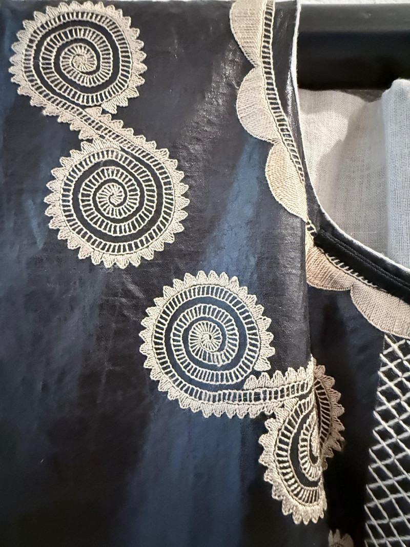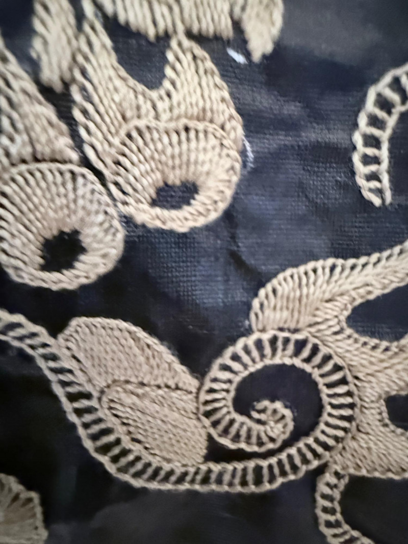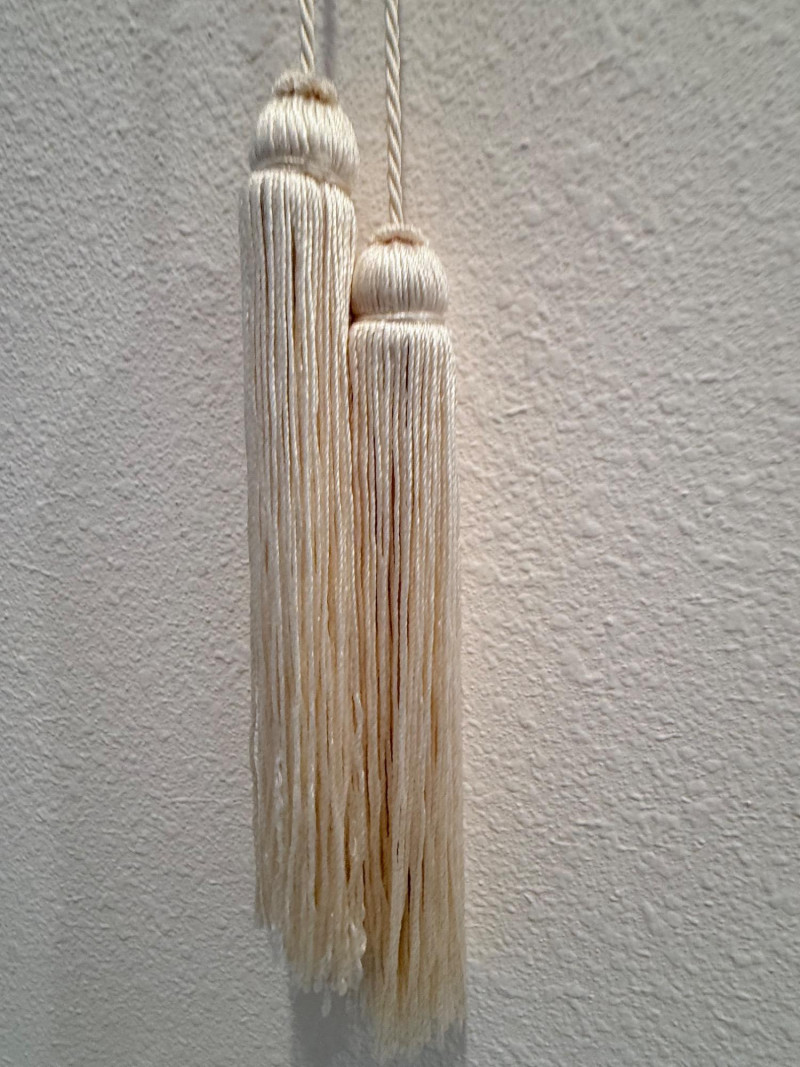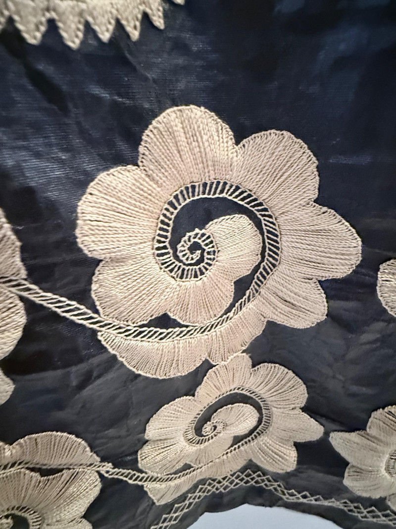 Chinese Embroidered Dragon Robe Robe with embroidered decoration in couched thread work. Four-clawed dragons appear across the front and back, surrounded by stylized cloud forms and circular emblems. The hem is bordered with a continuous wave-and-cloud pattern. Geometric latticework outlines the collar and sleeve bands. Long silk tassels extend from each sleeve. Dimensions: 60" W x 48" H