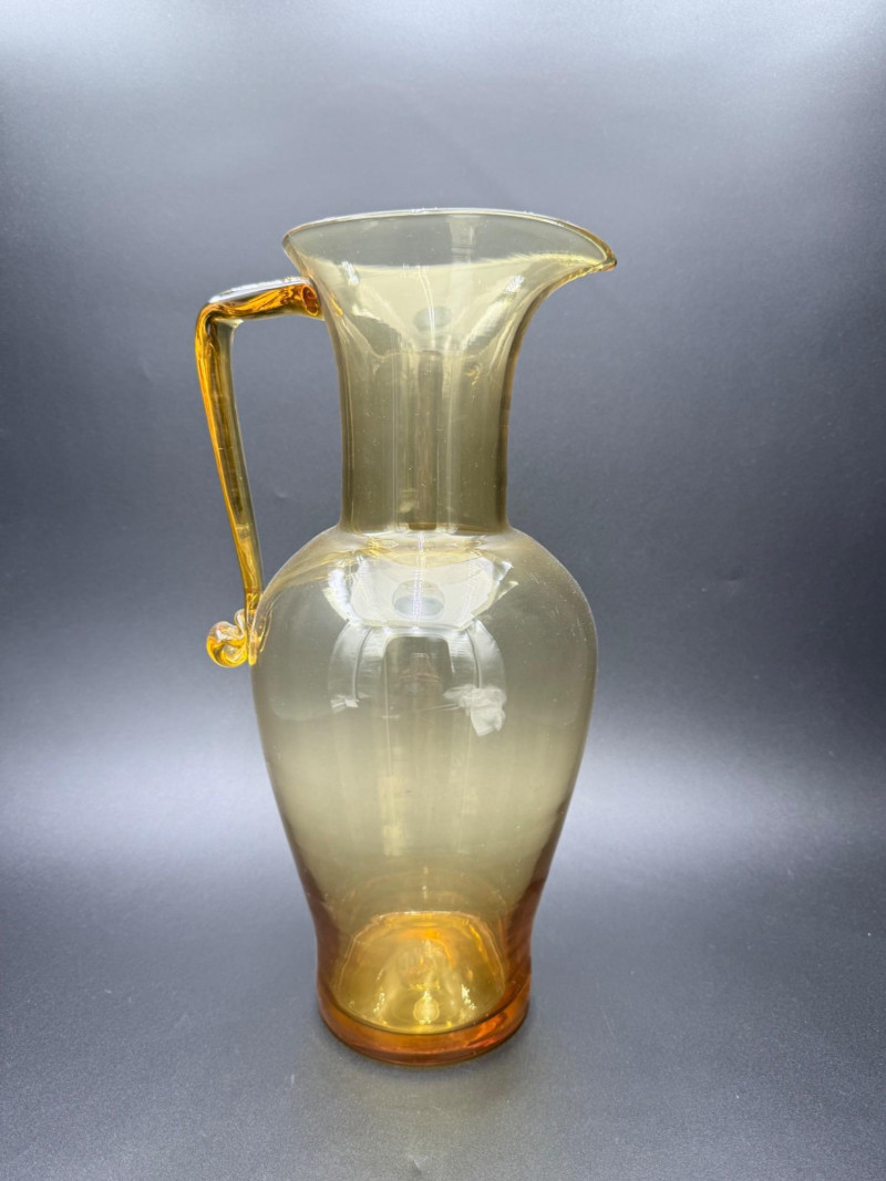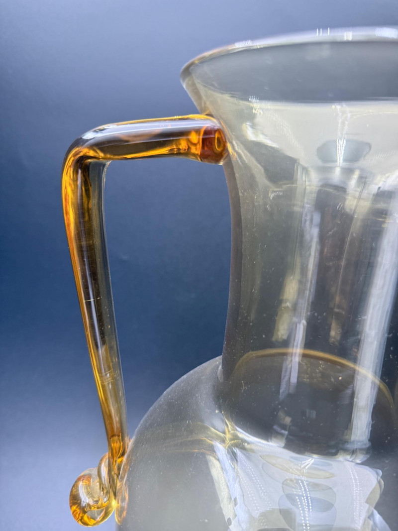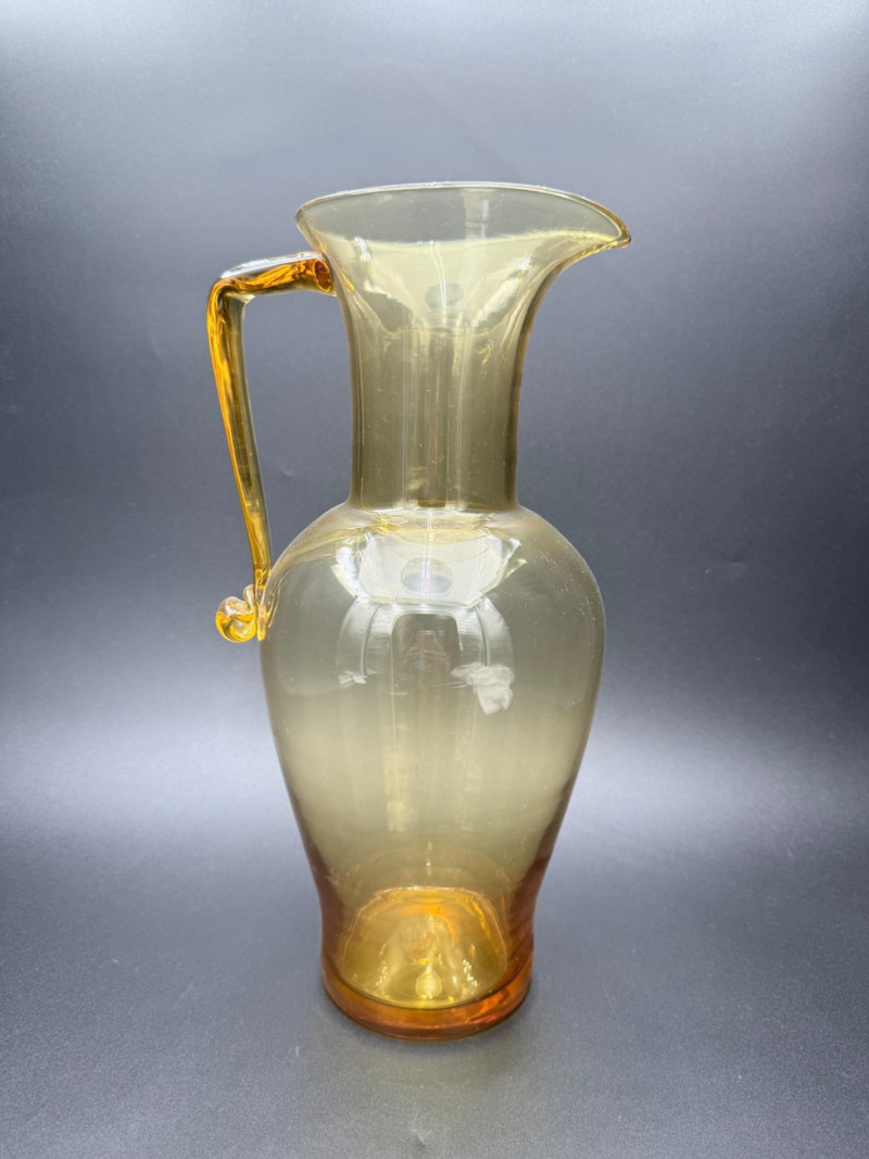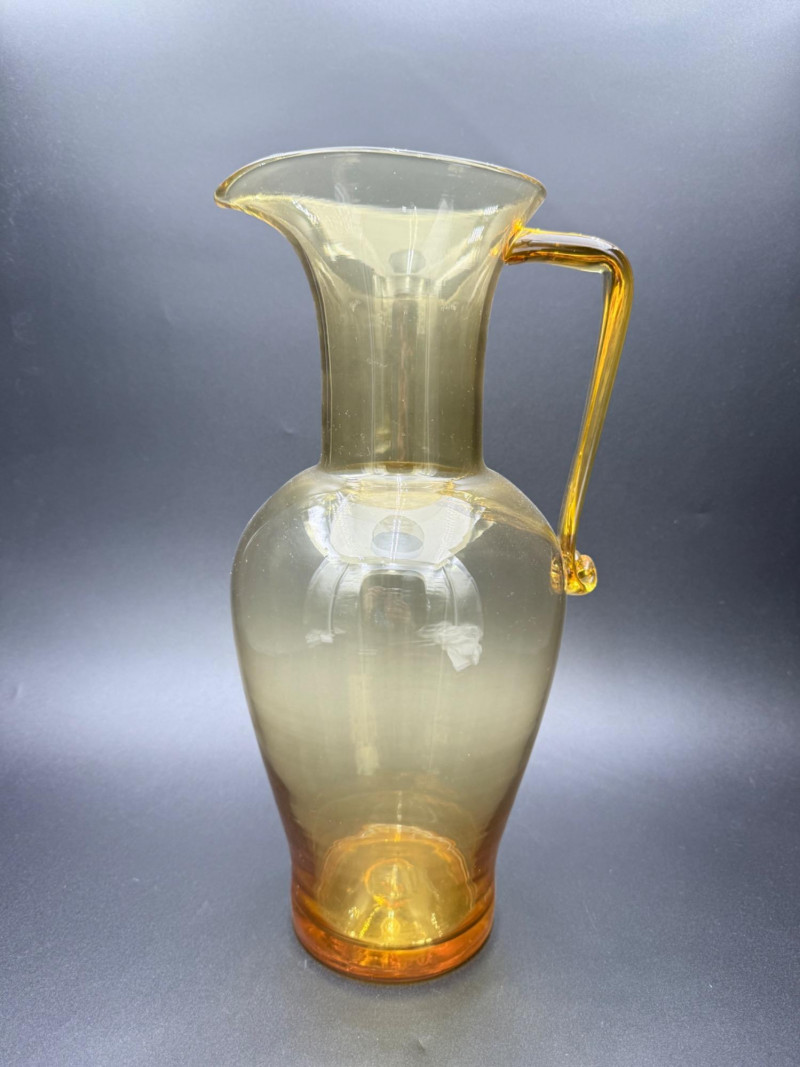 Mid-Century Amber Glass Pitcher Blown glass pitcher with a wide, rounded base that tapers into a narrow neck and flared spout. The body transitions from amber at the foot to a clear upper section. A solid amber handle is attached to the upper neck and curves into a curled tail at the base. Dimensions: