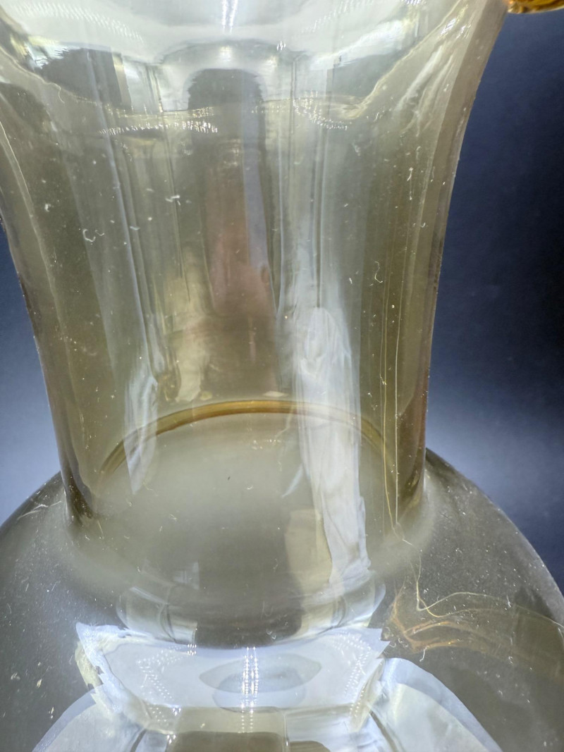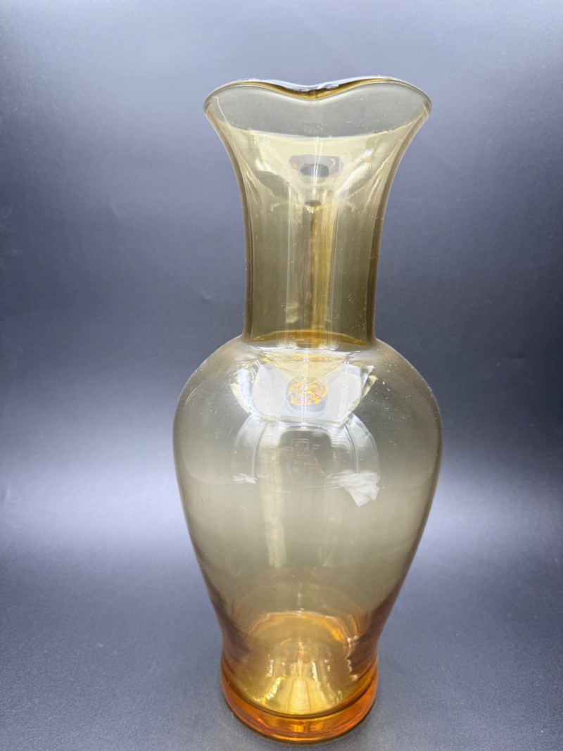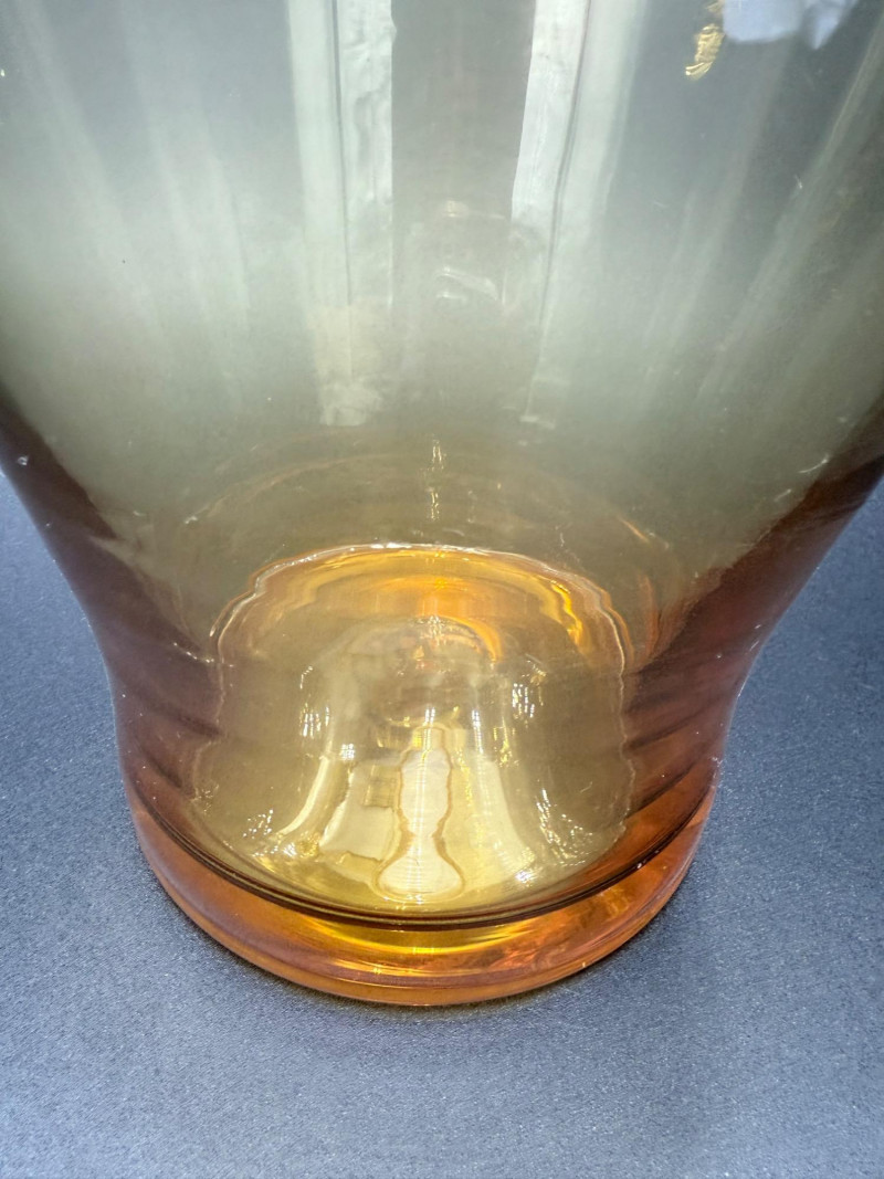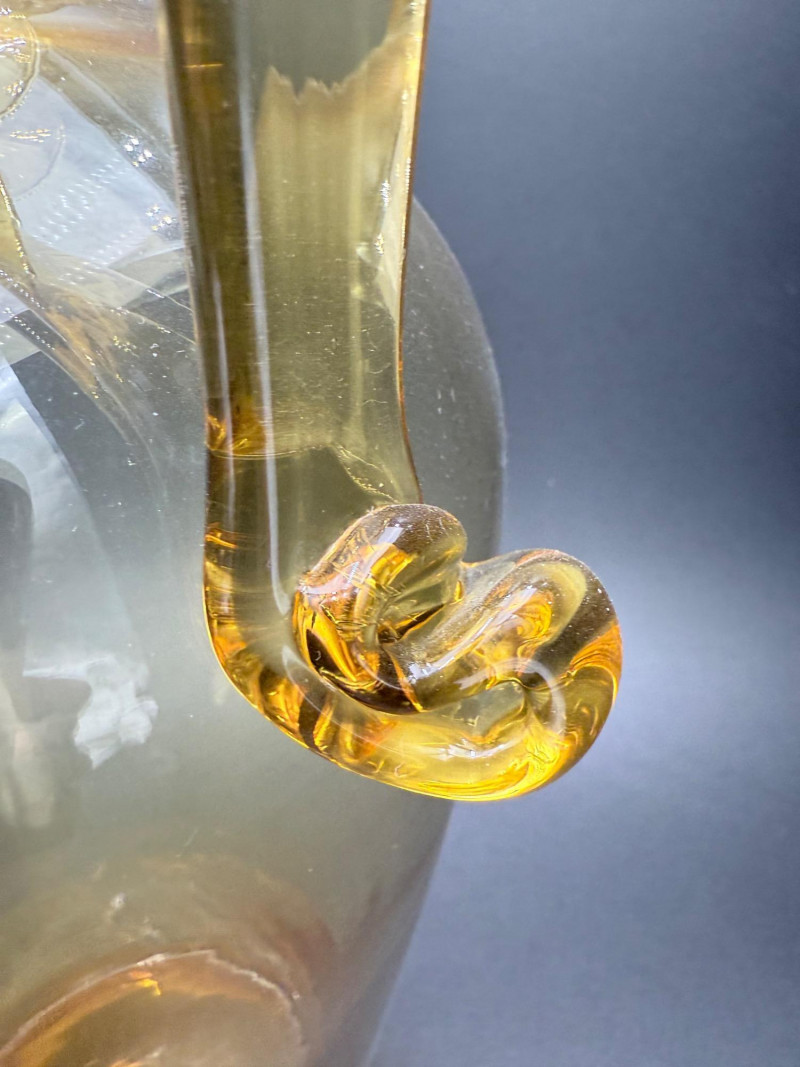 Mid-Century Amber Glass Pitcher Blown glass pitcher with a wide, rounded base that tapers into a narrow neck and flared spout. The body transitions from amber at the foot to a clear upper section. A solid amber handle is attached to the upper neck and curves into a curled tail at the base. Dimensions: