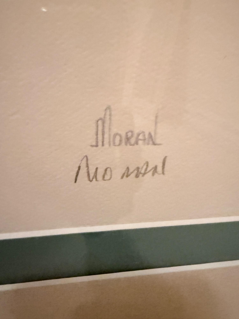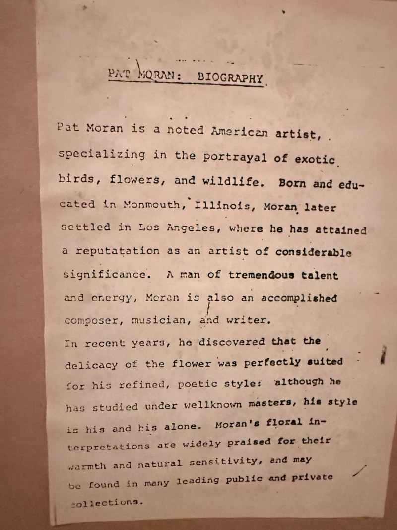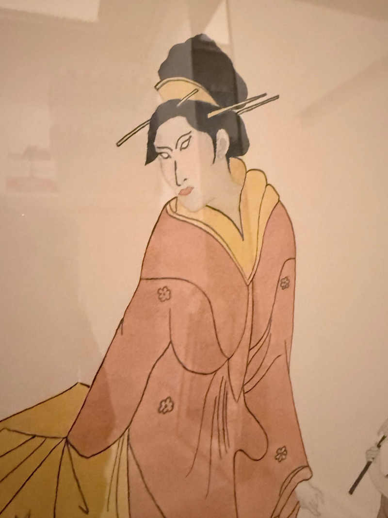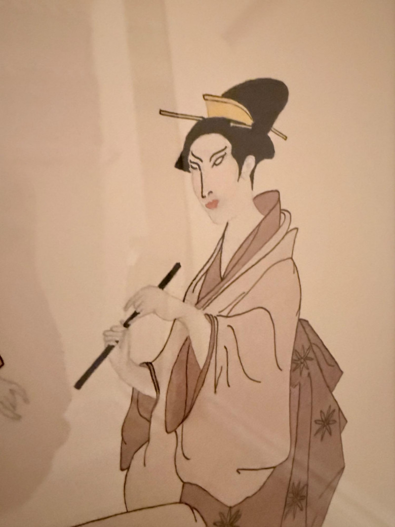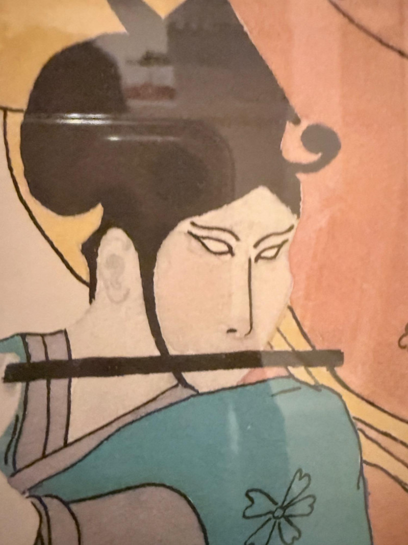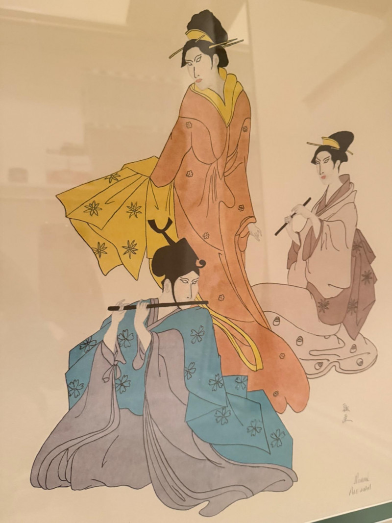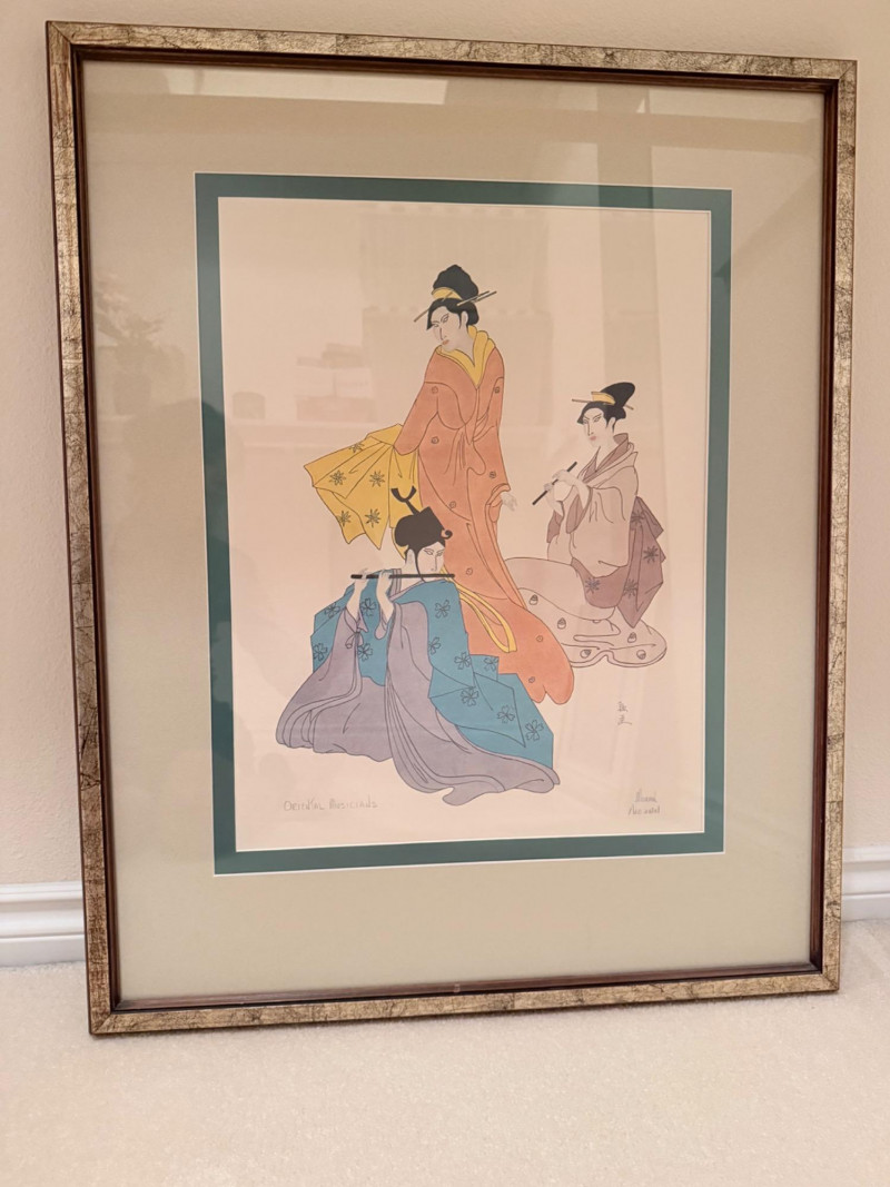 Oriental Musicians –Signed Pat Moran Watercolor and Pencil Drawing Two watercolor and pencil works on paper depicting traditional Japanese musicians in formal dress. One figure holds a flute, while the other appears in mid-performance. The images are rendered with flowing lines and filled color washes, framed under glass in a textured metallic frame. Both are signed in pencil, one marked “Moran” and the other inscribed in Japanese characters. The label reads “Oriental Musicians.” Artist: Pat Moran