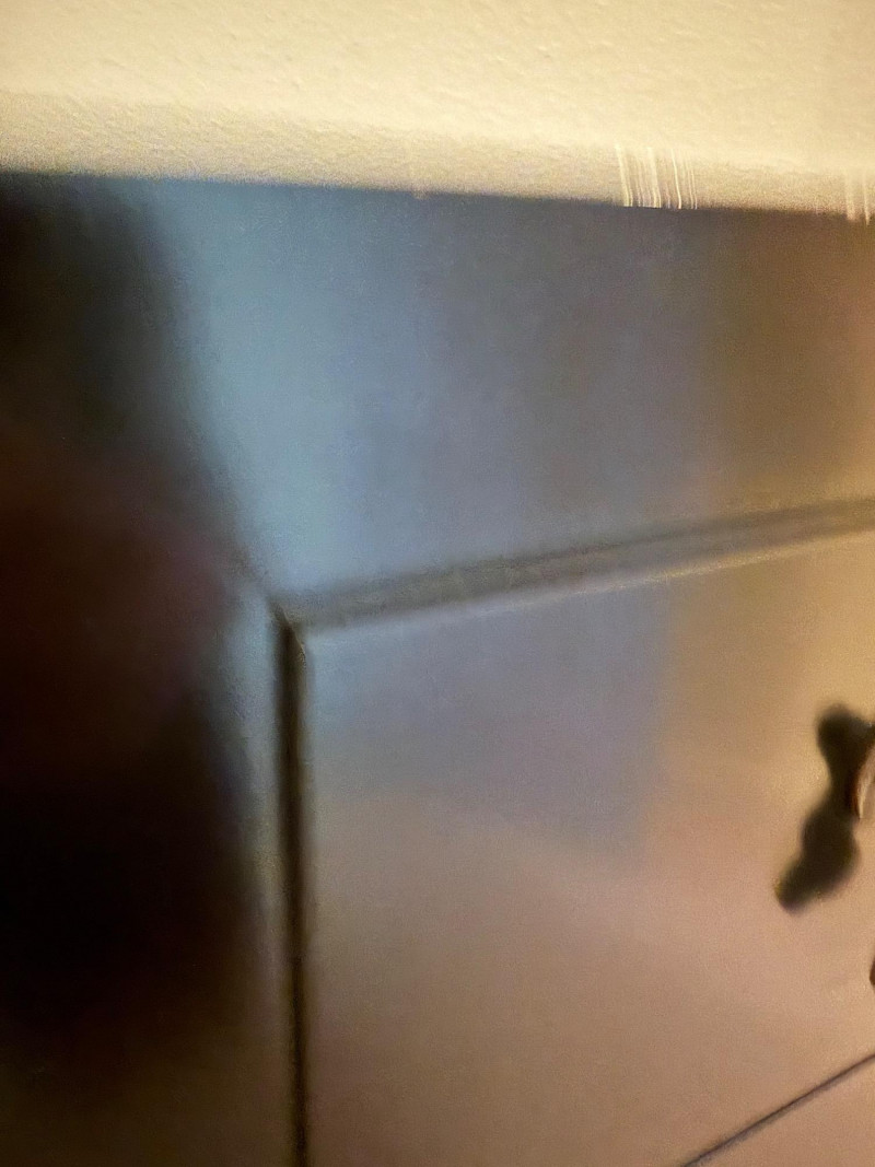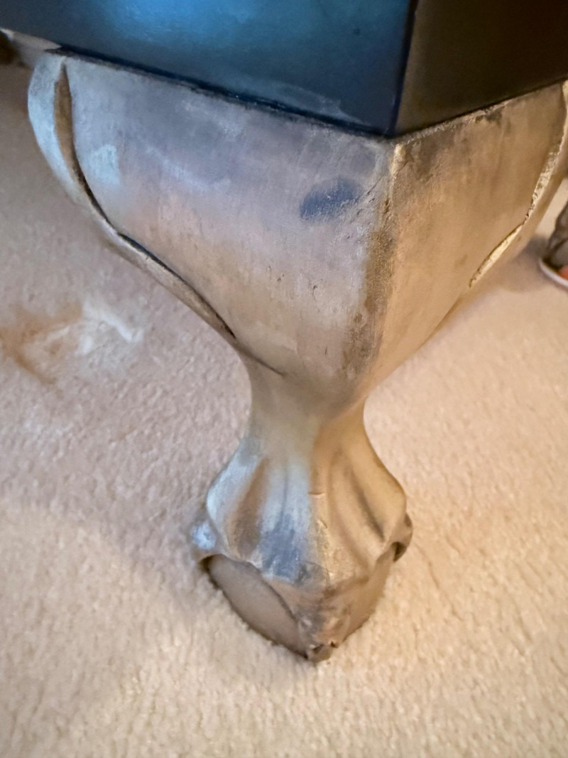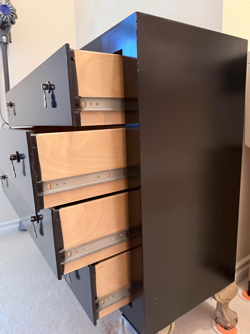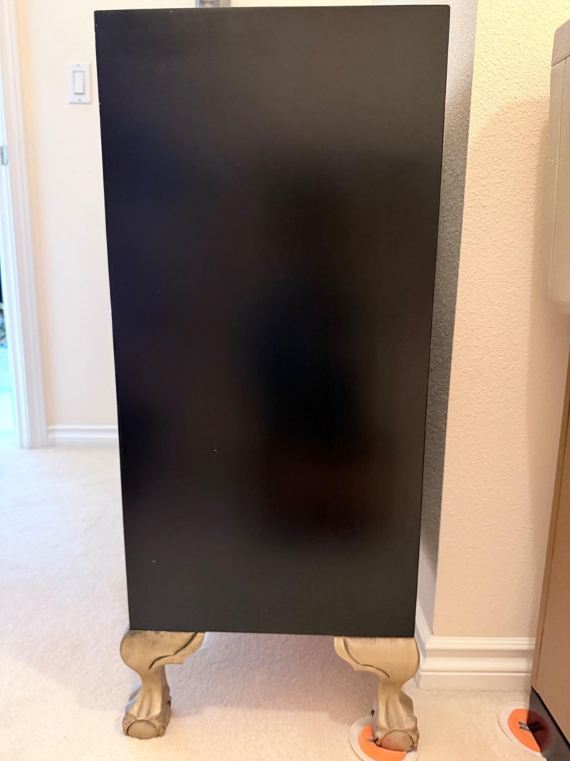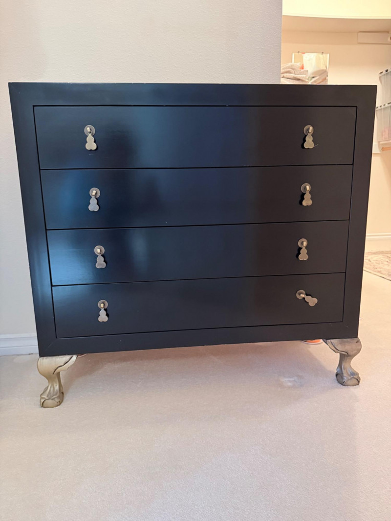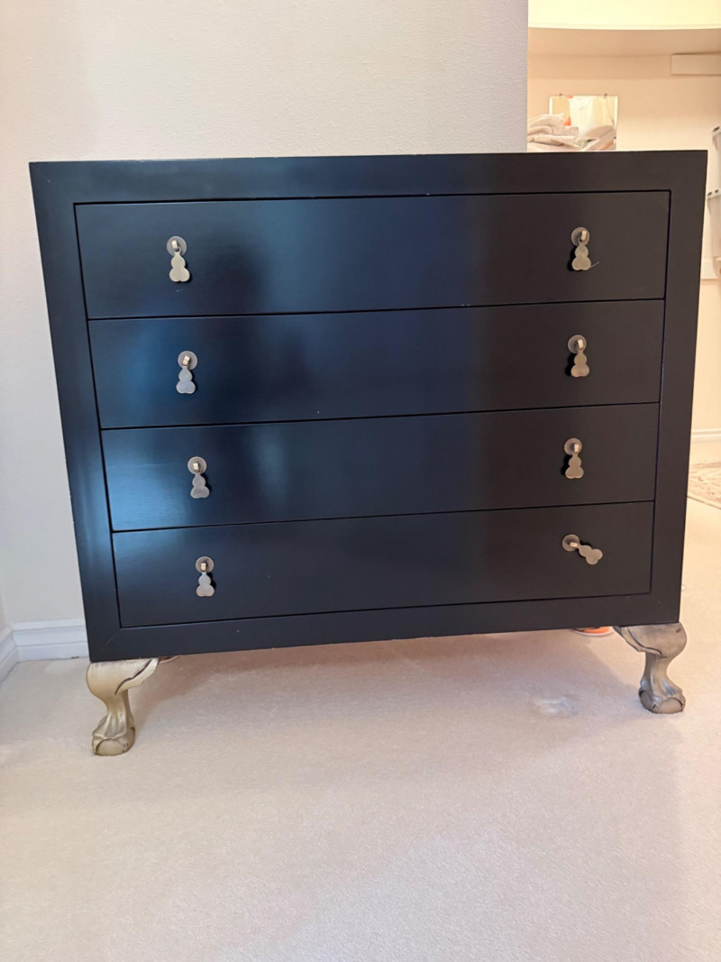 Vintage Chest of Drawers Four-drawer chest with black painted surface and drop pull handles. The drawer interiors are unfinished light wood with metal glides. The piece is supported by four sculpted claw-style legs with a metallic finish. Dimensions: 33" H x 36" W x 14" D