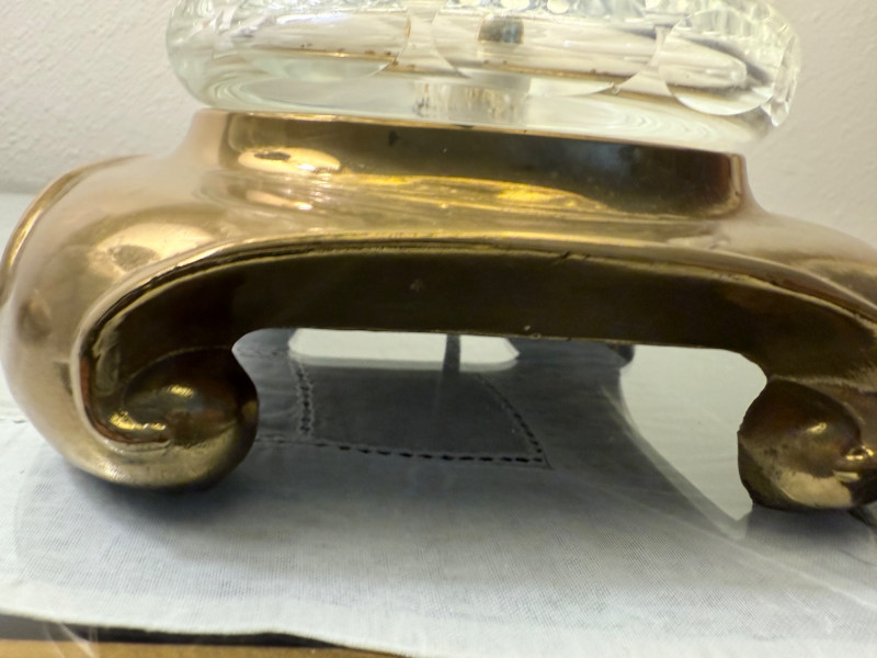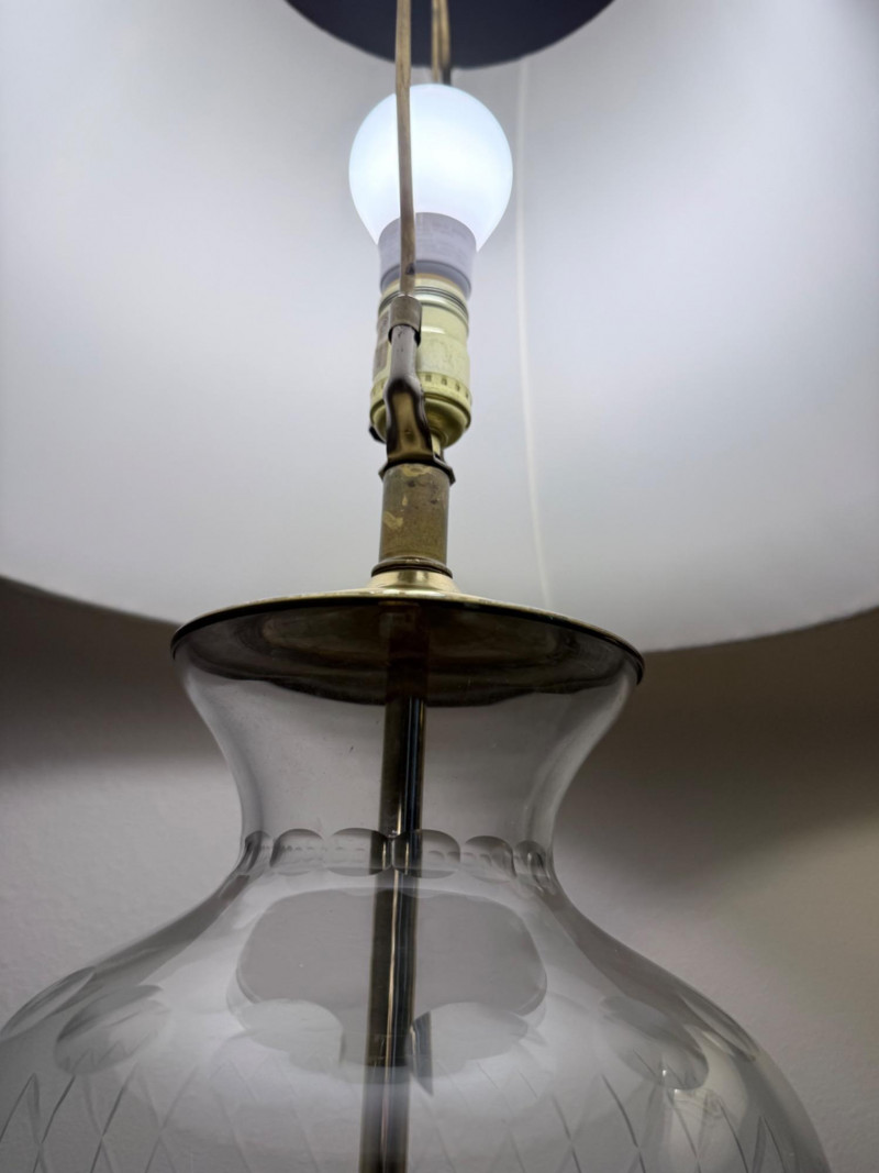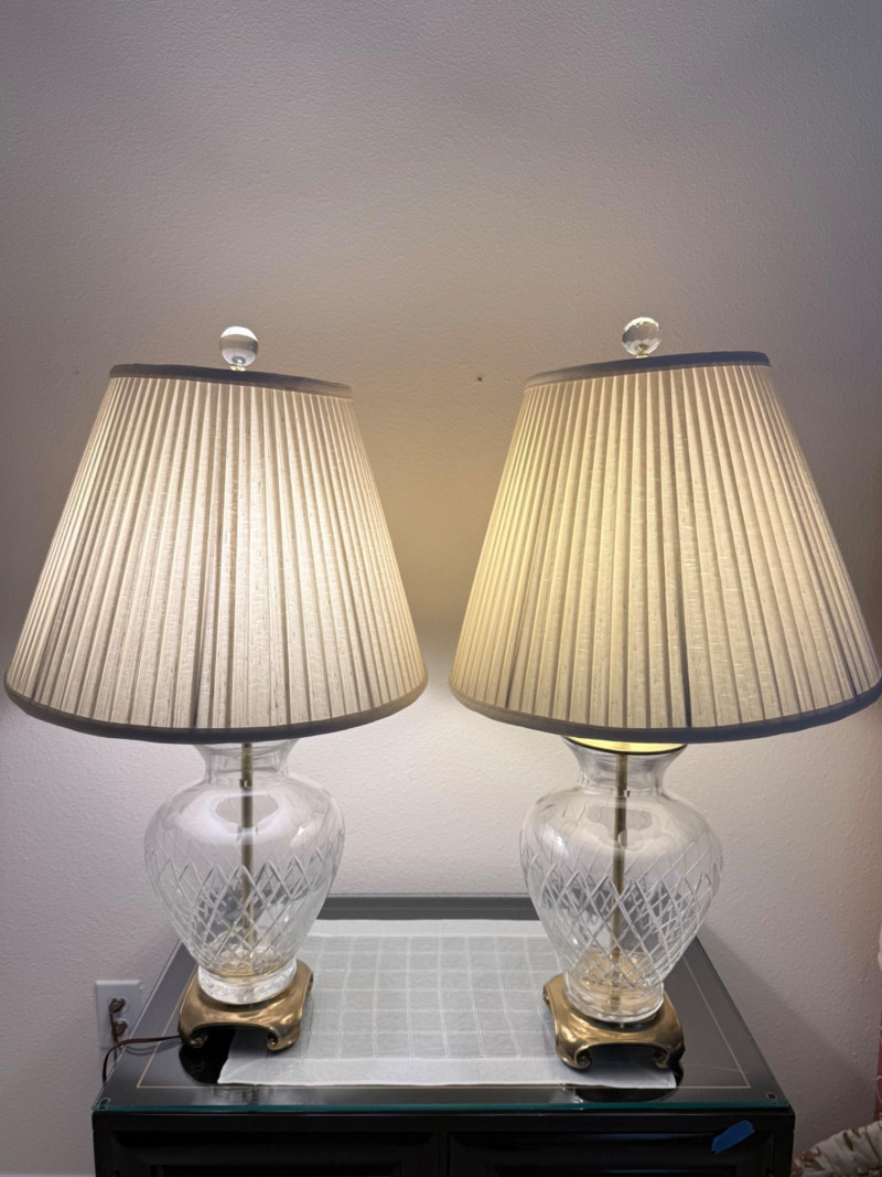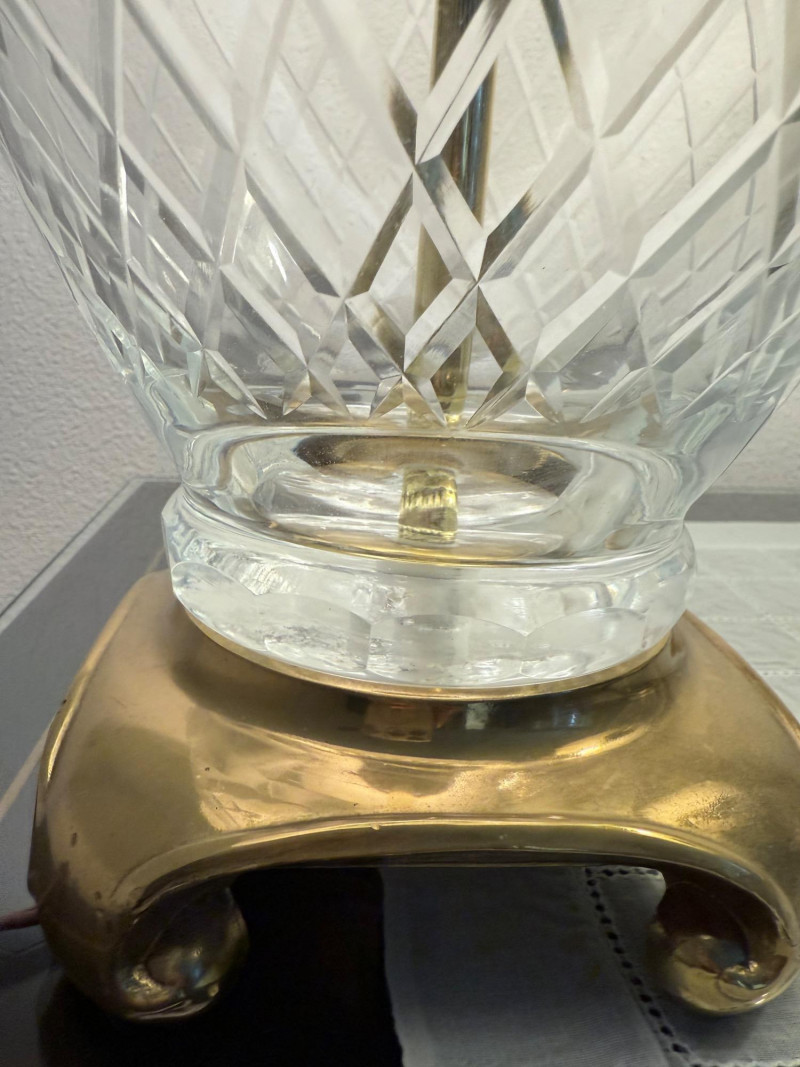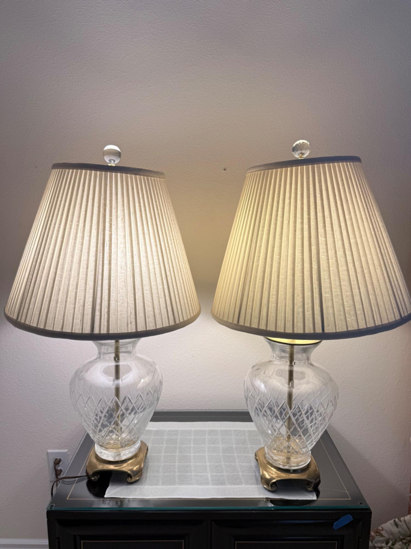Pair of Cut Glass Table Lamps with Brass Base Two matching table lamps each with a clear glass body featuring a crosshatch pattern. The glass sections are mounted on square brass bases with curved feet. The lamps are fitted with pleated fabric shades and topped with faceted crystal finials. Two different types of bulbs are being used so the shade coloring appears different. Dimensions: 15" W x 31" H