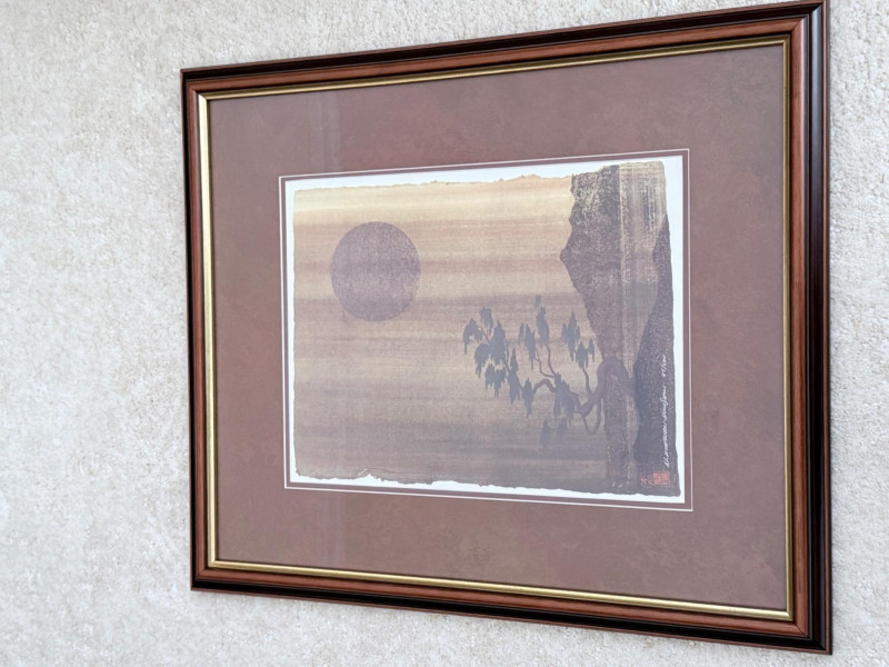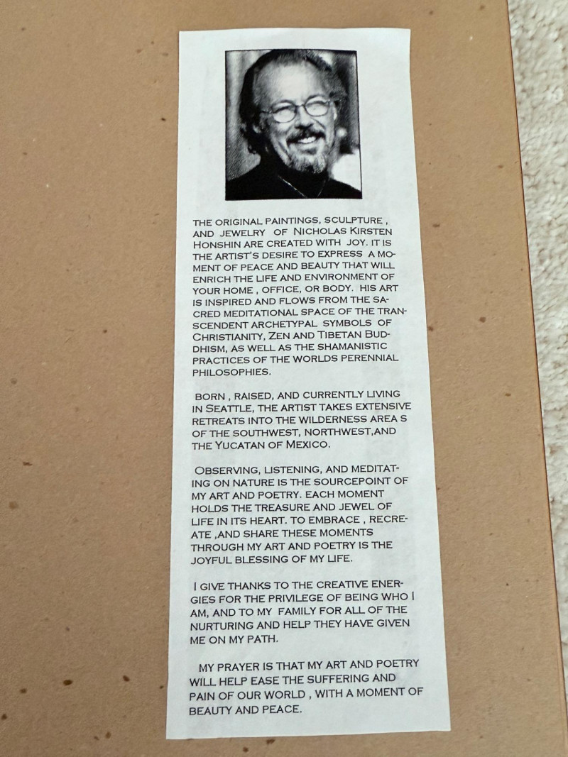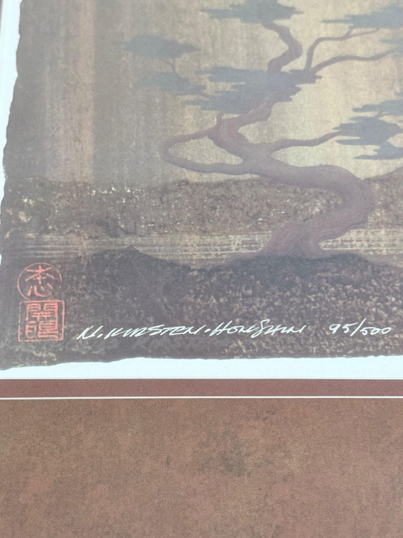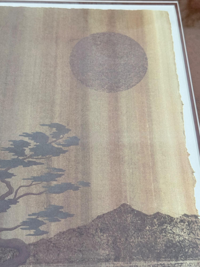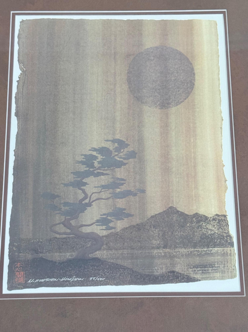 Framed Limited Edition Print by Nicholas Kirsten Honshin A signed and numbered limited edition print by Nicholas Kirsten Honshin, numbered 95/500. The image features a composition with a mountainous horizon, silhouetted tree forms, and a full circular element above, arranged on a vertically textured field. The artist’s signature and edition number appear beneath traditional seals. The piece is matted and framed under glass with a double mat in coordinated tones and a wood frame with gold inner trim. Nicholas Kirsten Honshin is a Seattle-based artist whose work draws from Christian, Zen, and Tibetan Buddhist symbols, as well as shamanic traditions. His art often reflects themes of meditation, nature, and spiritual unity, aiming to convey moments of peace and reflection. Dimensions: