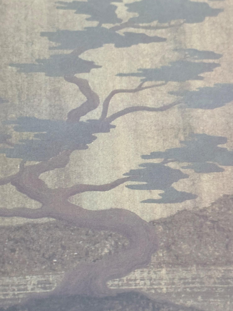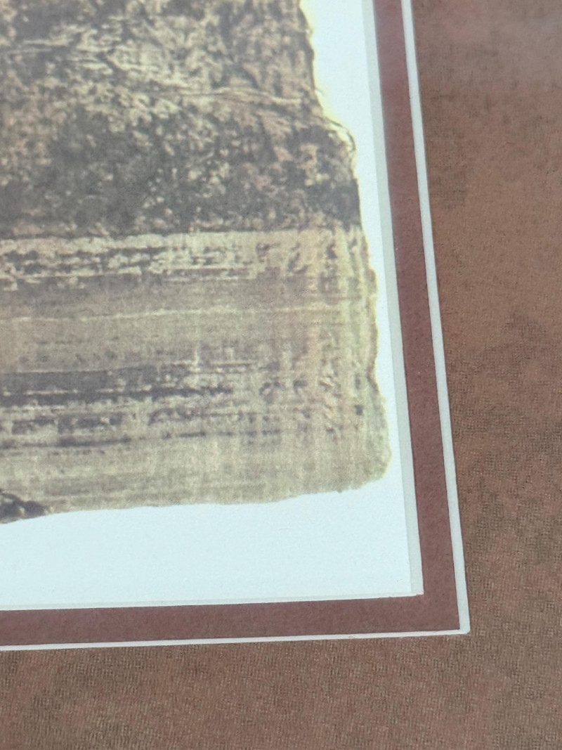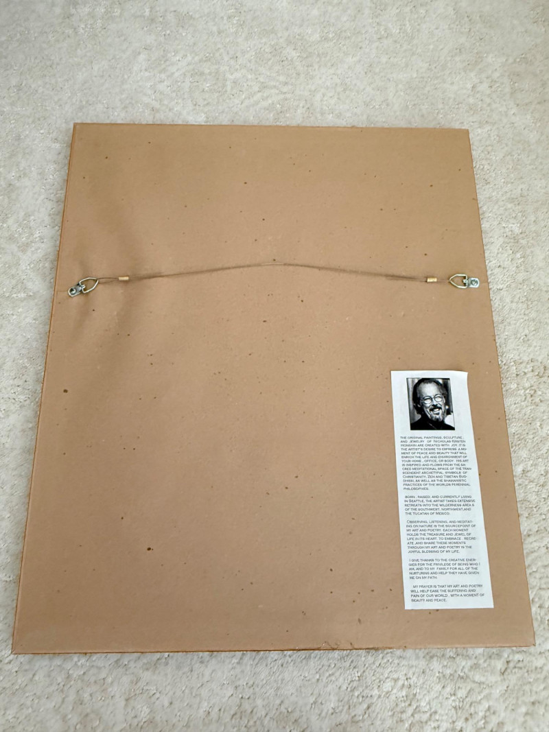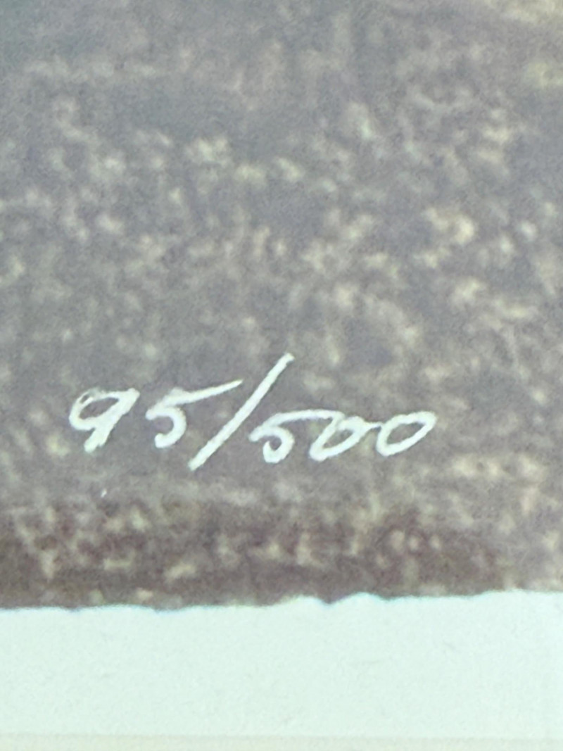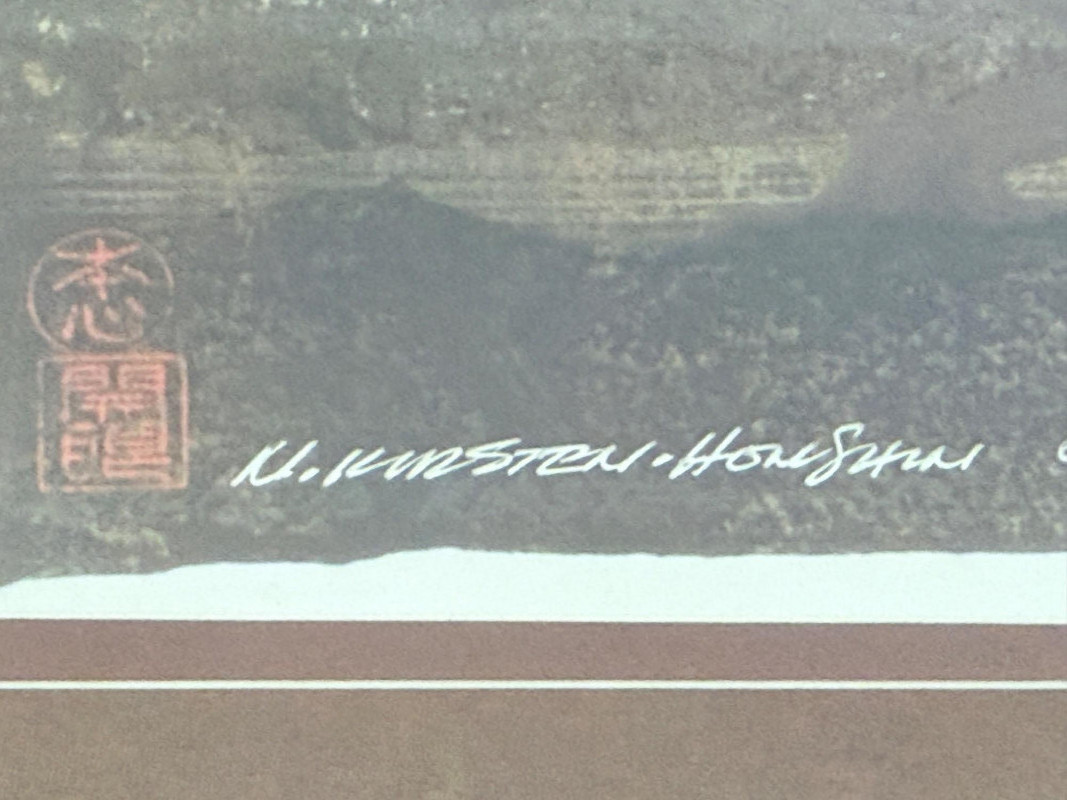 Framed Limited Edition Print by Nicholas Kirsten Honshin A signed and numbered limited edition print by Nicholas Kirsten Honshin, numbered 95/500. The image features a composition with a mountainous horizon, silhouetted tree forms, and a full circular element above, arranged on a vertically textured field. The artist’s signature and edition number appear beneath traditional seals. The piece is matted and framed under glass with a double mat in coordinated tones and a wood frame with gold inner trim. Nicholas Kirsten Honshin is a Seattle-based artist whose work draws from Christian, Zen, and Tibetan Buddhist symbols, as well as shamanic traditions. His art often reflects themes of meditation, nature, and spiritual unity, aiming to convey moments of peace and reflection. Dimensions: