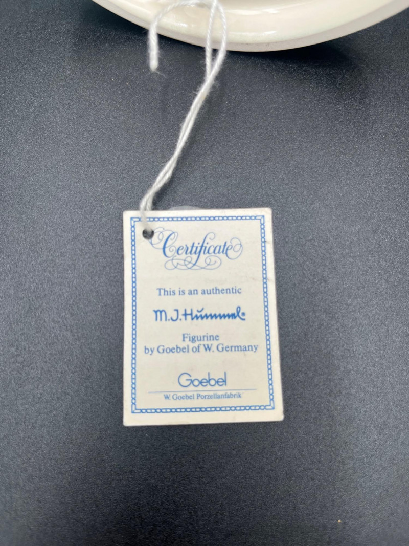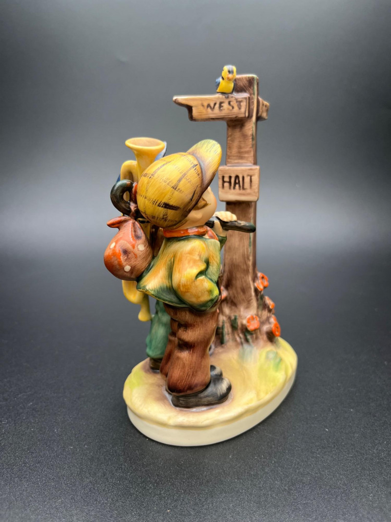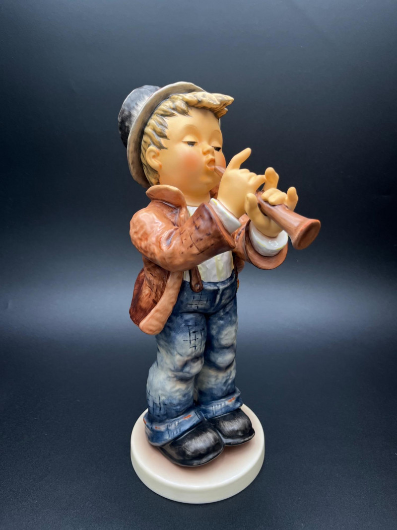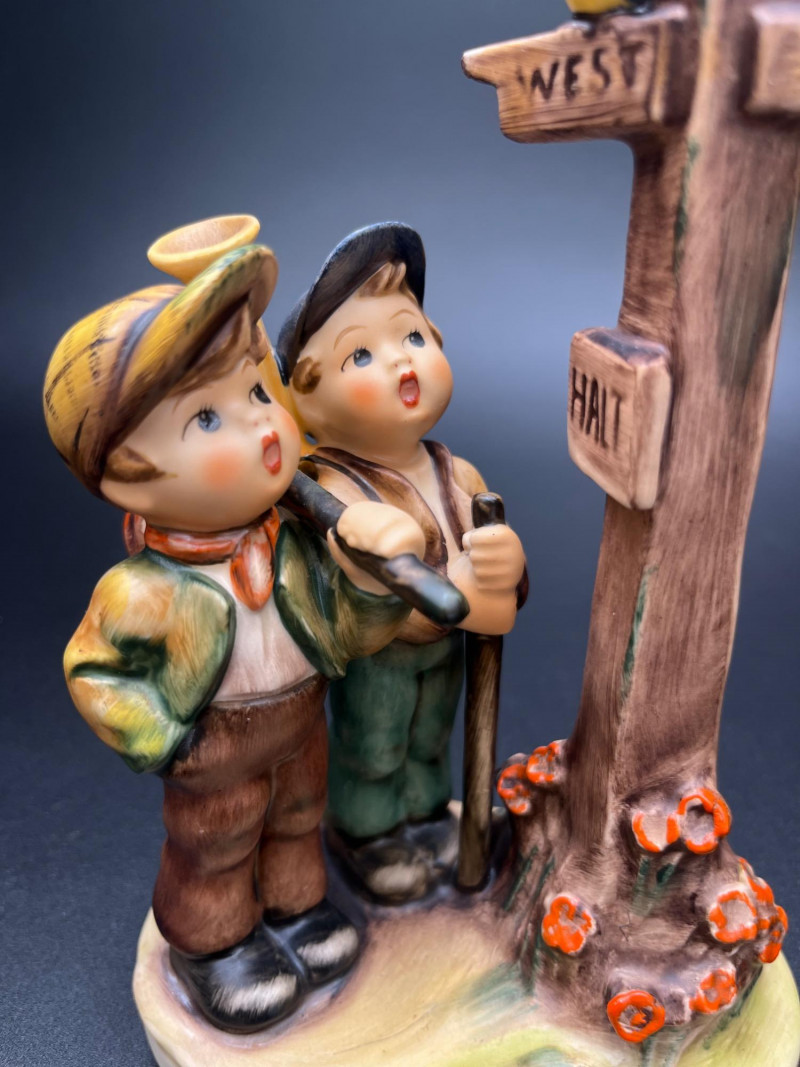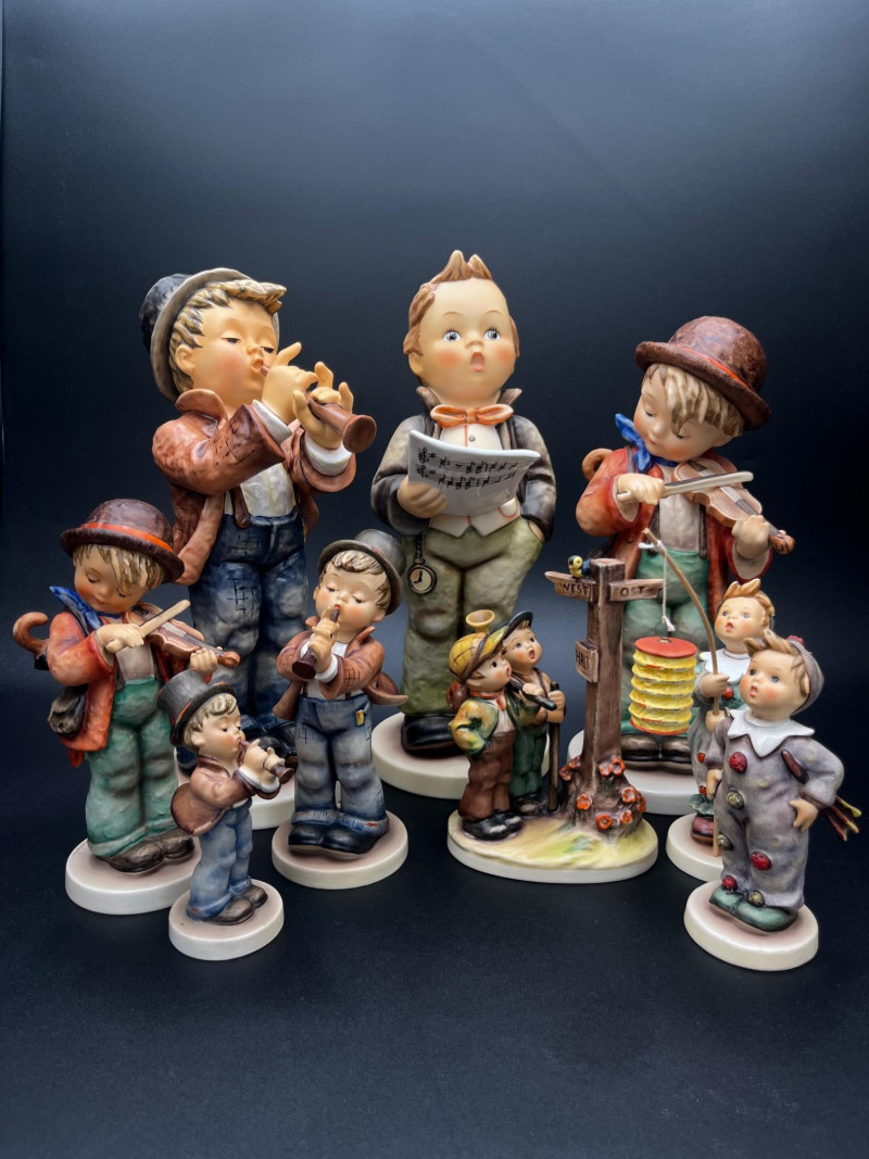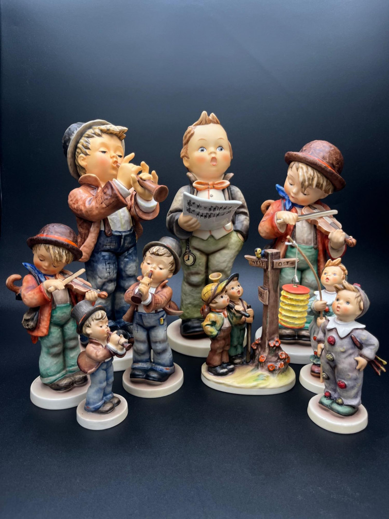 Goebel Hummel Figurine Collection A group of nine porcelain figurines crafted by Goebel in Germany, each depicting children in various poses with musical instruments, lanterns, or travel gear. The figures include scenes of performance, exploration, and storytelling. Most are signed and feature Goebel markings at the base, with some accompanied by certificates of authenticity. The figures vary in posture and detail, capturing moments such as playing a trumpet, reading sheet music, or pointing a lantern. Measurements:
