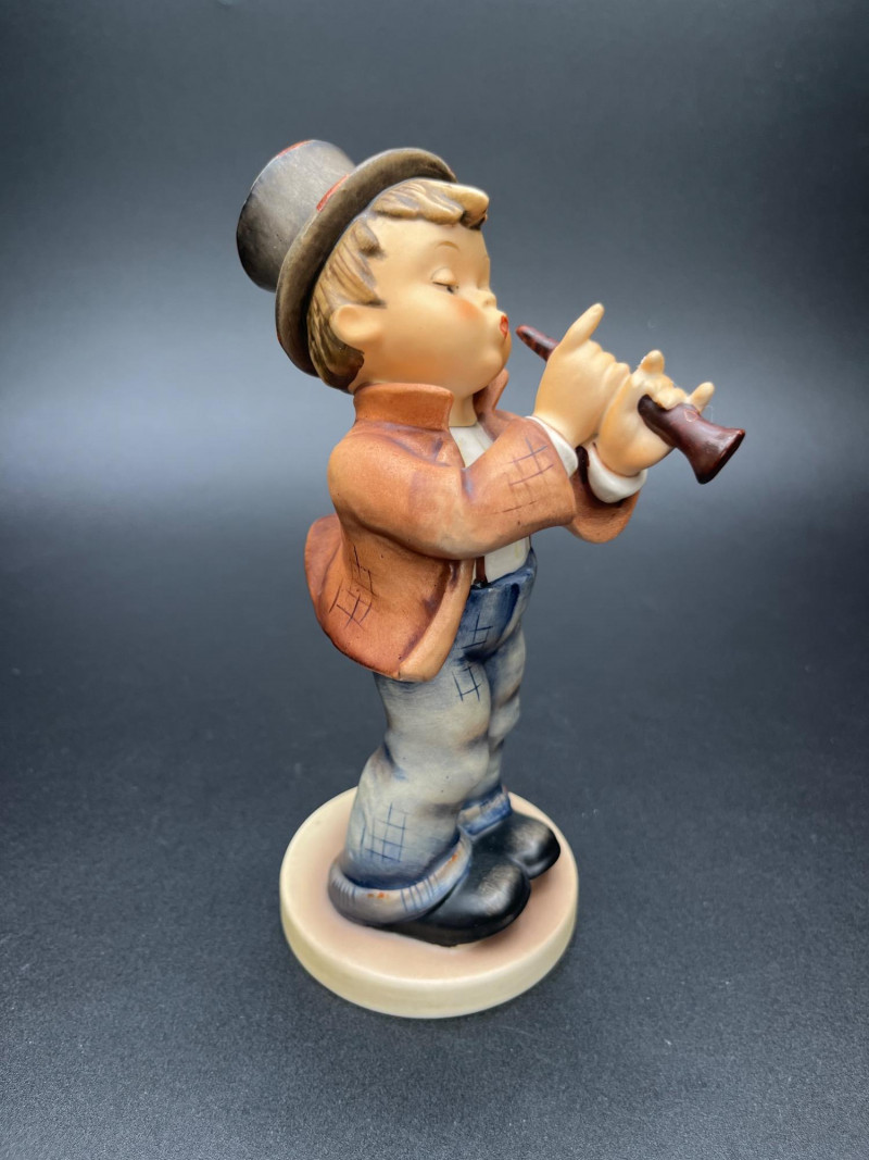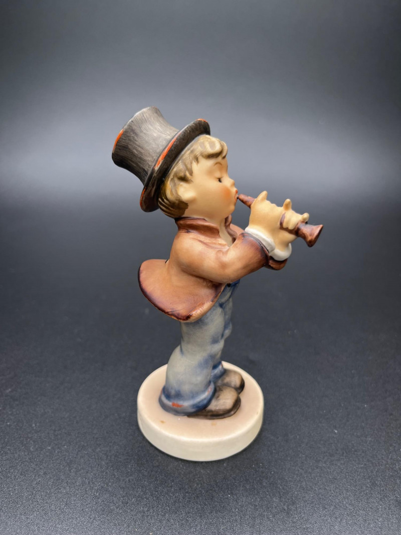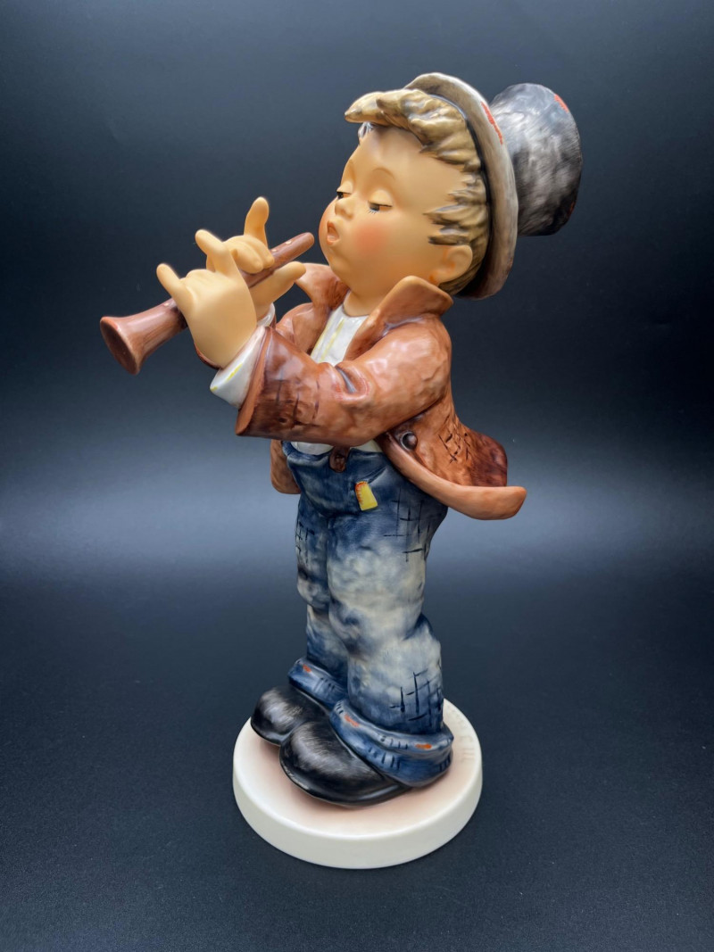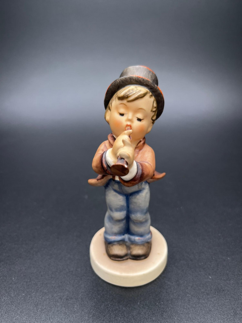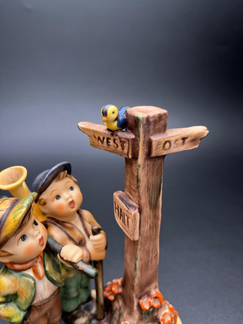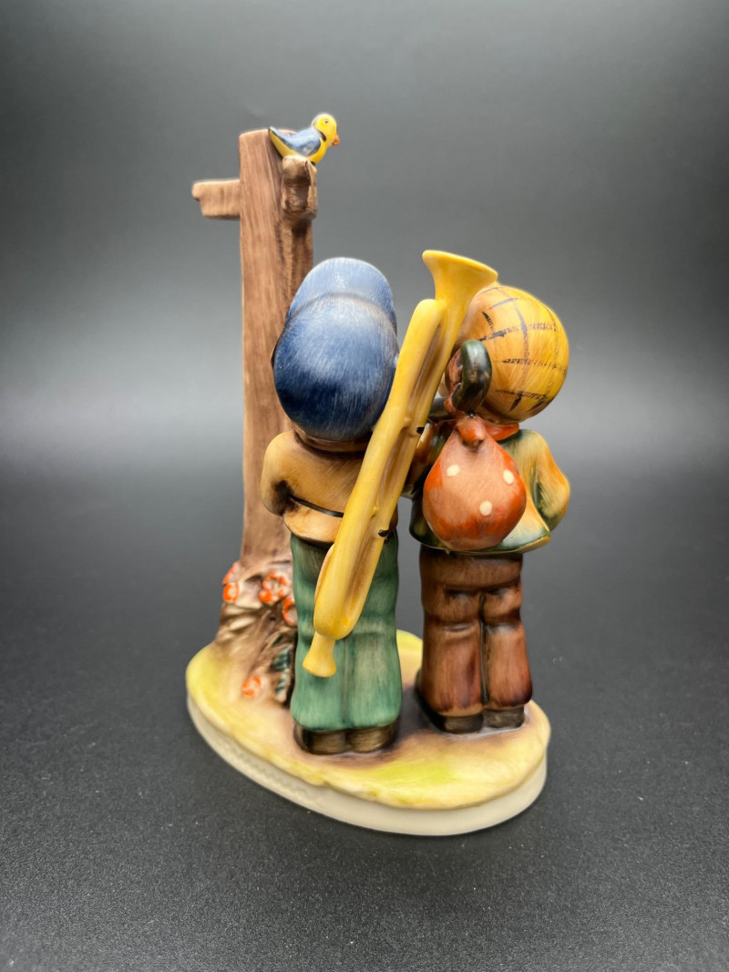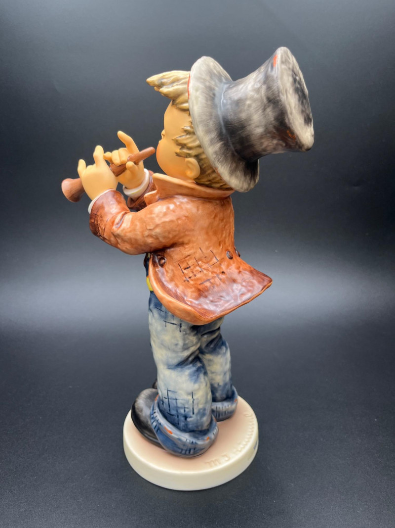 Goebel Hummel Figurine Collection A group of nine porcelain figurines crafted by Goebel in Germany, each depicting children in various poses with musical instruments, lanterns, or travel gear. The figures include scenes of performance, exploration, and storytelling. Most are signed and feature Goebel markings at the base, with some accompanied by certificates of authenticity. The figures vary in posture and detail, capturing moments such as playing a trumpet, reading sheet music, or pointing a lantern. Measurements: