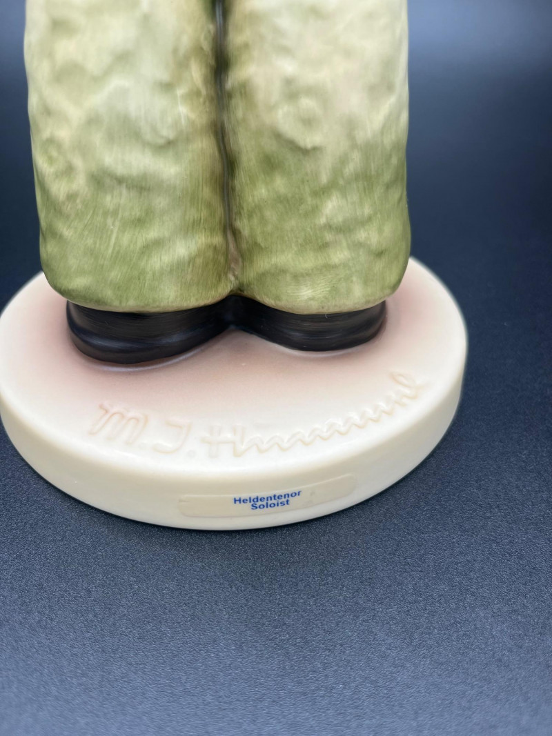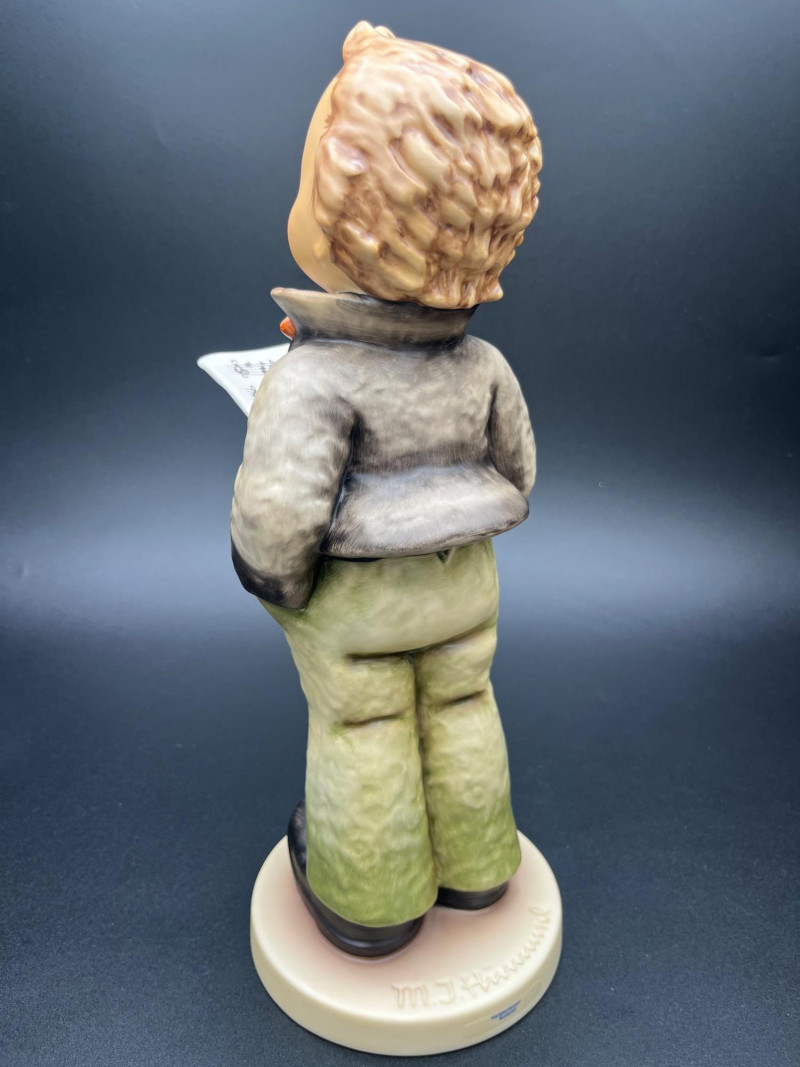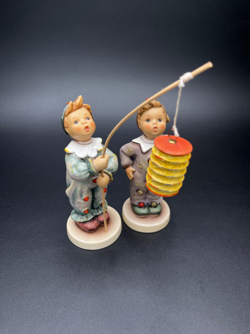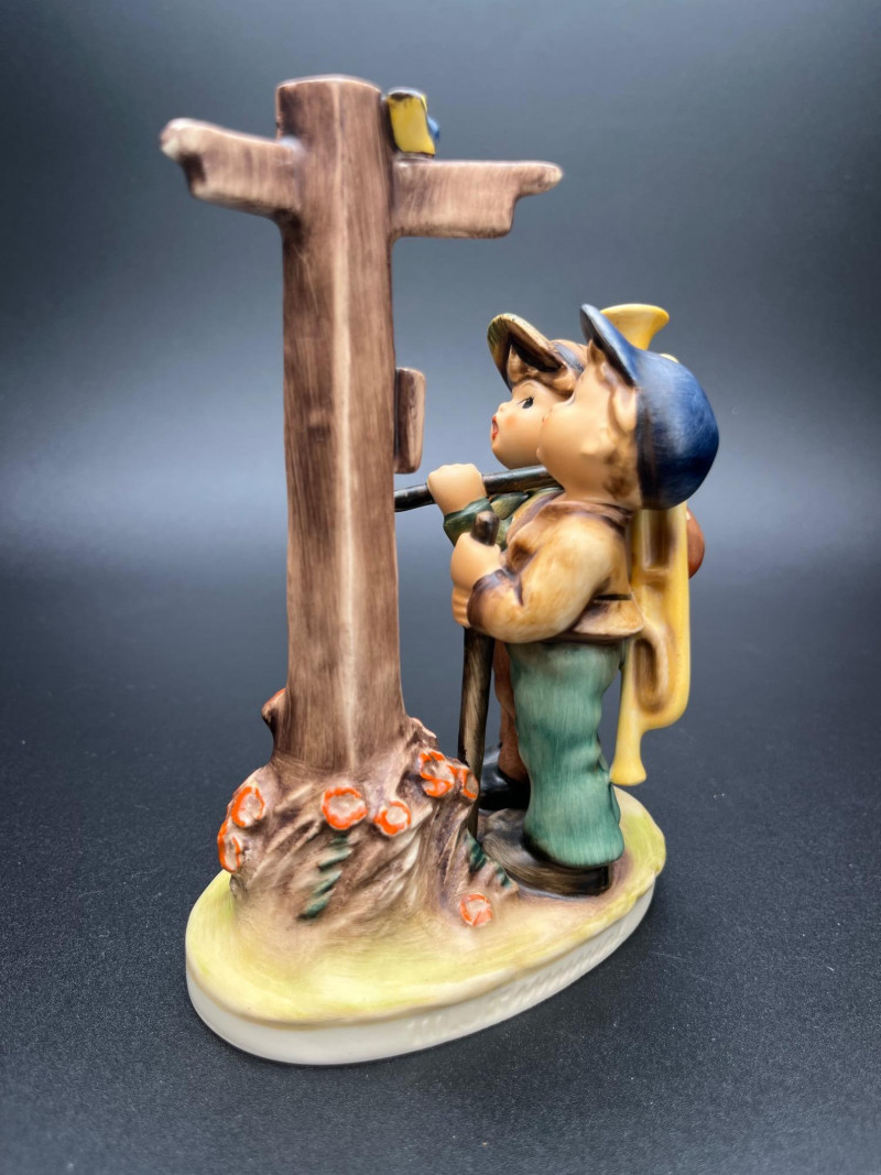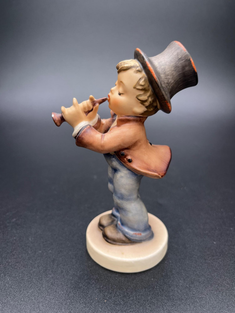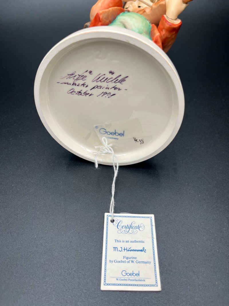 Goebel Hummel Figurine Collection A group of nine porcelain figurines crafted by Goebel in Germany, each depicting children in various poses with musical instruments, lanterns, or travel gear. The figures include scenes of performance, exploration, and storytelling. Most are signed and feature Goebel markings at the base, with some accompanied by certificates of authenticity. The figures vary in posture and detail, capturing moments such as playing a trumpet, reading sheet music, or pointing a lantern. Measurements: