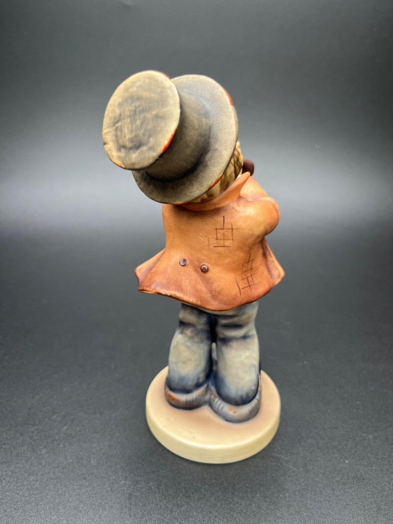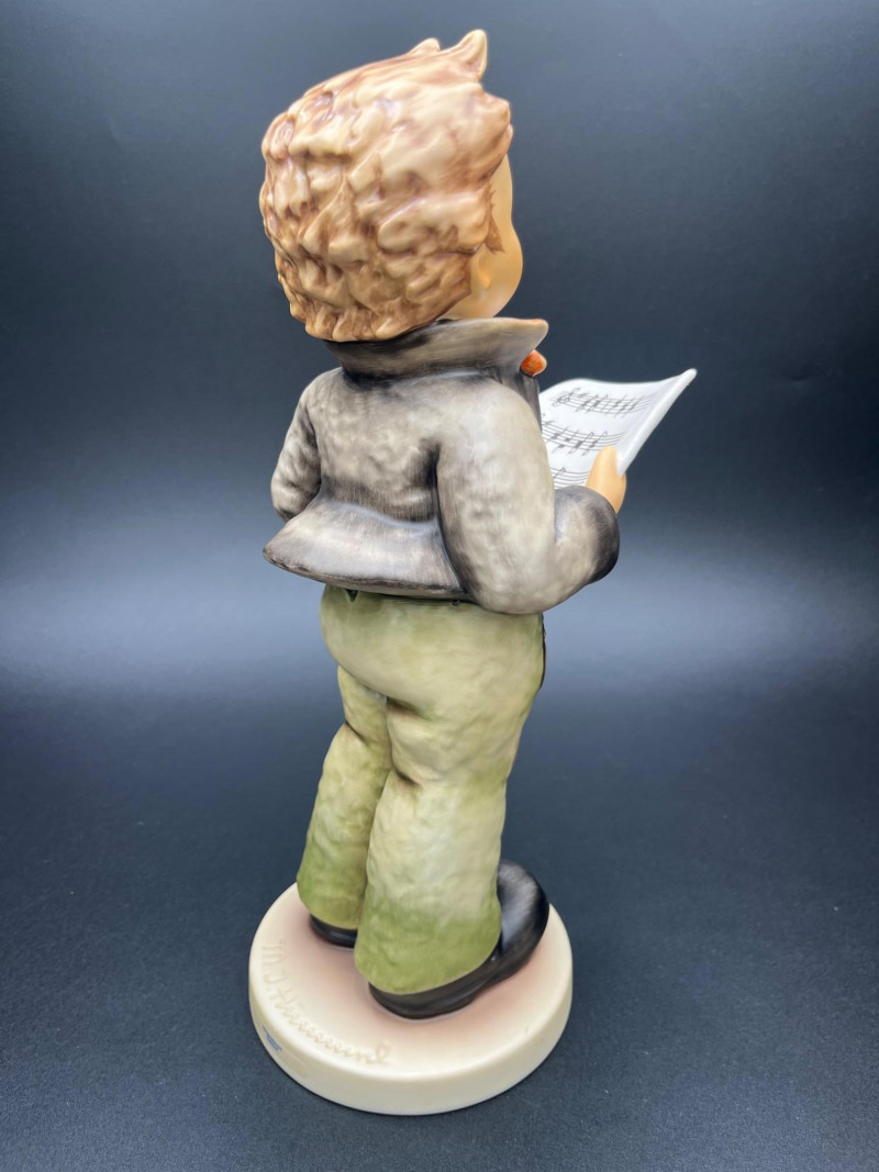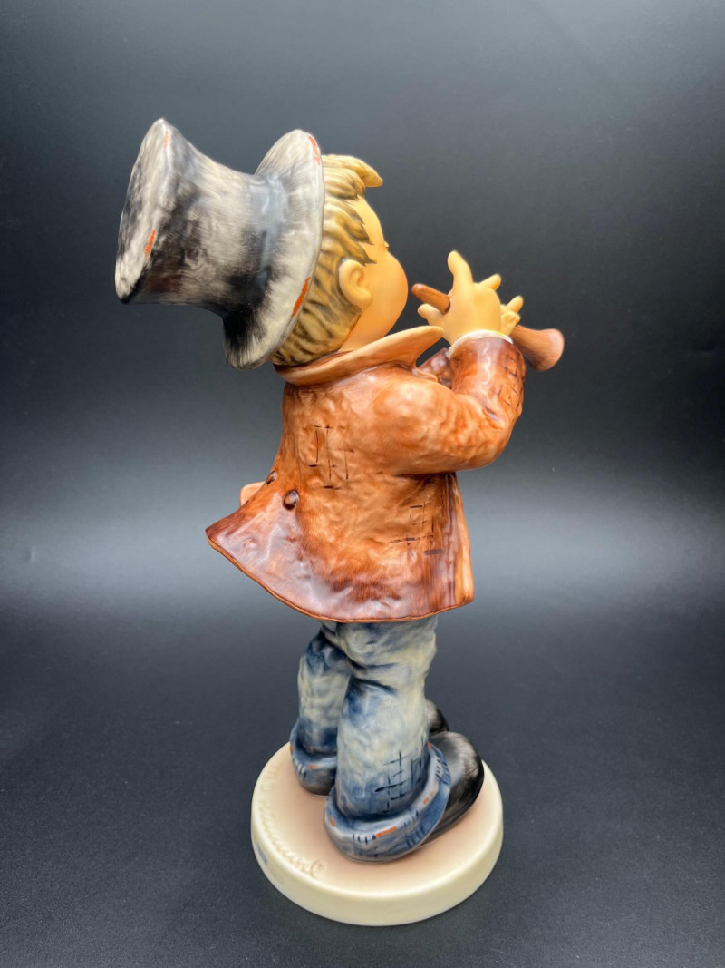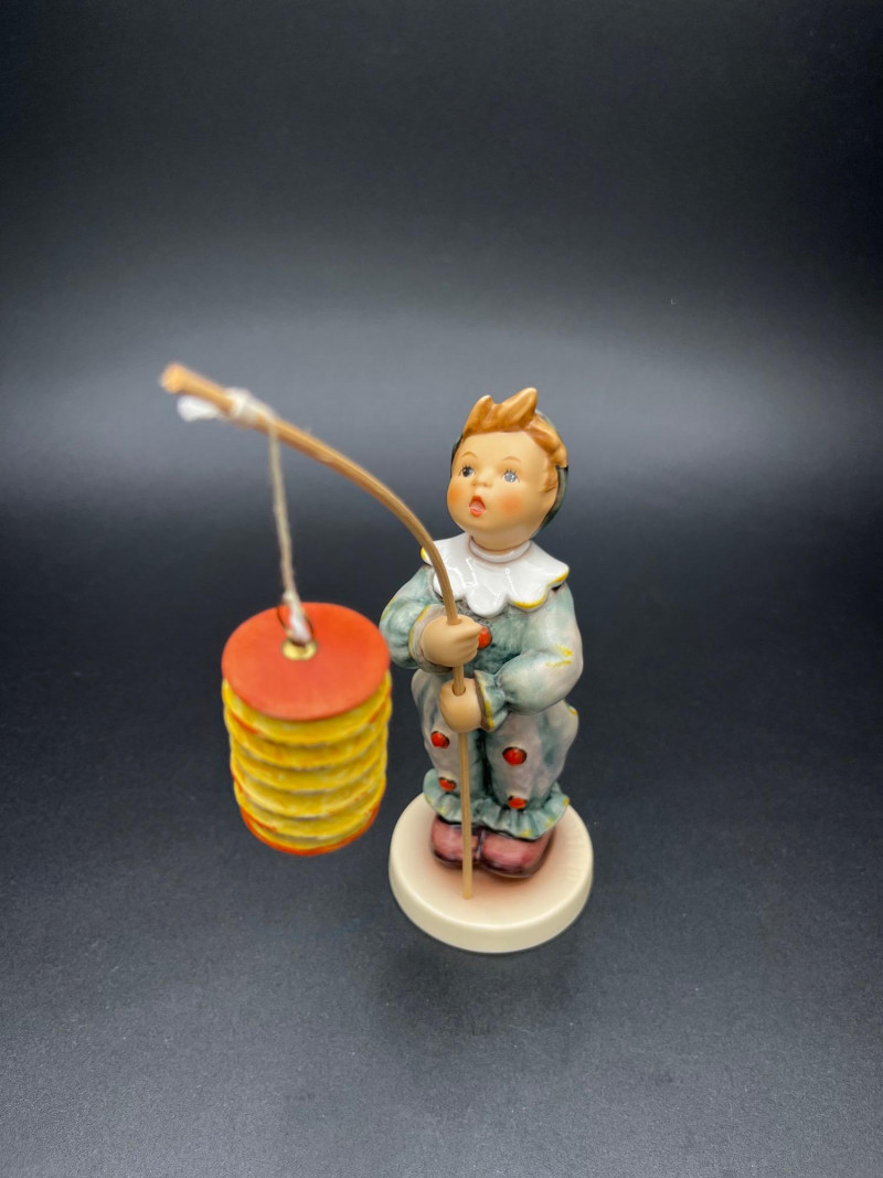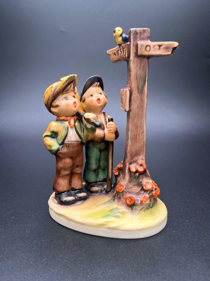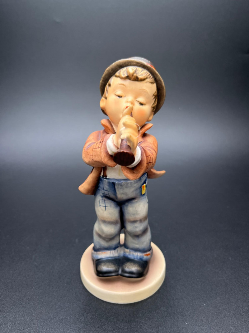 Goebel Hummel Figurine Collection A group of nine porcelain figurines crafted by Goebel in Germany, each depicting children in various poses with musical instruments, lanterns, or travel gear. The figures include scenes of performance, exploration, and storytelling. Most are signed and feature Goebel markings at the base, with some accompanied by certificates of authenticity. The figures vary in posture and detail, capturing moments such as playing a trumpet, reading sheet music, or pointing a lantern. Measurements: