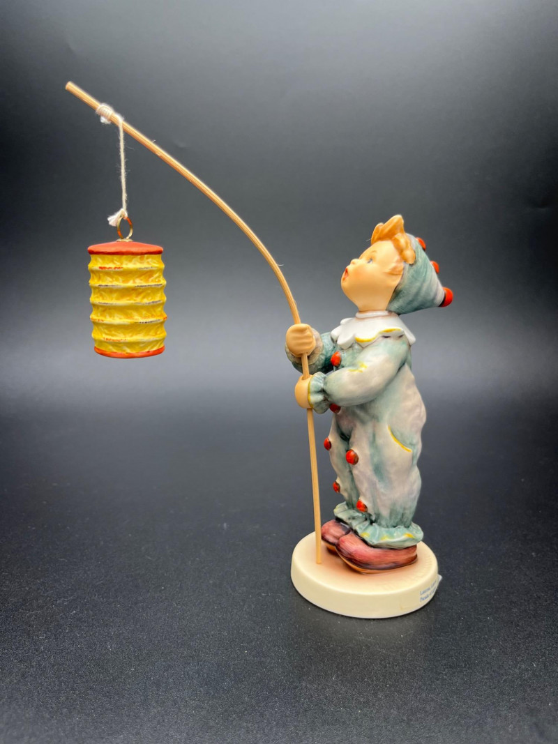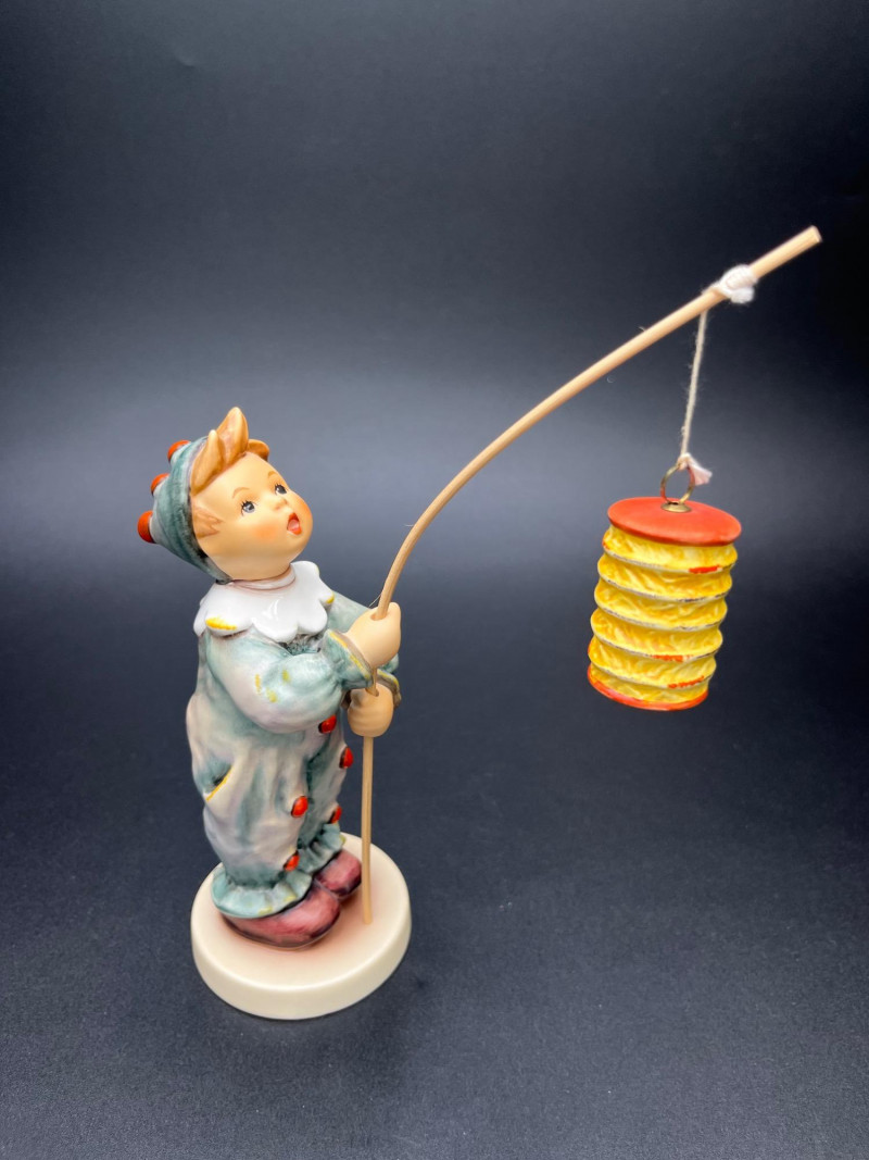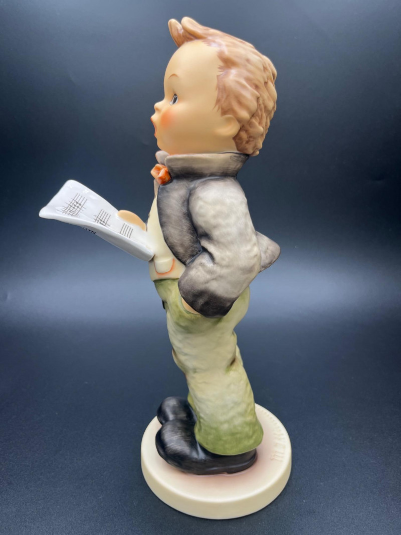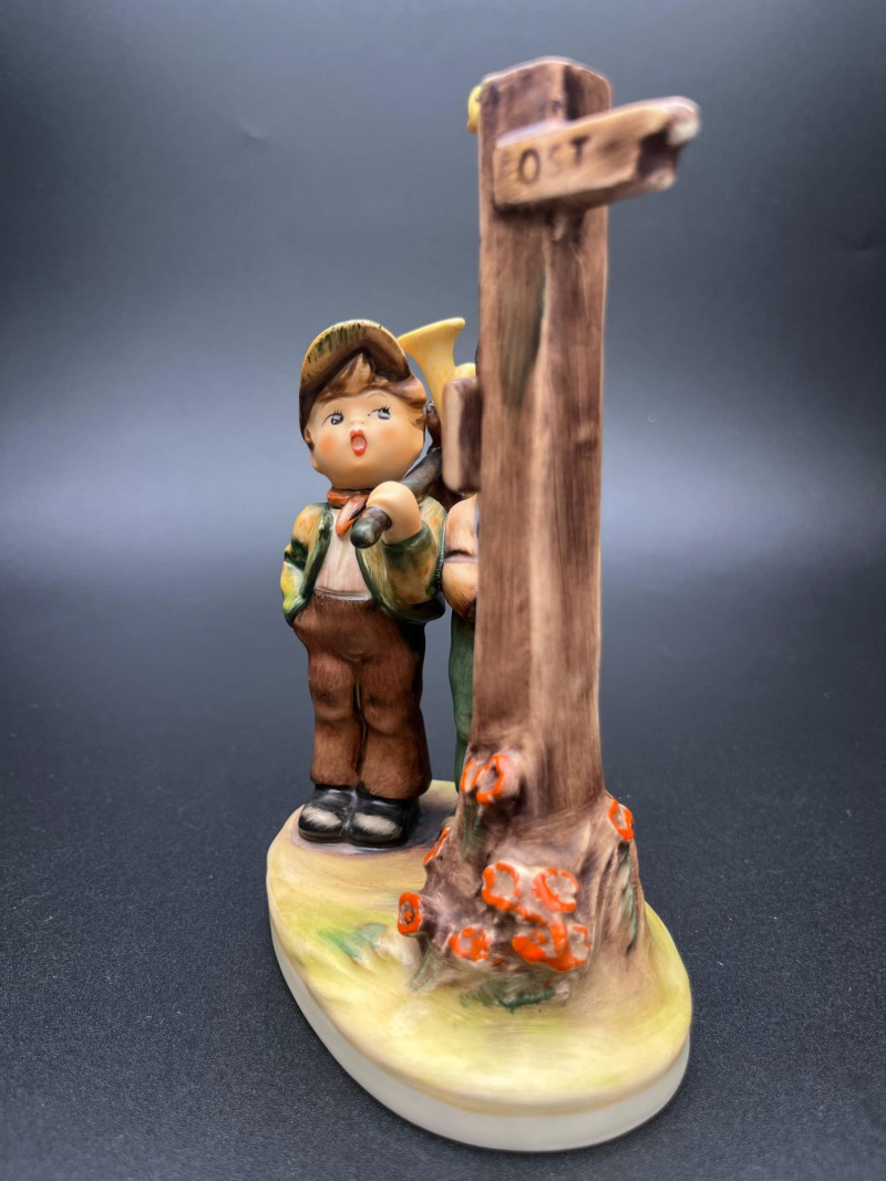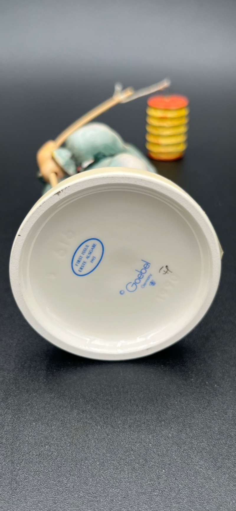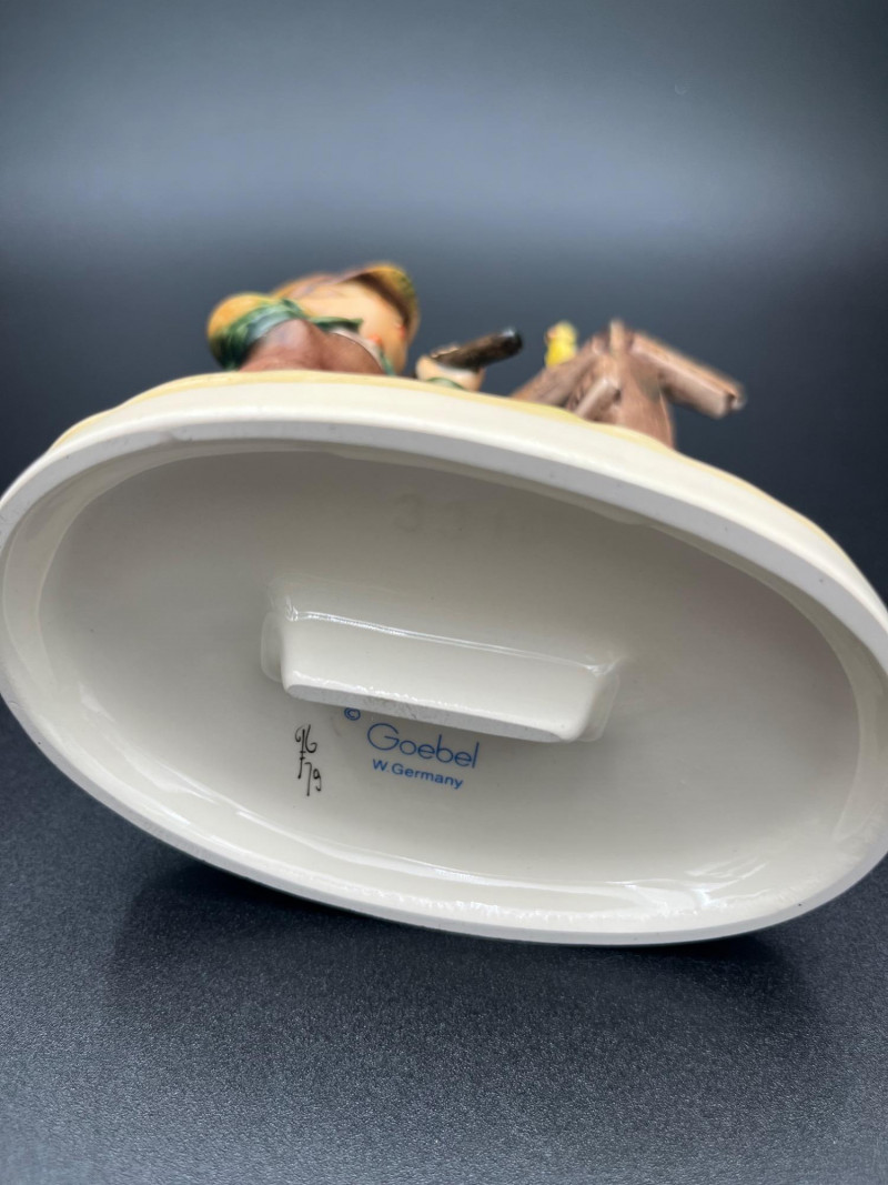 Goebel Hummel Figurine Collection A group of nine porcelain figurines crafted by Goebel in Germany, each depicting children in various poses with musical instruments, lanterns, or travel gear. The figures include scenes of performance, exploration, and storytelling. Most are signed and feature Goebel markings at the base, with some accompanied by certificates of authenticity. The figures vary in posture and detail, capturing moments such as playing a trumpet, reading sheet music, or pointing a lantern. Measurements: