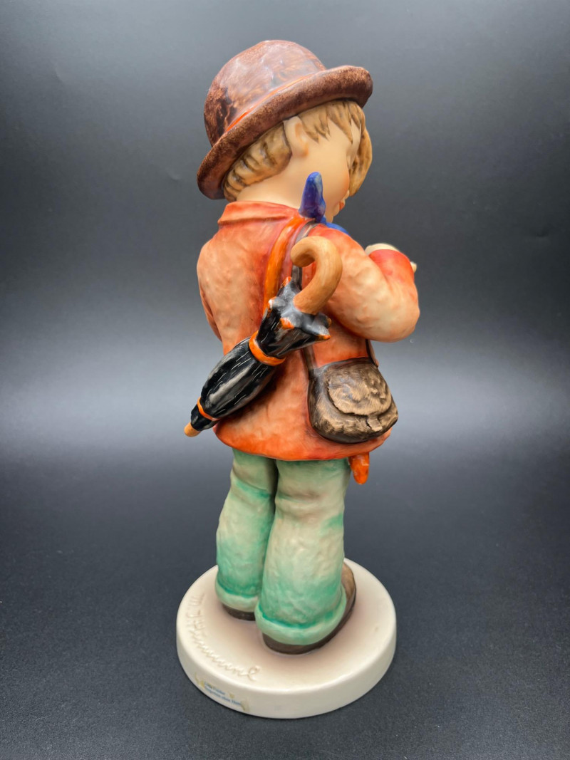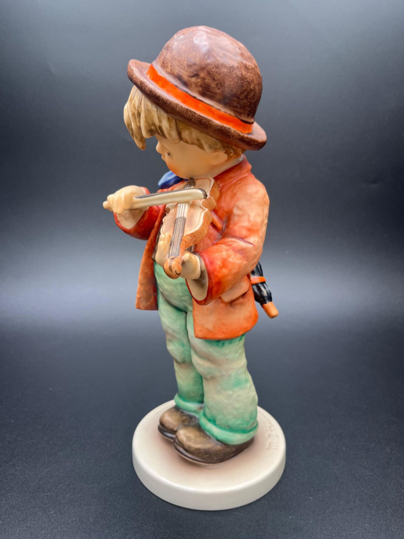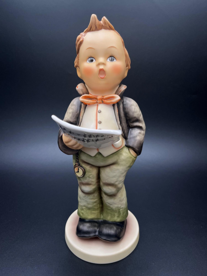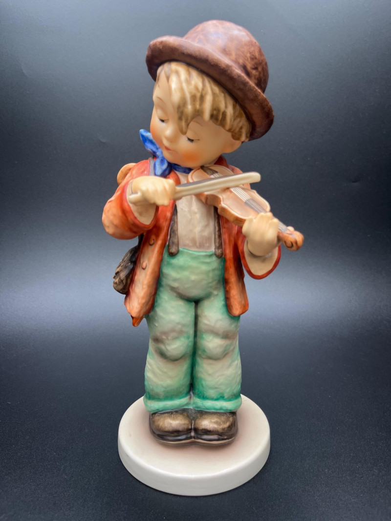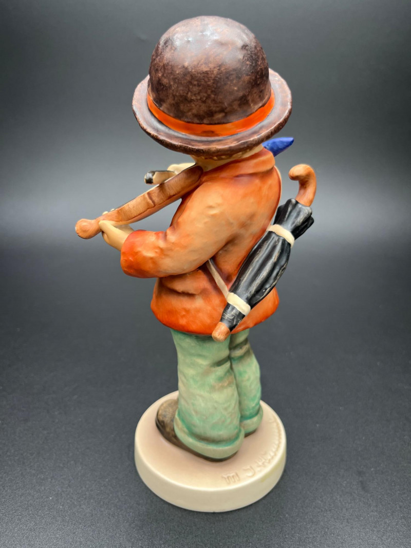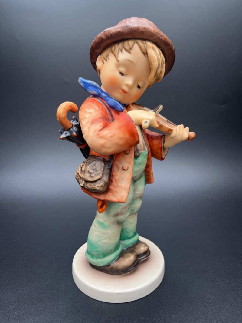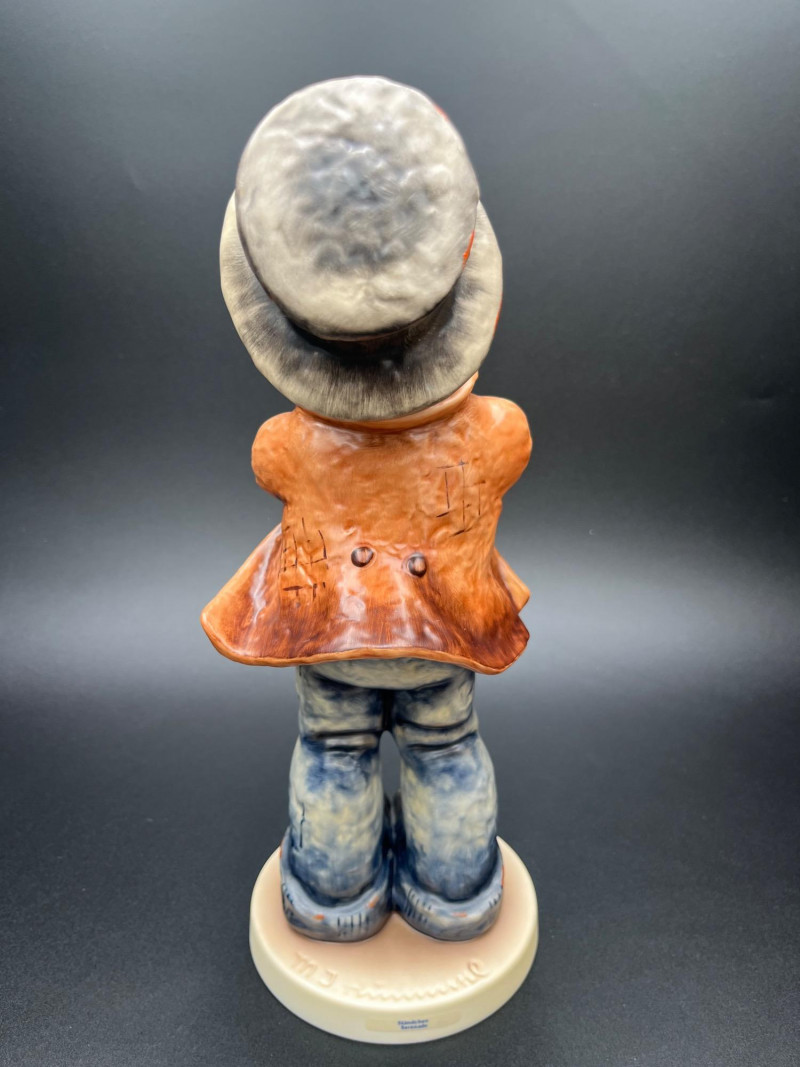 Goebel Hummel Figurine Collection A group of nine porcelain figurines crafted by Goebel in Germany, each depicting children in various poses with musical instruments, lanterns, or travel gear. The figures include scenes of performance, exploration, and storytelling. Most are signed and feature Goebel markings at the base, with some accompanied by certificates of authenticity. The figures vary in posture and detail, capturing moments such as playing a trumpet, reading sheet music, or pointing a lantern. Measurements: