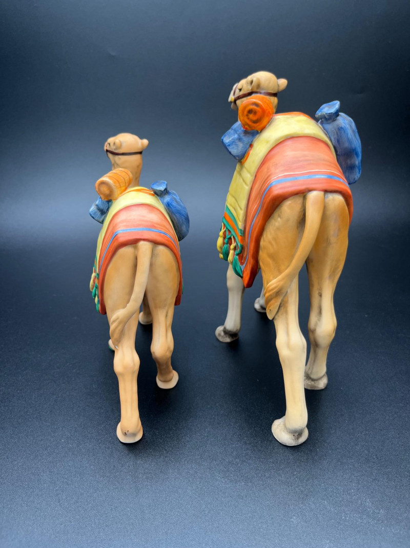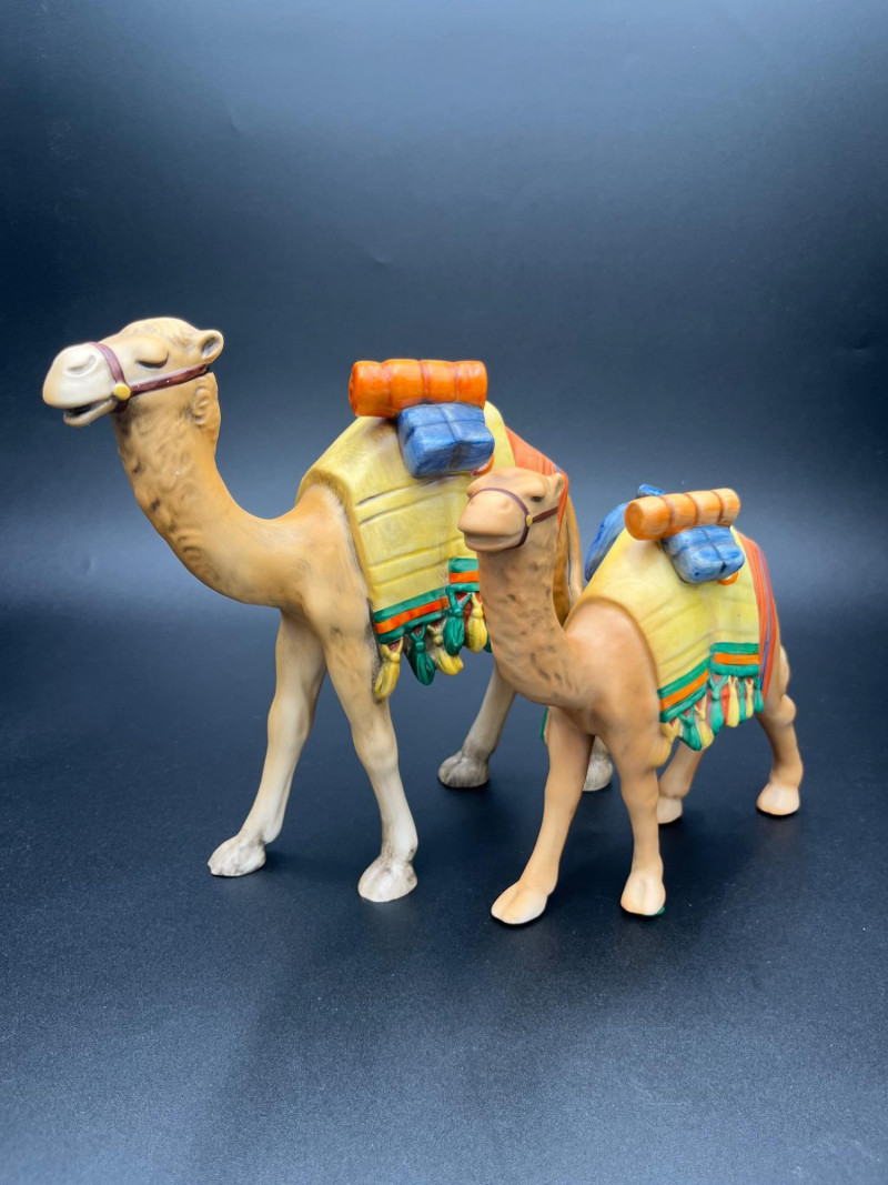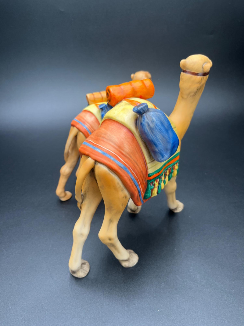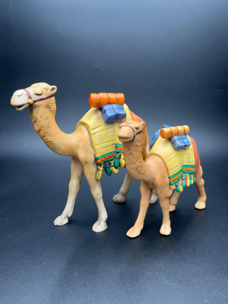 Goebel Camel Figurine Assortment A pair of ceramic camel figurines crafted with detailed pack elements and textured features. Each camel is shown carrying saddlebags and supplies draped in patterned cloths. The bases are marked with the Goebel stamp. Measurements: