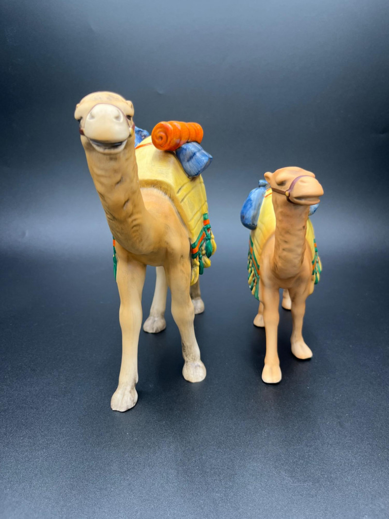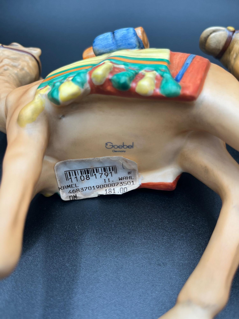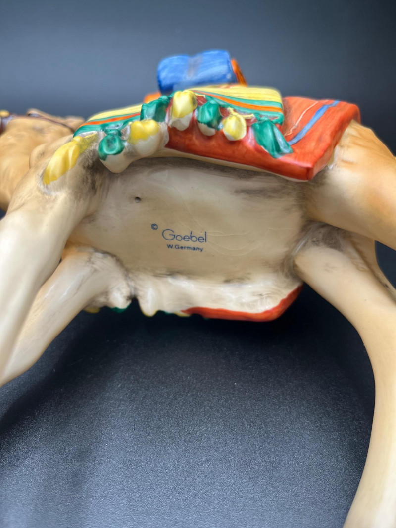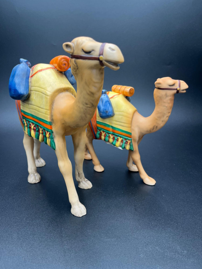 Goebel Camel Figurine Assortment A pair of ceramic camel figurines crafted with detailed pack elements and textured features. Each camel is shown carrying saddlebags and supplies draped in patterned cloths. The bases are marked with the Goebel stamp. Measurements:
