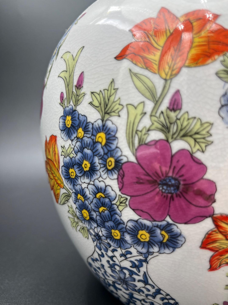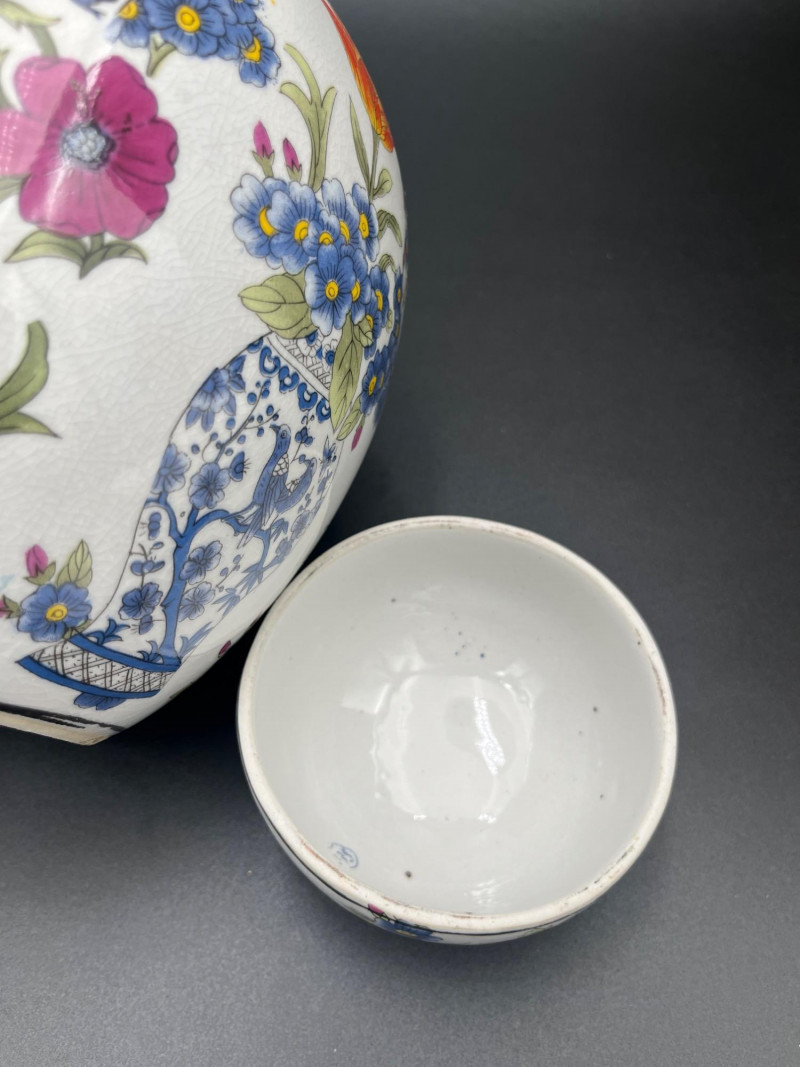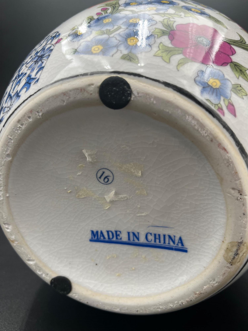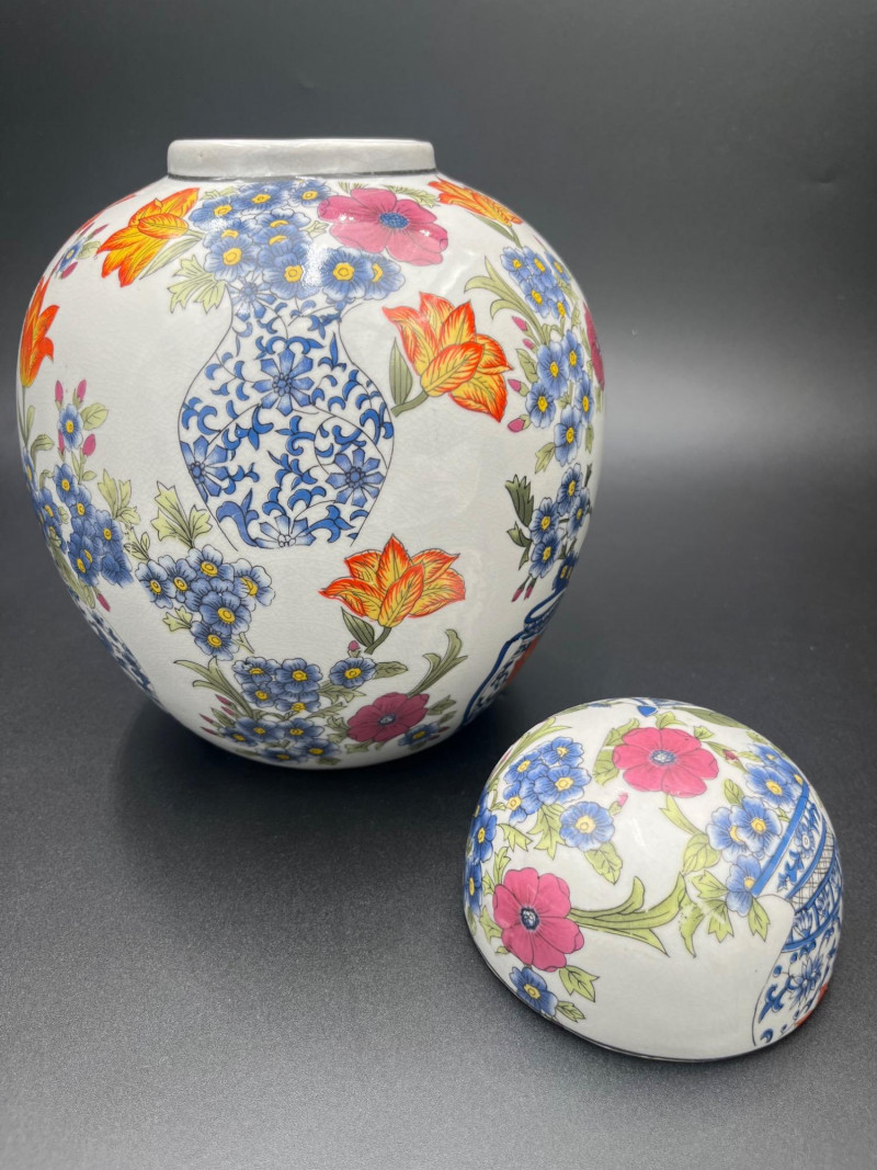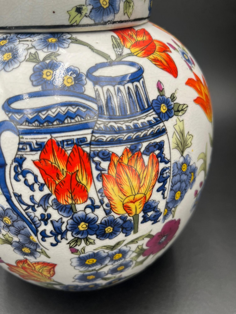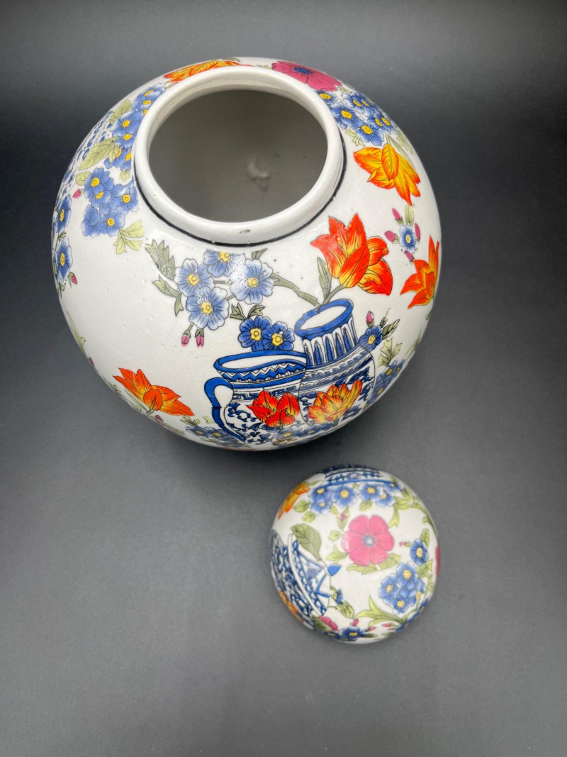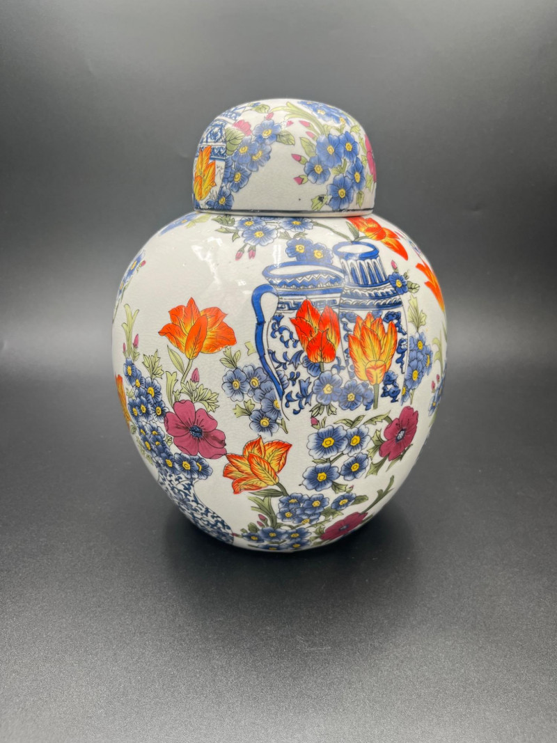 Vintage Lidded Ceramic Ginger Jar with Floral Design Vintage ceramic ginger jar with a fitted domed lid, decorated with a continuous motif of vessels, floral stems, and foliage in muted tones. The rounded body tapers gently toward the base, with a wide mouth that supports the lid securely. The design is evenly distributed across the jar and lid. The underside is stamped “Made in China.” Dimensions: