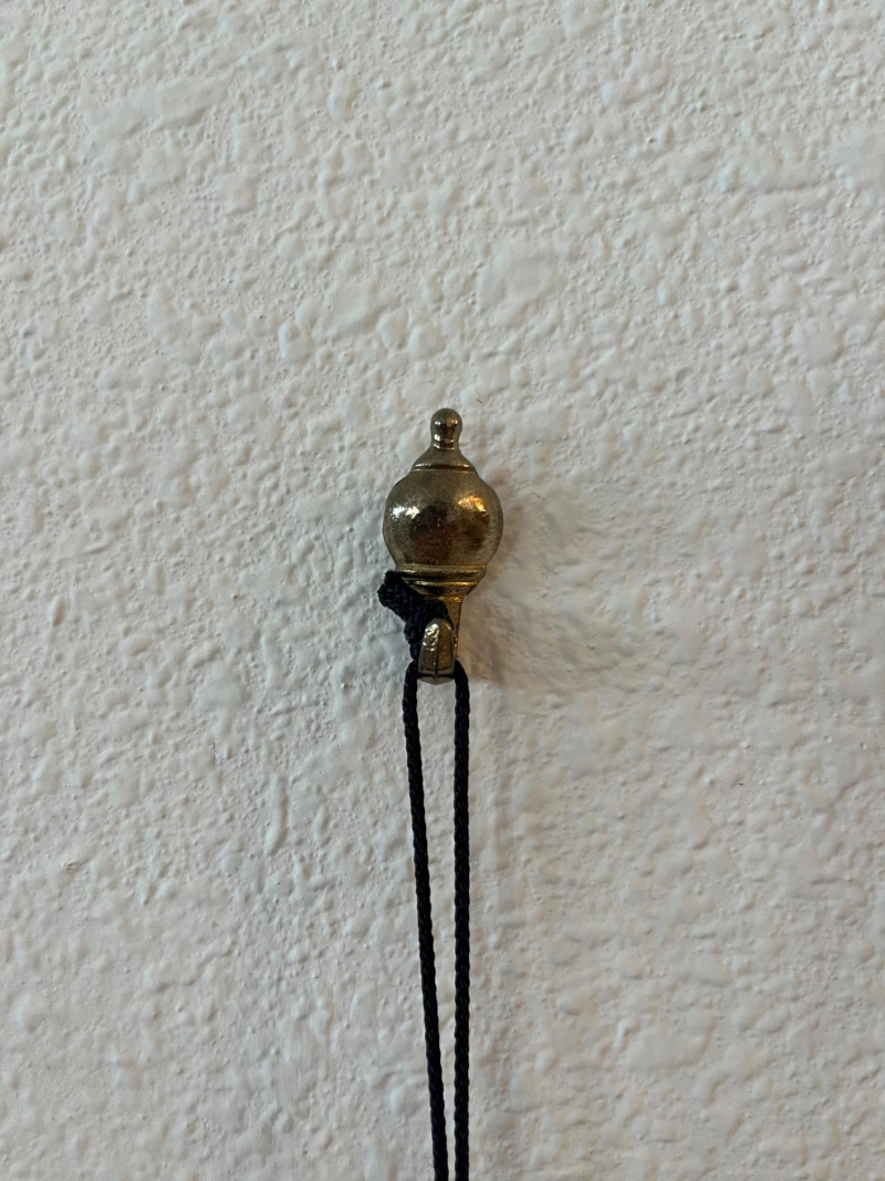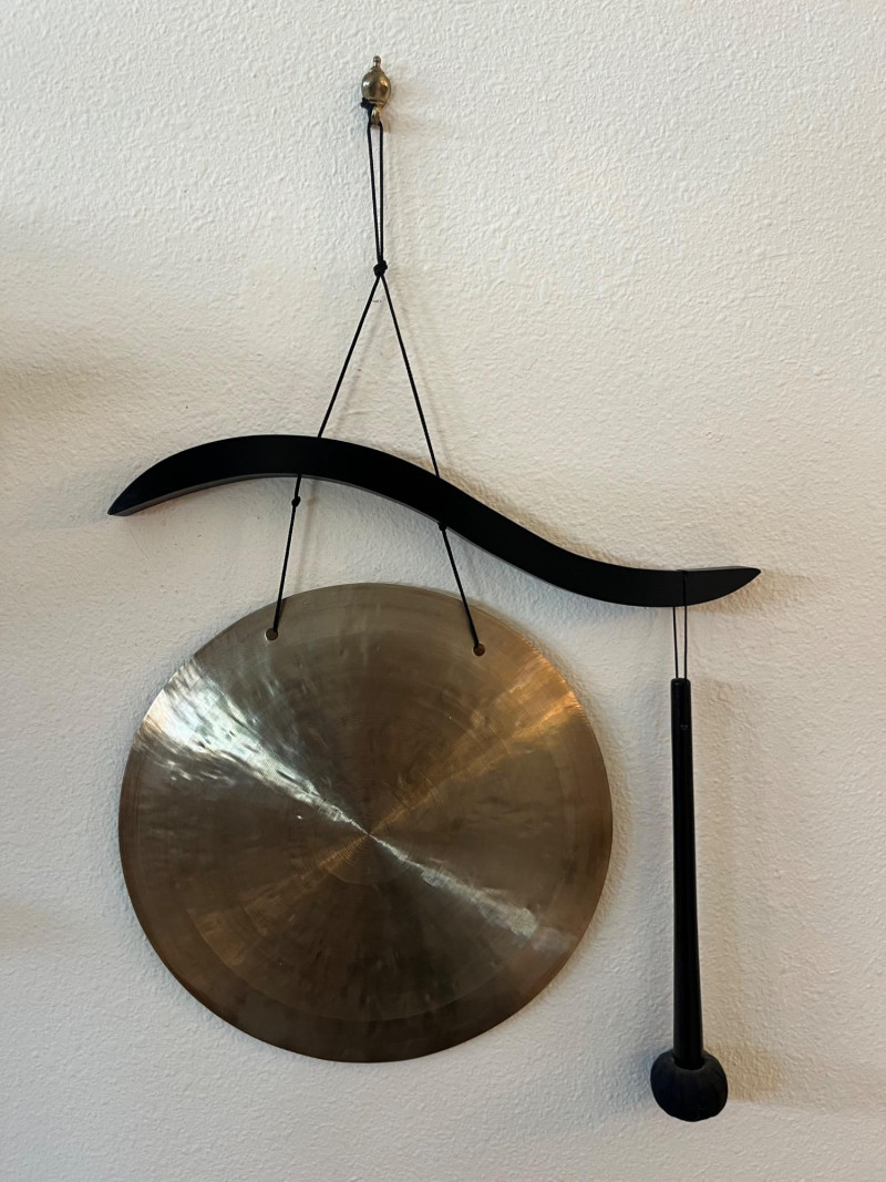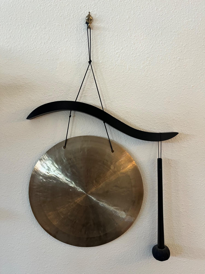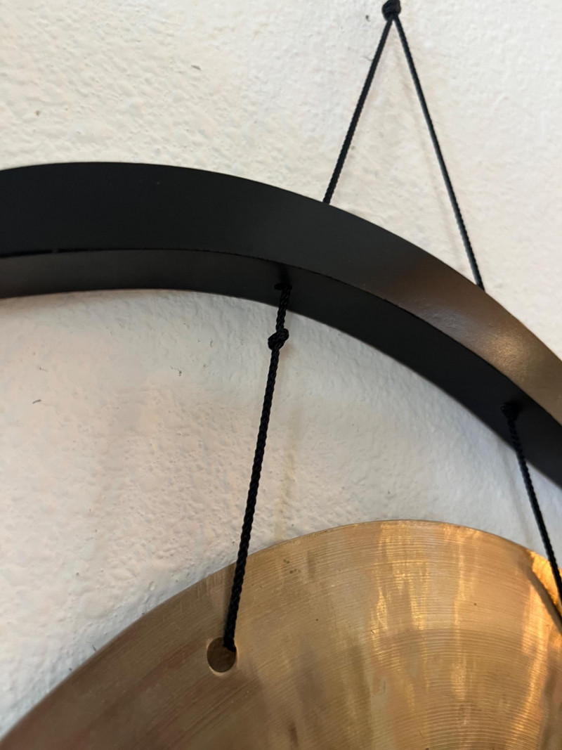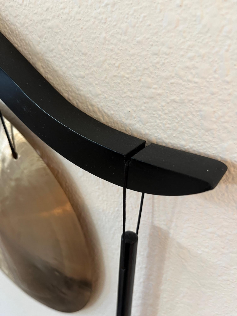 Woodstock Hanging Gong Metal gong suspended beneath a curved wooden frame, supported by two cords that converge at a single brass fixture. A slender striker hangs on a separate cord aligned vertically beside the gong. The piece is designed for wall display and sound resonance. Dimensions