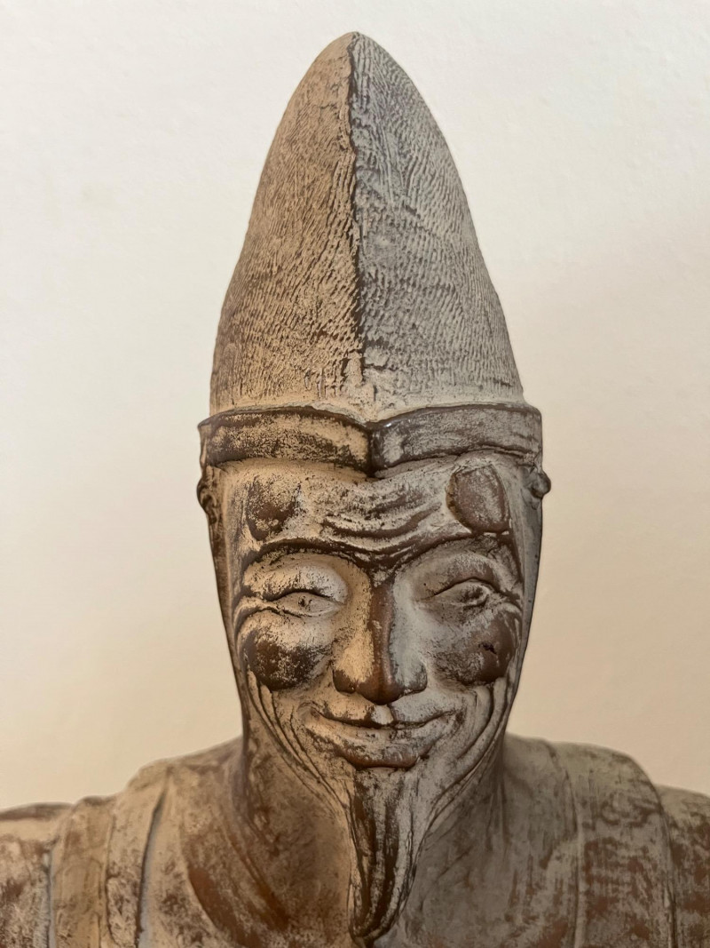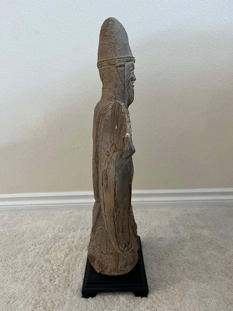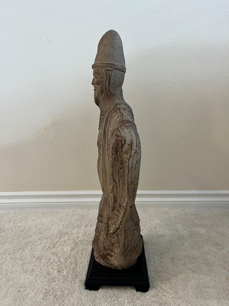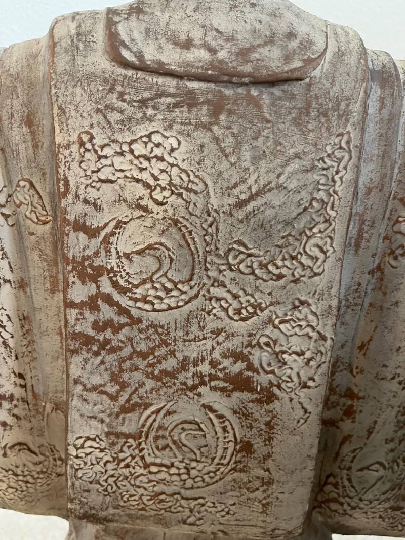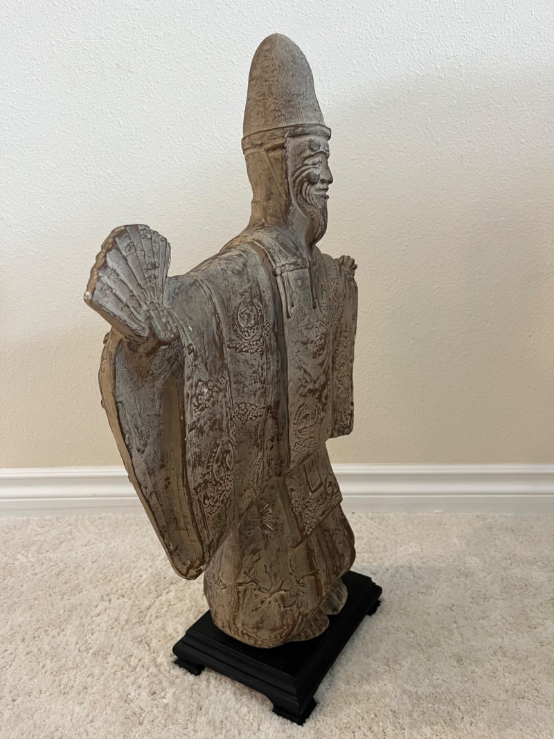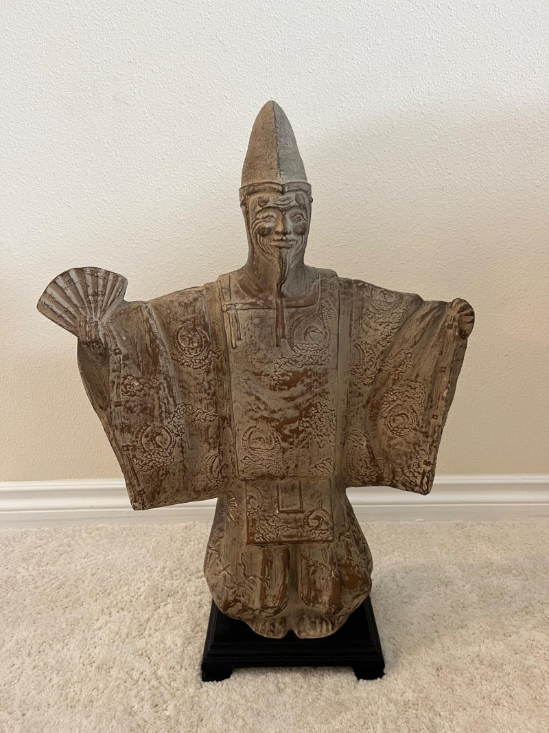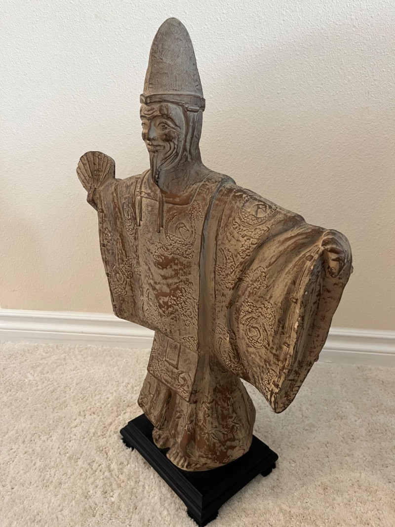 Austin Productions Sculpture "The Uesugi" 1981 A sculpted figure depicted in full robes with extended sleeves, holding a fan in the right hand and wearing a tall headdress. The surface is covered in detailed patterns throughout the garment. The figure stands with both feet visible beneath the hem and is set on a black base. The design and form are consistent with "The Uesugi," a piece produced by Austin Productions in 1981, possibly attributed to that maker. Unsure of the material. Dimensions: