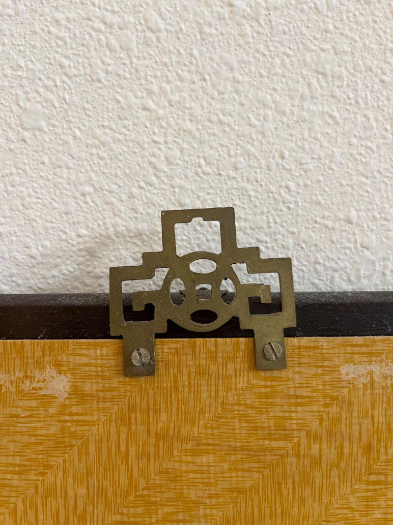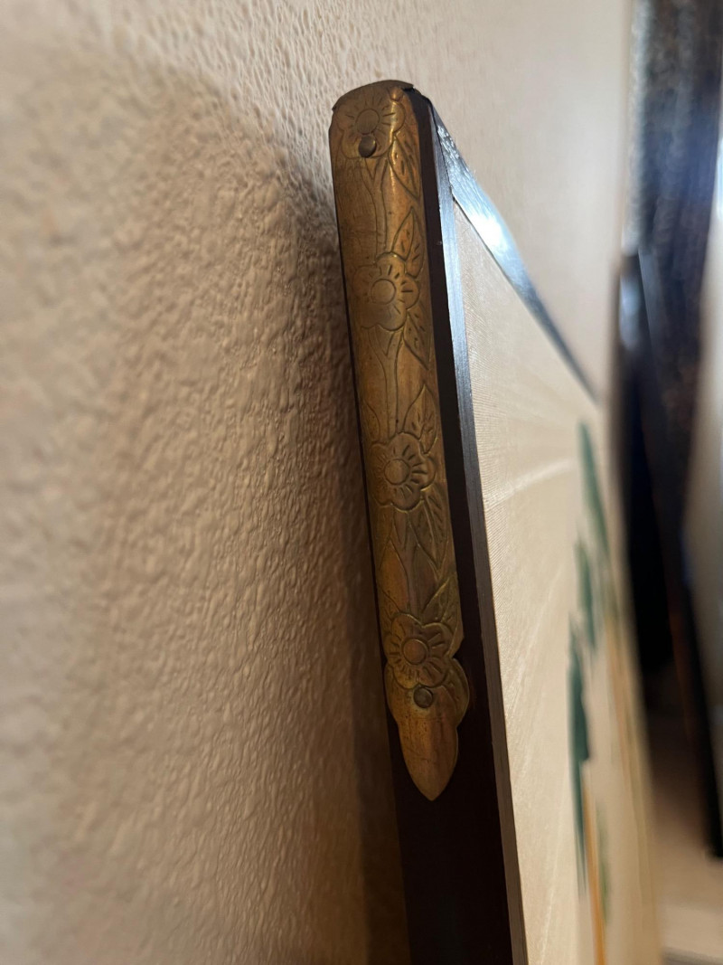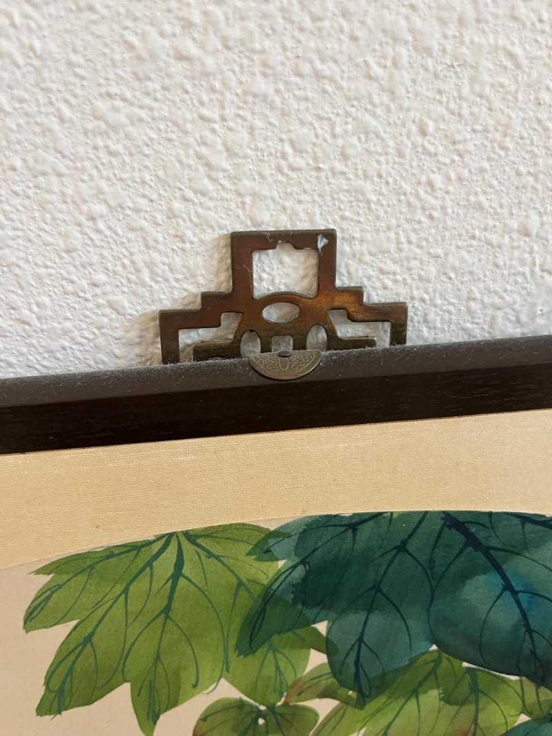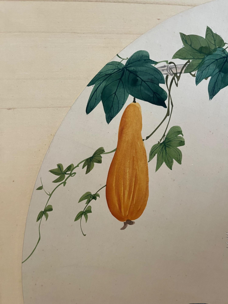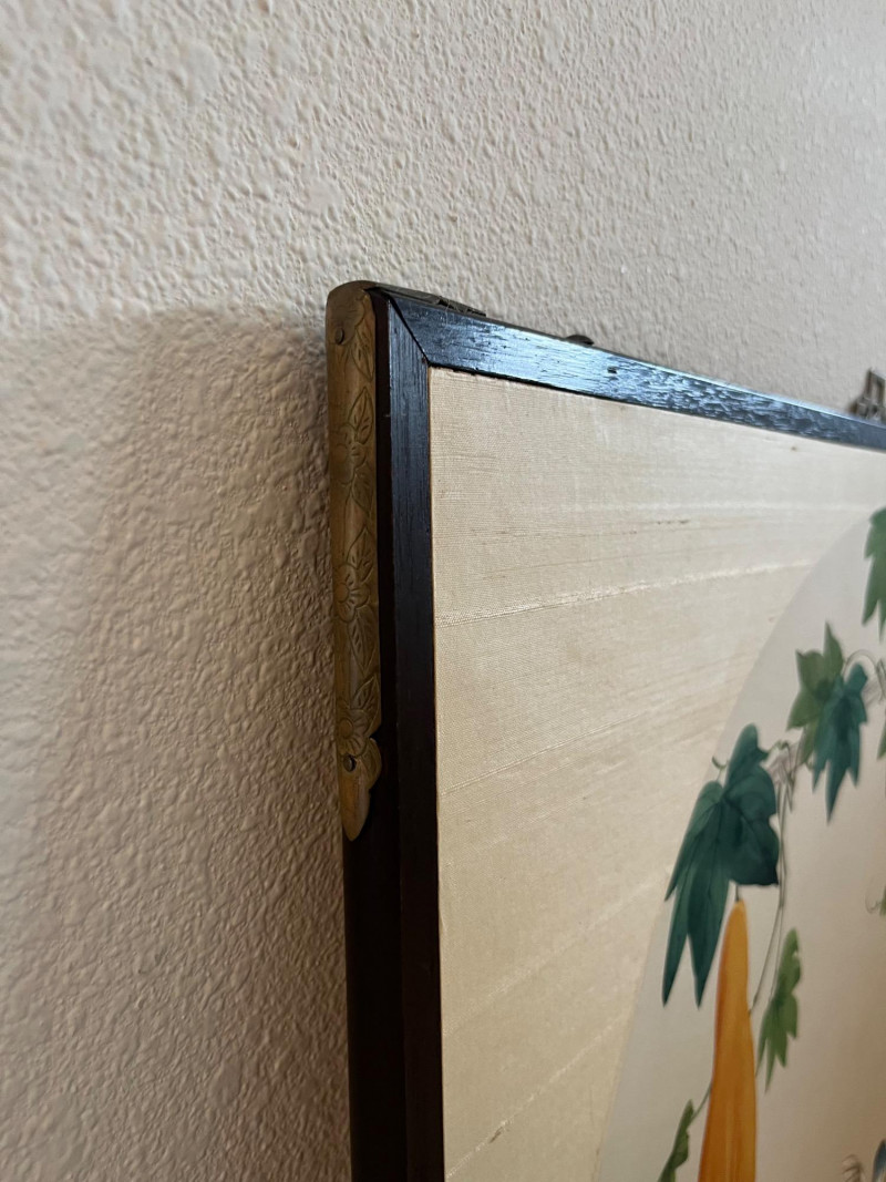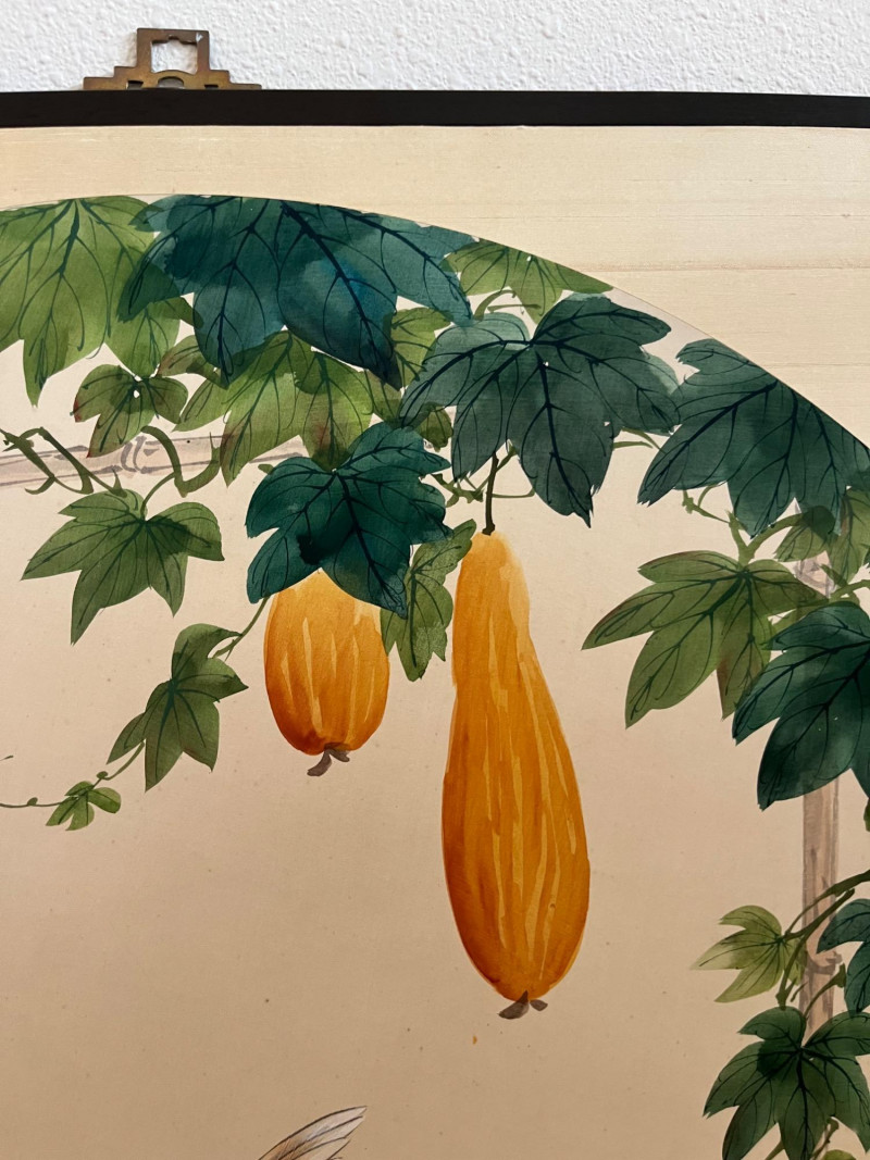 Framed Japanese Silk Painting – Birds, Gourds, and Vine Framed Japanese painting on silk in the style of kacho-ga, depicting two birds in flight beneath a hanging vine. The vine bears gourd-like fruits and broad leaves, extending from a tall, slender stalk. The composition is enclosed within a circular form against a plain ground. Metal hanging hardware is attached to the top, and the frame is bordered in dark wood with brass corner fittings. Dimensions:
