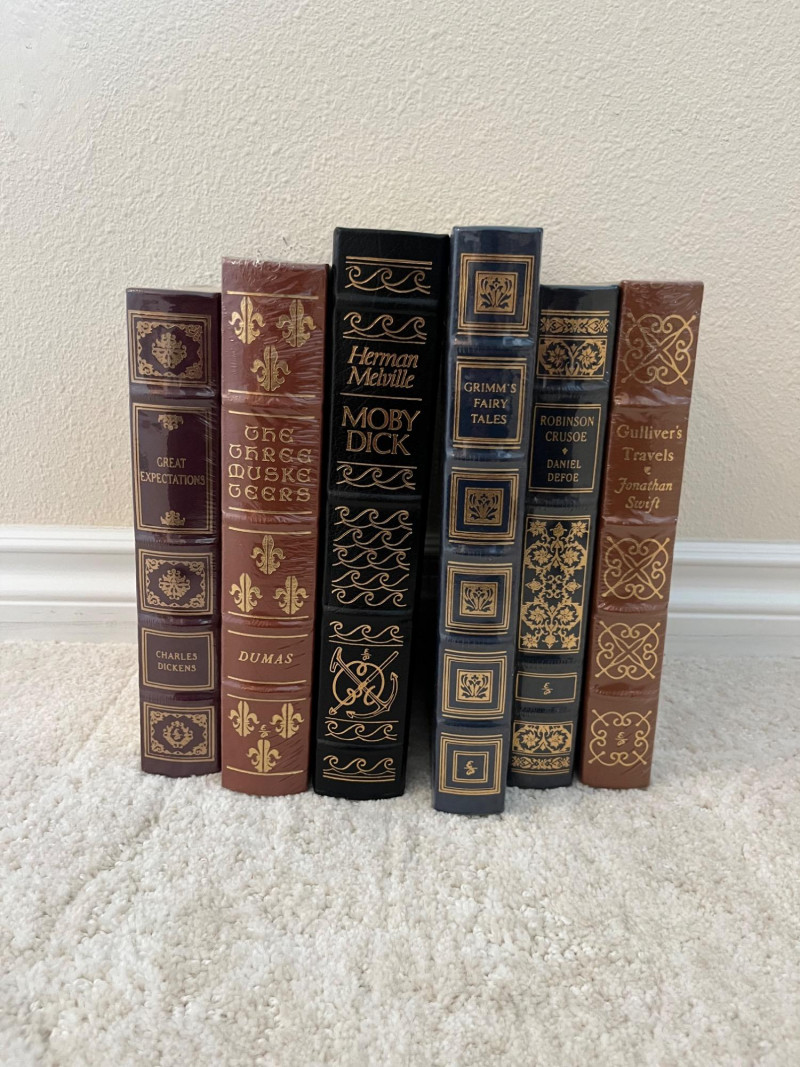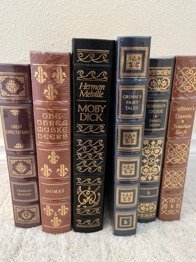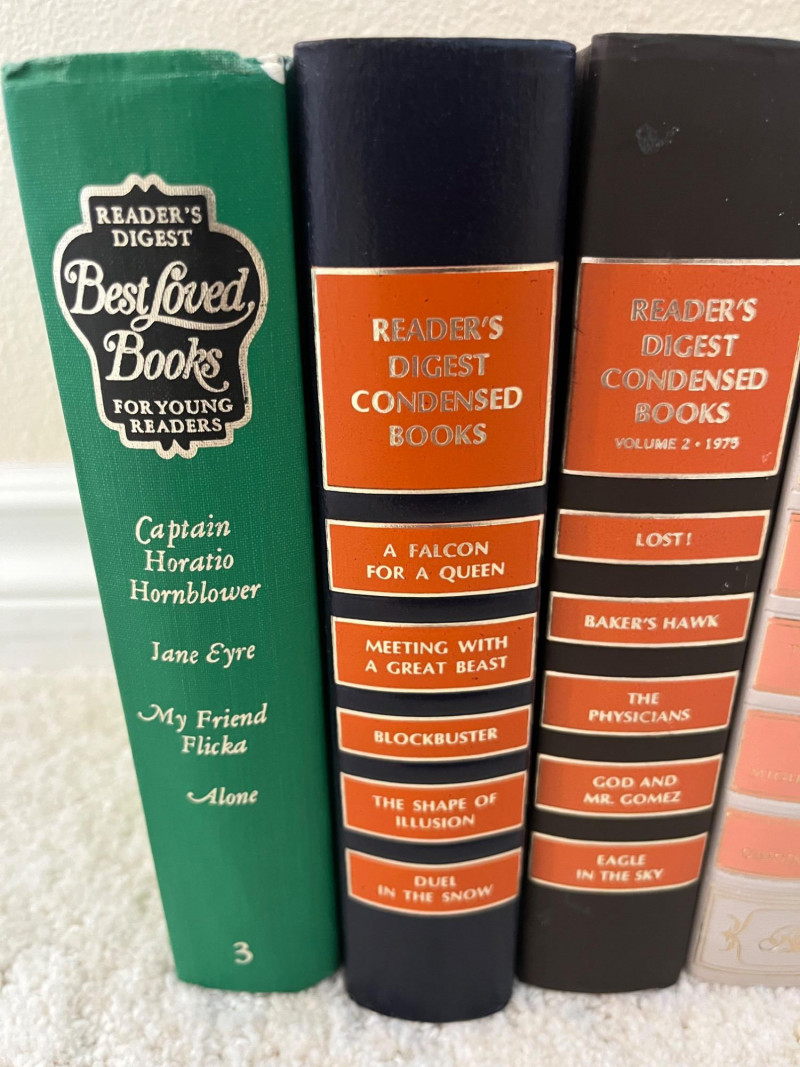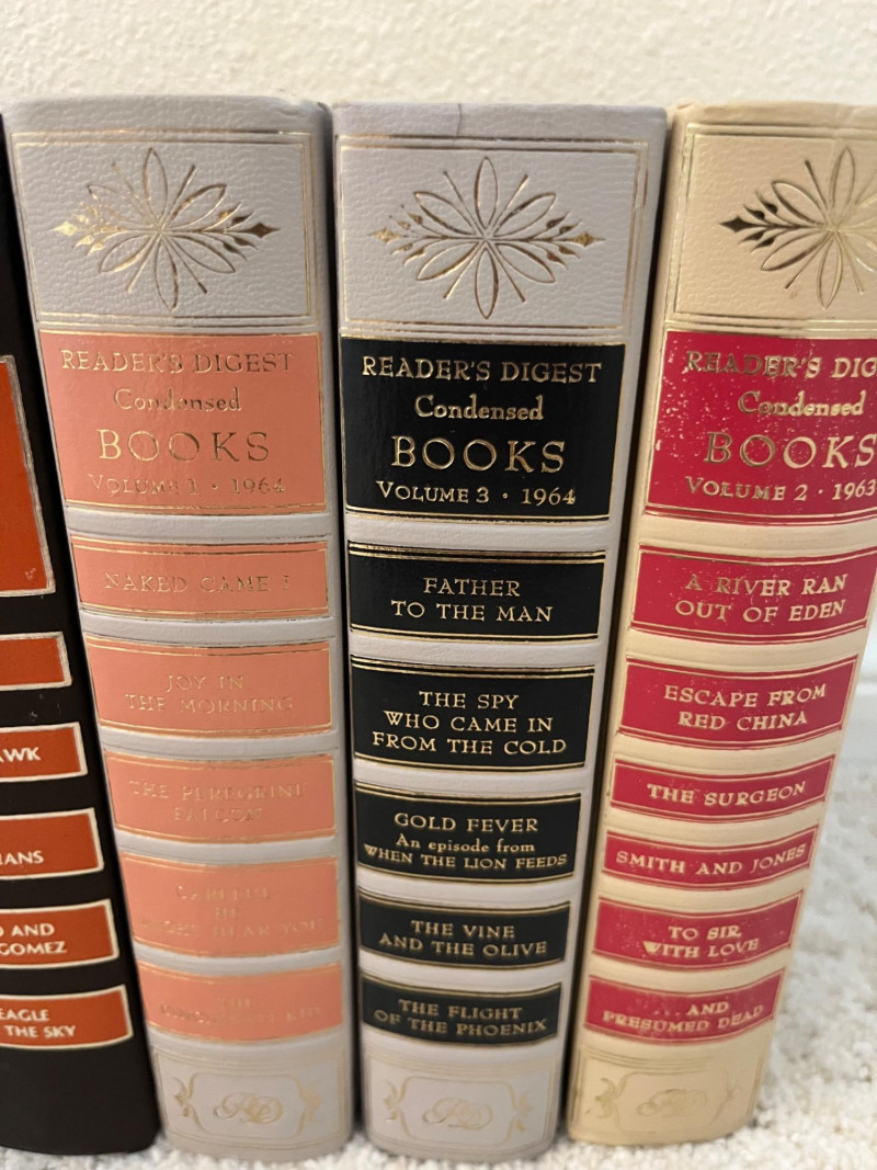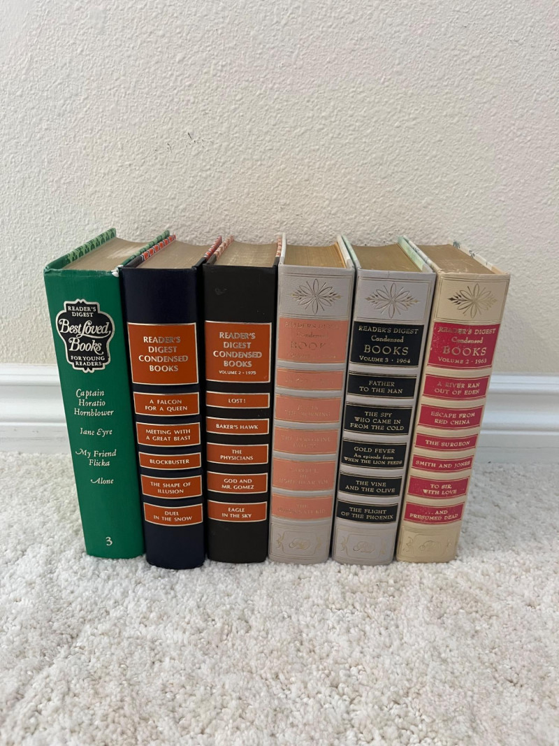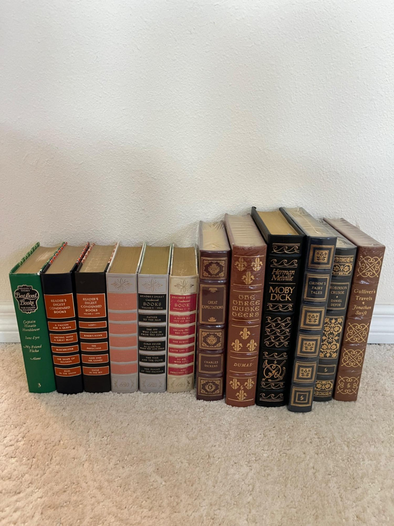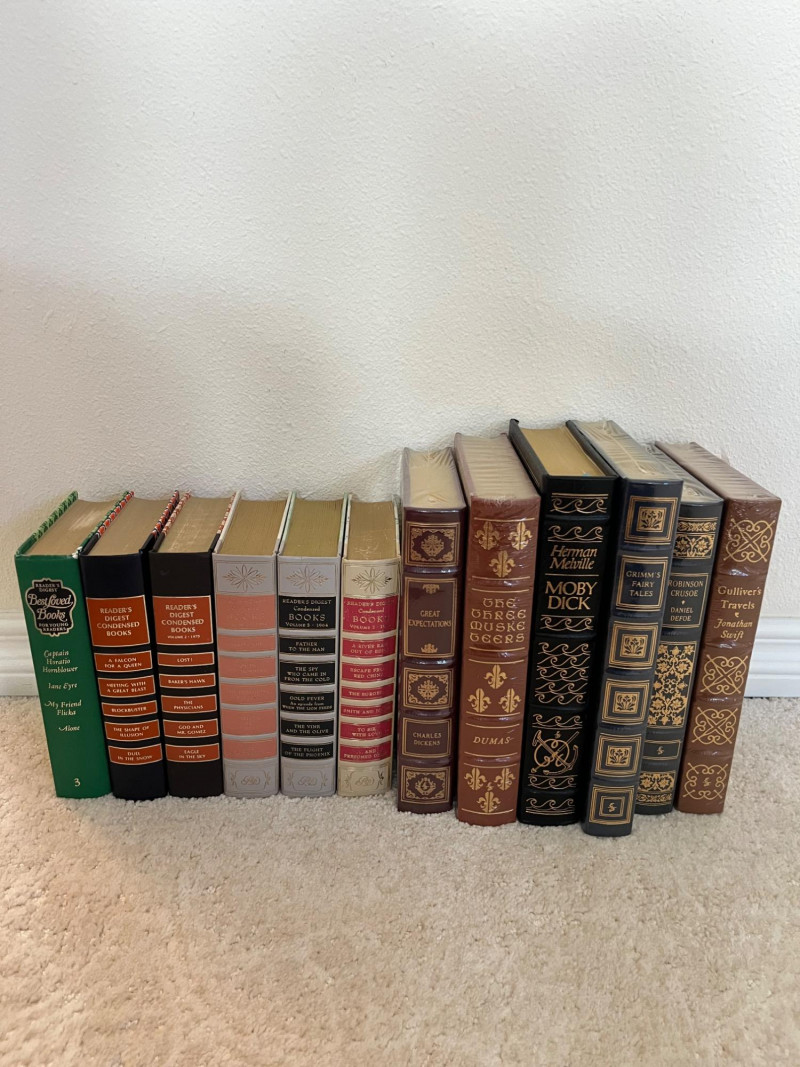 Assortment of Hardcover Literary and Condensed Books A collection of twelve hardbound volumes featuring a mix of Reader’s Digest Condensed Books and classic literary works. The Reader’s Digest volumes contain curated selections of popular fiction from the mid-20th century, while the remaining titles include works by Charles Dickens, Alexandre Dumas, Herman Melville, Jonathan Swift, and others, presented in decorative bindings. Cover patterns, spine designs, and gilt embellishments vary across the set. Dimensions: Reader’s Digest books (7 pcs): approx. 7.75" W x 5.5" D x ~9.5" H each Literature volumes (5 pcs): heights range from 9.5" to 10.5", widths from 6.5" to 7.25"
