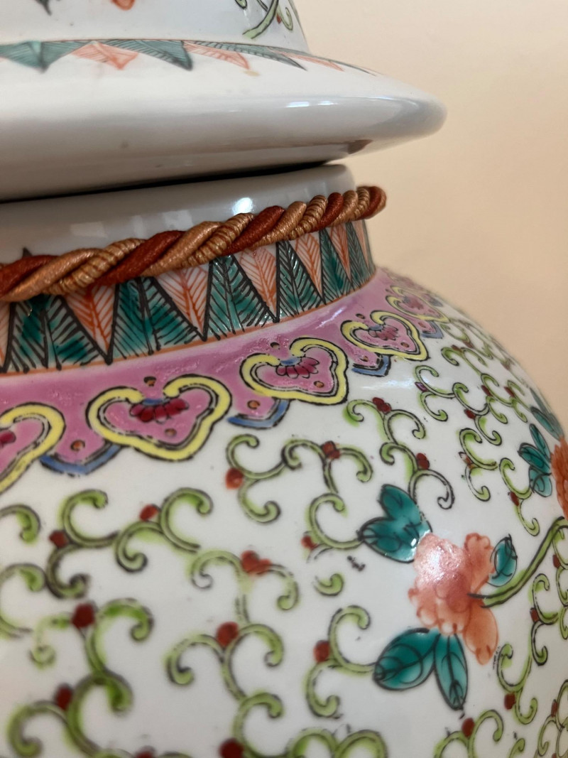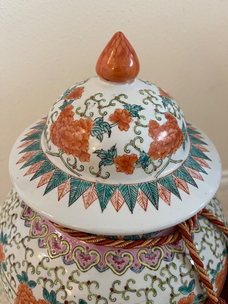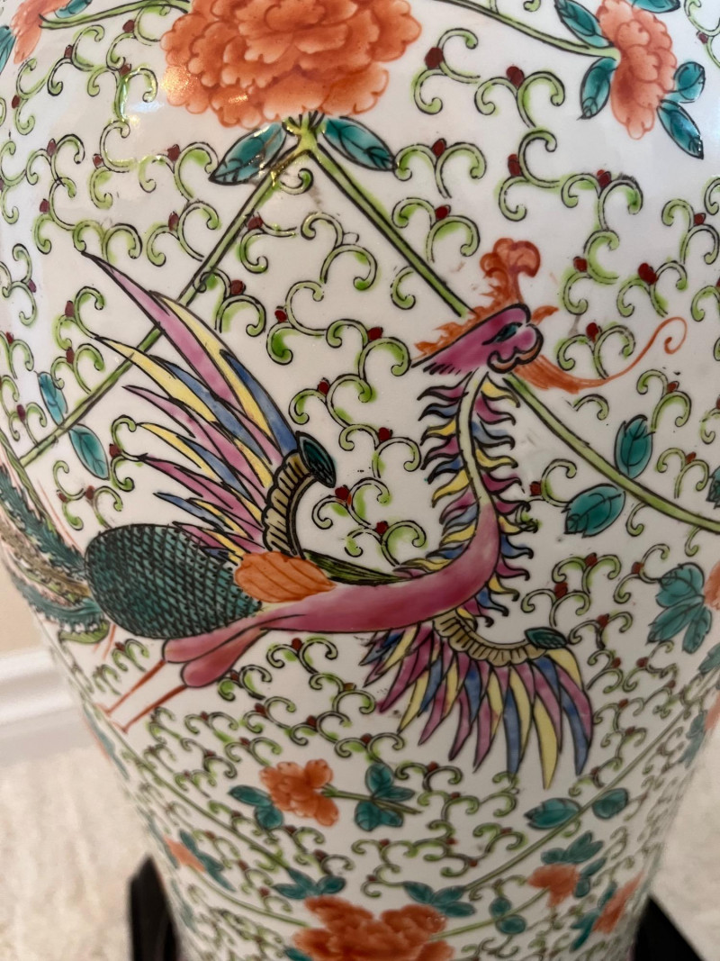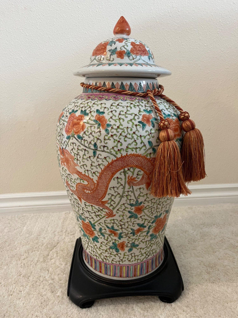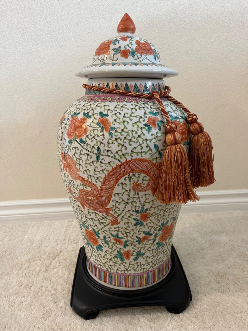 Vintage Chinese Lidded Porcelain Jar with Dragon and Phoenix Porcelain jar with lid, decorated in the style of Chinese famille rose. The surface features continuous painted motifs of a five-clawed dragon, phoenixes, peonies, and scrolling foliage. The neck is wrapped with a braided cord and tassels. A pointed finial crowns the lid, which echoes the floral and geometric elements. The jar rests on a detachable wooden stand. Dimensions: