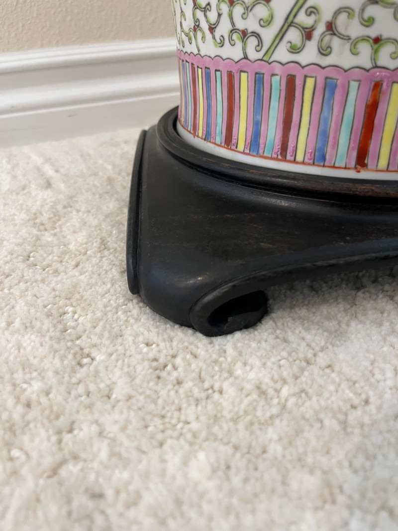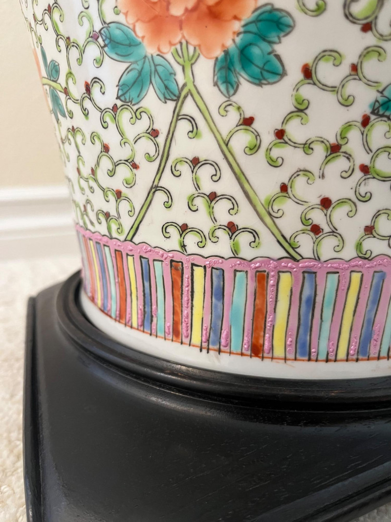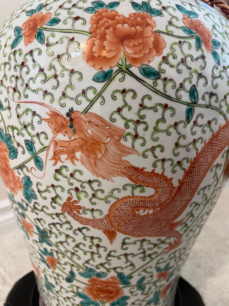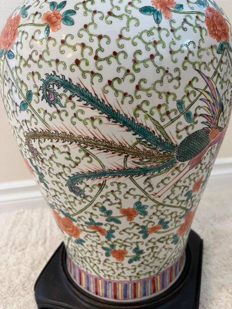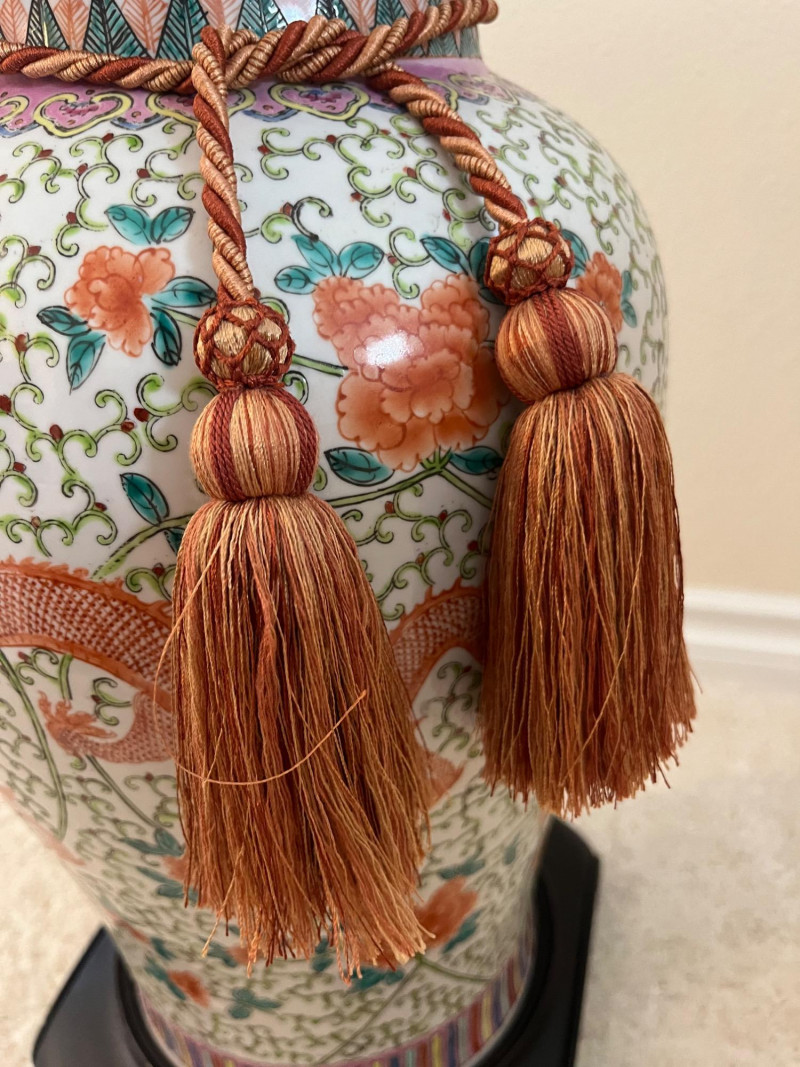 Vintage Chinese Lidded Porcelain Jar with Dragon and Phoenix Porcelain jar with lid, decorated in the style of Chinese famille rose. The surface features continuous painted motifs of a five-clawed dragon, phoenixes, peonies, and scrolling foliage. The neck is wrapped with a braided cord and tassels. A pointed finial crowns the lid, which echoes the floral and geometric elements. The jar rests on a detachable wooden stand. Dimensions:
